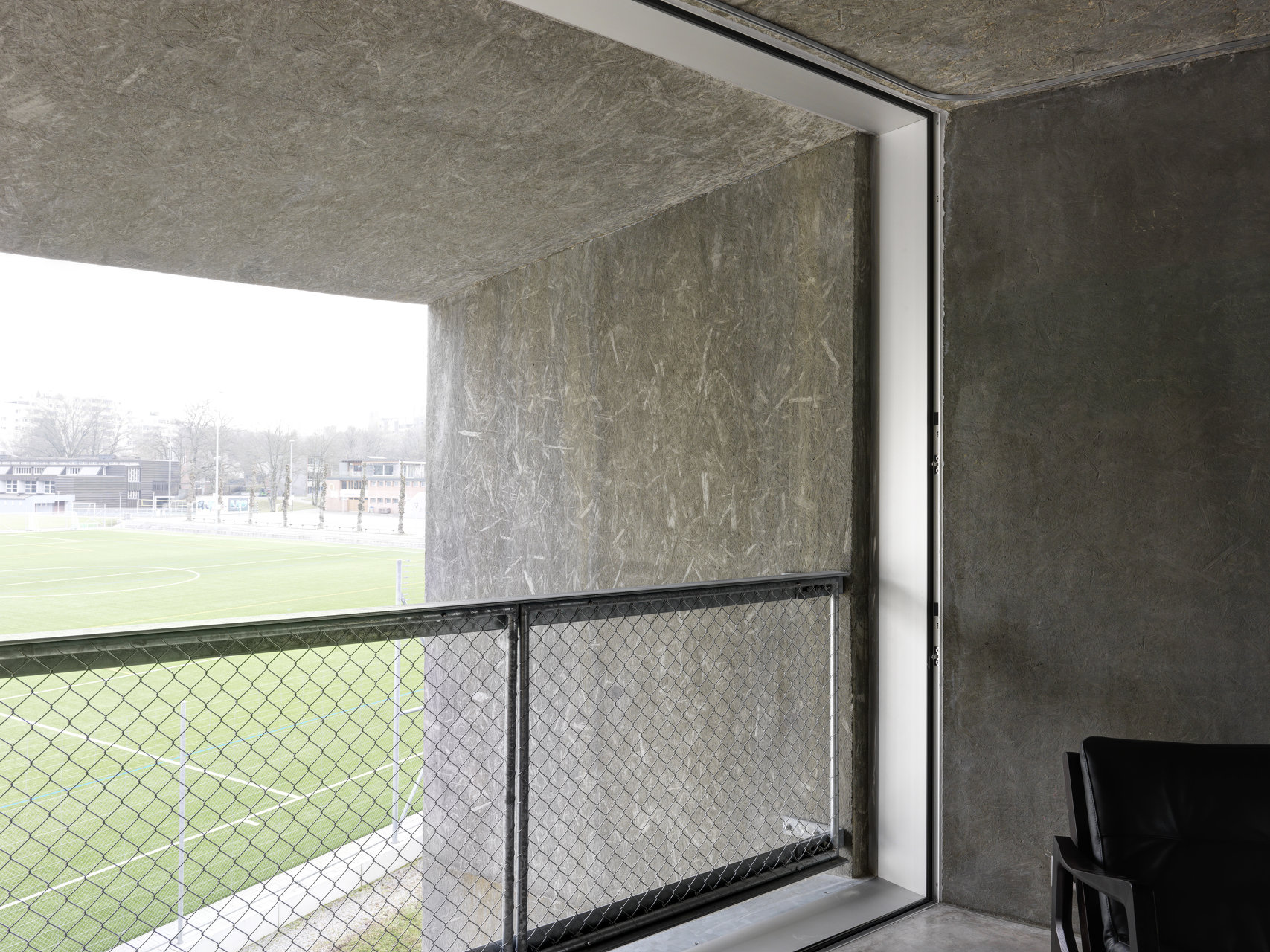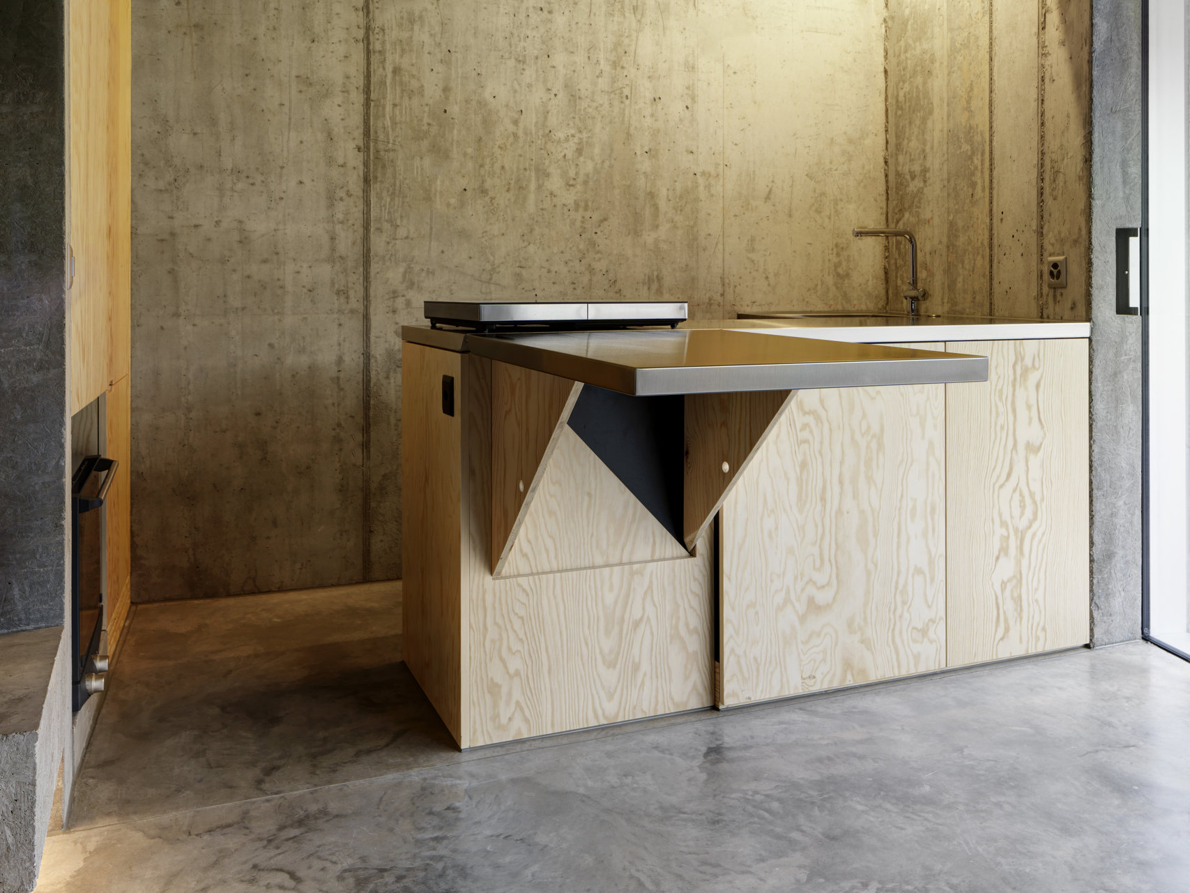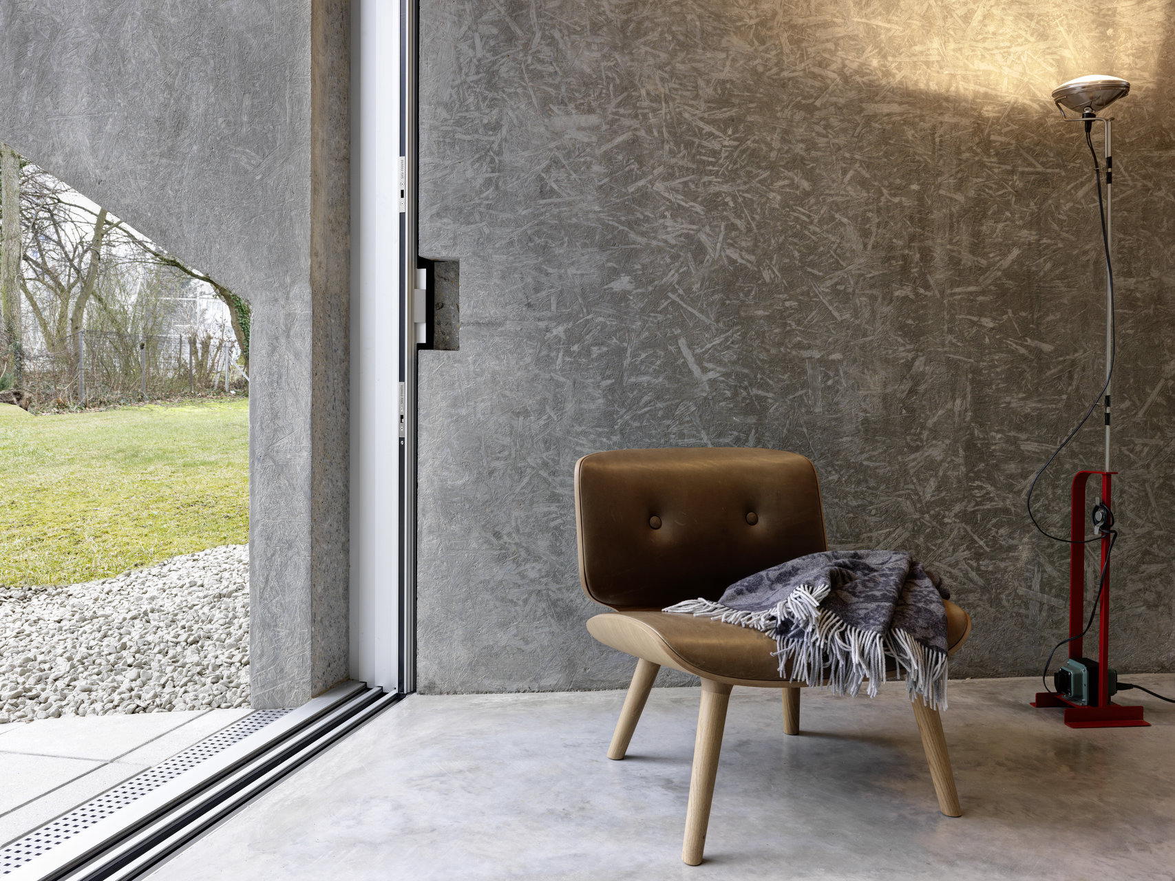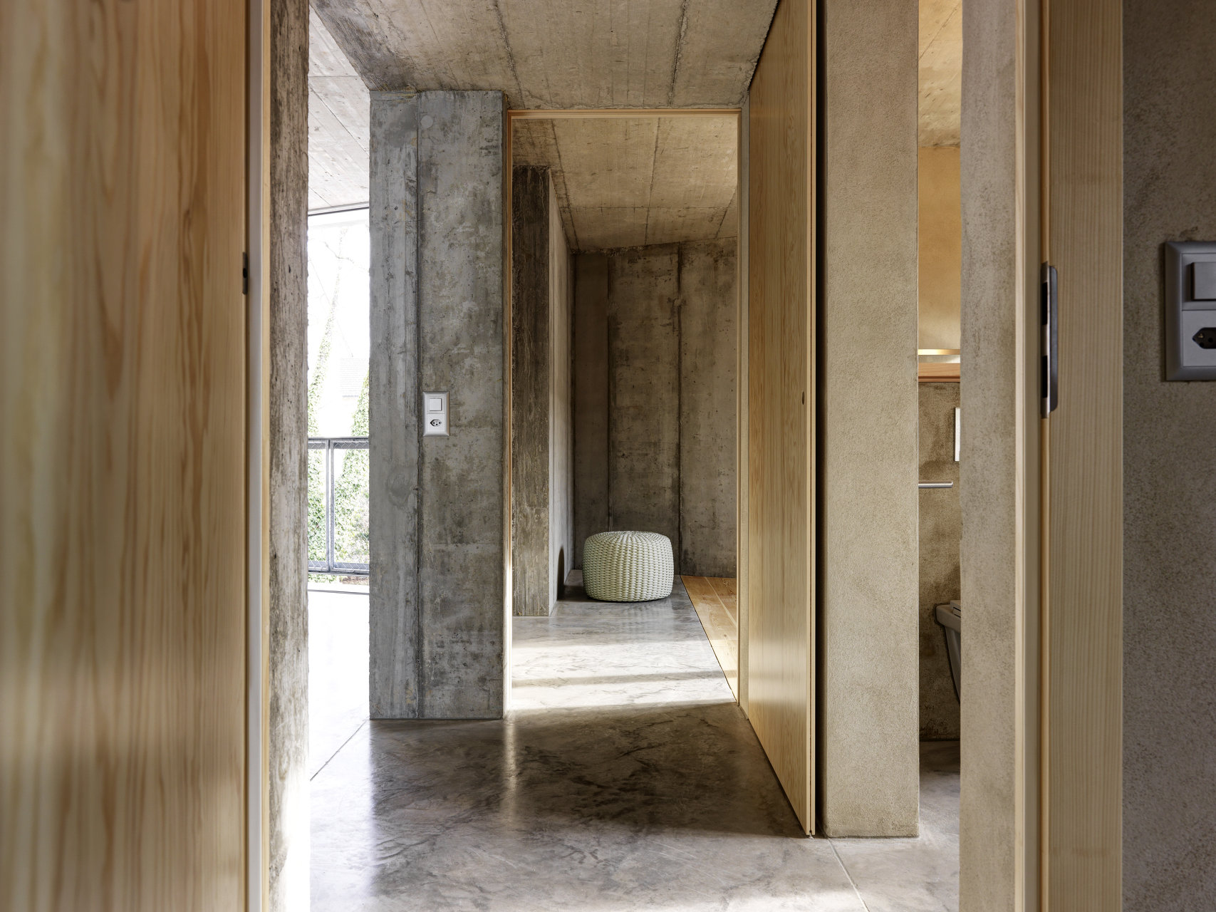 Die Peripherie des Wohnraums wird topographisch bearbeitet und macht die raumbegrenzenden Elemente kommunikativ. Daher werden die raumdefinierenden Elemente nicht als Trennwände empfunden, sondern als kommunikative Protagonisten. Der Mensch wird in die Topographie der Masse mit einbezogen. Dies umfasst Programme wie Garderoben, Wohnzimmerbank bis zur Küche ... Das Badezimmer der 4½-Zimmer-Wohnung ist durch eine Schiebetür vom Gemeinschaftsraum getrennt, die den Boden nie berührt. Der Raum fließt als Kontinuum weiter – und erzeugt gleichzeitig Intimität. Der Eingang zu jeder Wohnung wird von einem massiven Betonunterzug komprimiert und damit der Moment des Eintritts erfasst. Die Betonbank, die aus der Badezimmerwand 'herauswächst‘, schafft unmittelbar am Eingang mit der Badschiebetür einen Moment des Übergangs. Der Betonboden fließt als Fragment des Gemeinschaftlichen in alle Schlafzimmer, im Schlafzimmer iniziiert die Holzfläche am Boden eine neue Ebene der Intimität. (Text: Architekt)