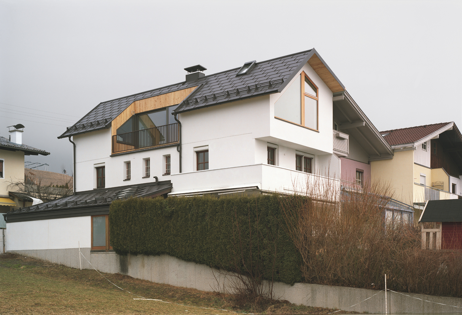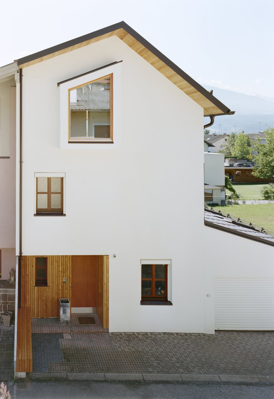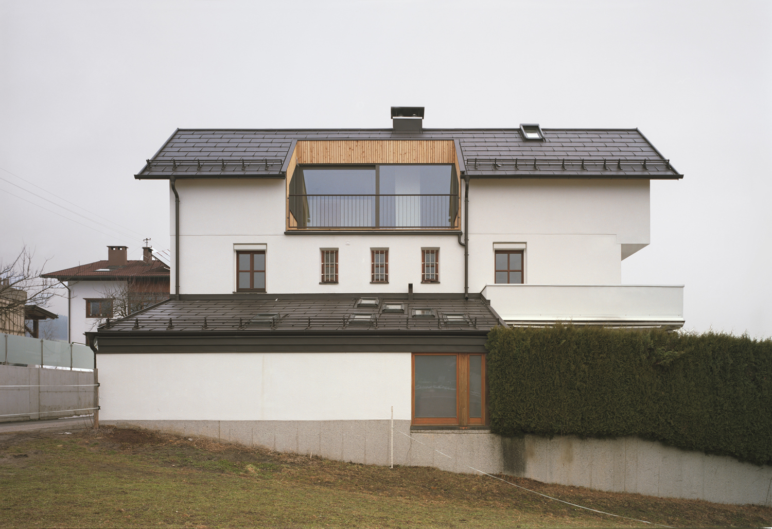 Das gesamte Haus wird in seiner Erscheinung durch die neue weiße Putzfassade und die Dacheindeckung aus beschichtetem Blech vereinheitlicht.