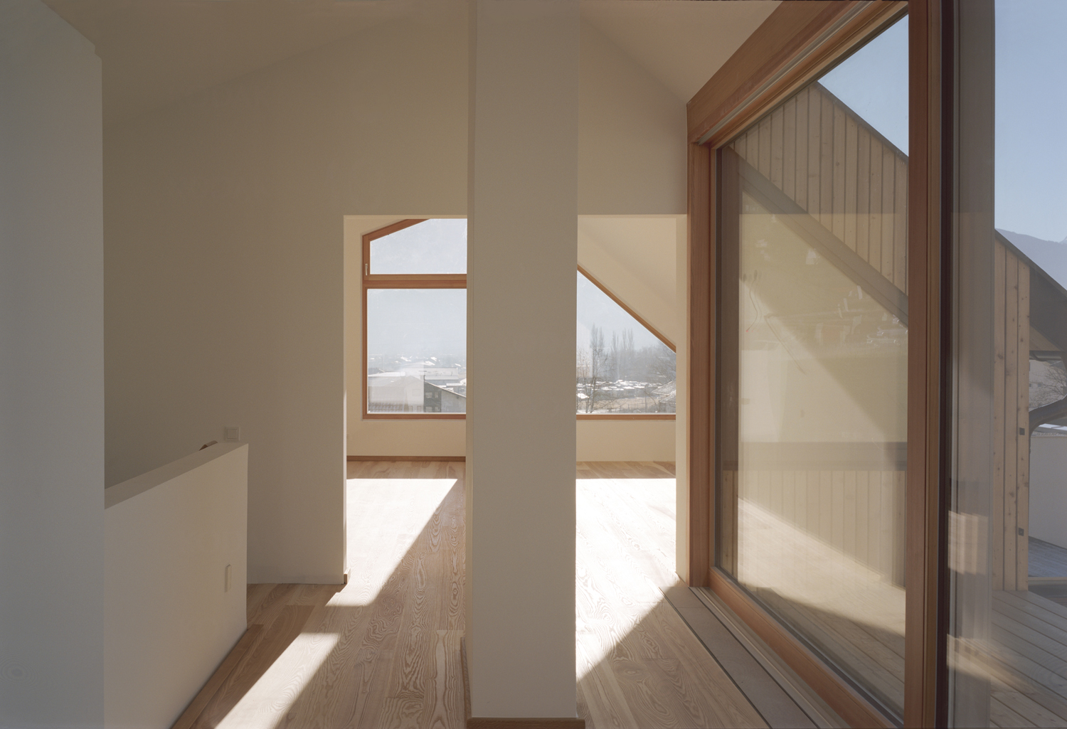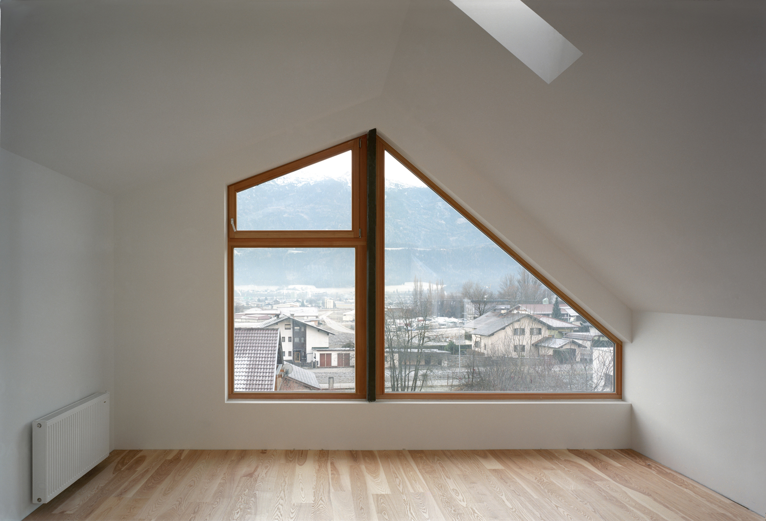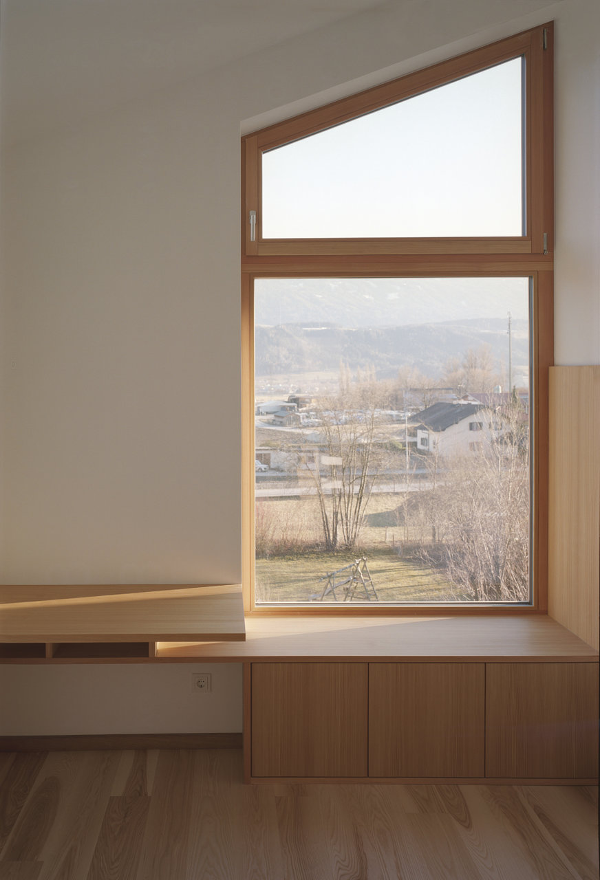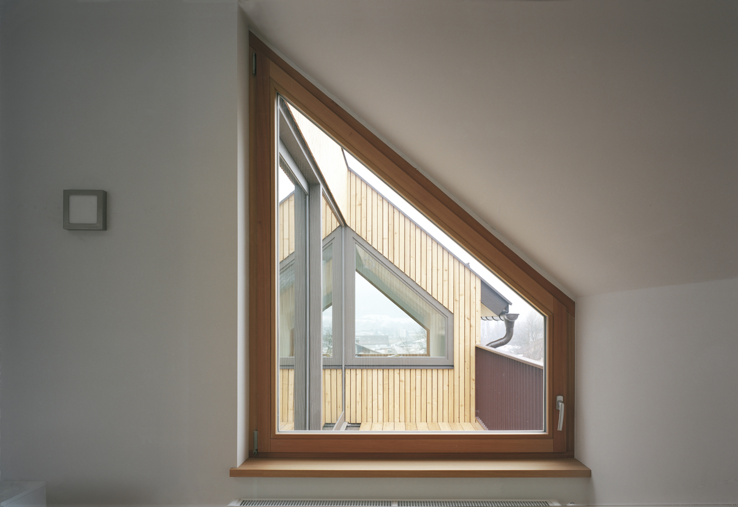Im Inneren schaffen großzügige Verglasungen und Raumhöhen eine lichtdurchflutete Wohnatmosphäre mit besten Ausblicken nach Süden, Westen und Norden. Individuell geplante Einbaumöbel und Sitzfenster optimieren die Ausnutzung der ungewöhnlichen Raumgeometrien. (Text: Architektin)
