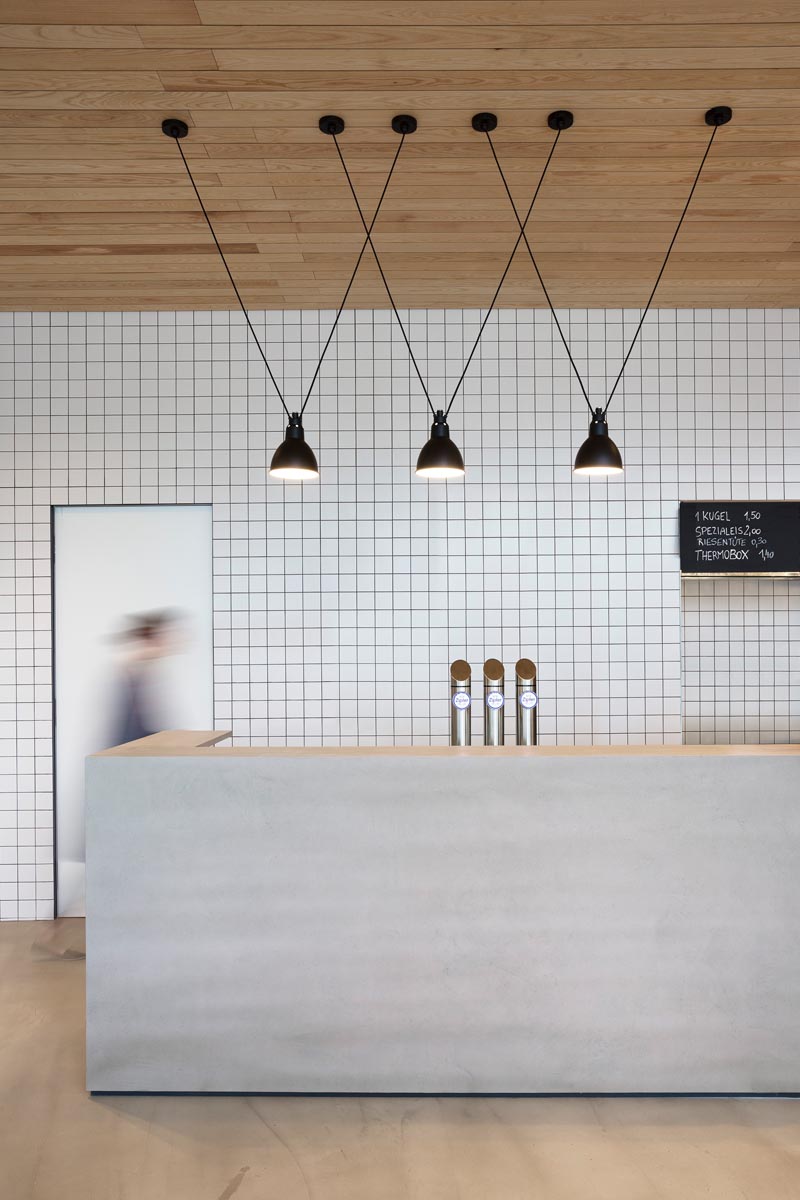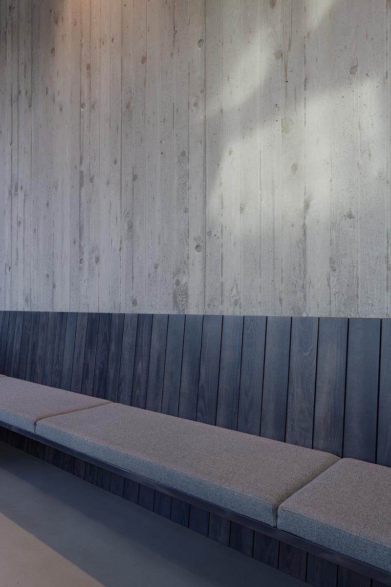 So werden Passanten in einem logischen Bewegungsablauf in ein Haus gezogen, das als gebaute Interpretation des Außenraums dessen Qualitäten erst so richtig zur Geltung bringt. Der Innenraum des Eiscafés ist in einen Bereich für den Gassenverkauf und in das Café geteilt, die beide zur Promenade hin orientiert sind. Dahinter befinden sich die Sanitäranlagen, der Abgang in den Keller und die Küche. Während der Raum hinter dem einfachen grauen Verkaufspult mit kleinformatigen weißen Wandfliesen und einigen sparsam eingesetzten schwarzen Elementen von Sauberkeit und den italienischen Eisdielen der Kindheit erzählen, spricht das Café eine andere Sprache. Eine Sitzbank, den gesamten Raum in sanfter Kurve umfassend, setzt jenes Zeichen, das für den Befund von „Gemütlichkeit“ so wichtig ist. Das Graublau der lasierten Holzlatten ihrer Rückwand ist wie die Farbe der Polsterung dem Farbspektrum des Sees entlehnt. Die Latten setzen die mit gehobelten Brettern geschalte Betonwand fort und unterstreichen so die „natürliche“ Anmutung dieses außerhalb der Architektenschaft häufig als „kalt“ empfundenen Baustoffes. Die Deckenuntersicht aus hellen Eschenholzlatten wiederum greift das Motiv der Bootsstege auf und belegt mit ihrem im Bereich des Dachvorsprungs ungestört in den Außenraum geführten Fugenbild, wie sorgsam Moser und Hager Architekten dieses Gebäude detailliert haben.