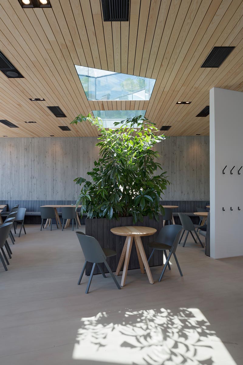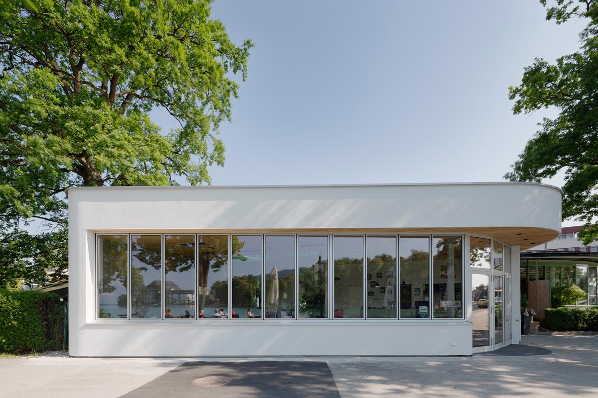 Auf der Suche nach einer angemessenen Formensprache für den eingeschoßigen Pavillon haben Anna Moser und Michael Hager mit ihrem Team auf das Naheliegende zurückgegriffen: den See. Wer will, kann sogar die Geometrie des Grundrisses mit den ausgerundeten Ecken als Analogie zu seinen Buchten sehen. Das Café schließt mit seiner Nordseite unmittelbar an ein Blumengeschäft, das der erwähnten Gabelung von Atterseestraße und Promenade städtebaulich nachvollziehbar einen halbkreisförmigen Vorbau zuwendet. Dieses Motiv der Rundung haben Moser und Hager Architekten mit der parallel zur Promenade verlaufenden südlichen Außenwand des Cafés aufgegriffen, ein wenig deutlicher im Osten, mit kleinerem Radius an der südwestlichen Ecke des Gebäudes. Der Eingang in das Café liegt an der im Osten weiter werdenden Promenade. Er wird durch das Zurückschwingen der Wand hinter die Kante des Dachs betont und gleichzeitig vor der Witterung geschützt.