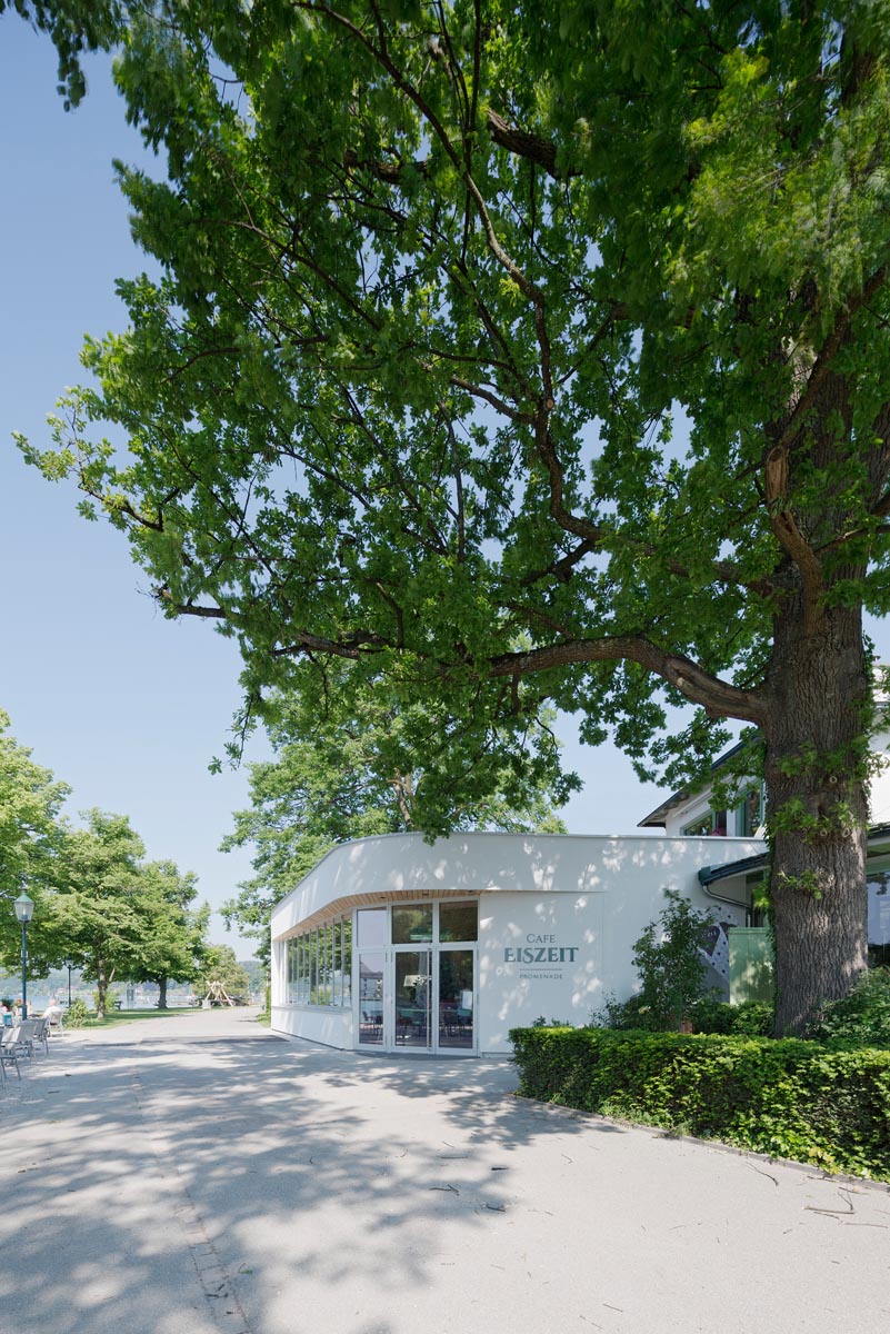 Es geht nicht darum zu sagen: „Das Boot“ – diesfalls das Seeufer – „ist voll“, obwohl diese Aussage nicht übertrieben wäre. In jenem Zwickel am Nordufer des Sees etwa, wo unweit des Strandbades Seewalchen die Promenade in die Bundesstraße 151 mündet, hätte man die Existenz eines freien Bauplatzes nicht vermutet. Wohlgemerkt: Das hier errichtete Objekt, ein Café namens „Eiszeit“, liegt angesichts seiner Größe für echte Investoren weit unter der Wahrnehmungsschwelle. Dennoch hat sein Bau eine Veränderung bewirkt. Es ist den jungen, in Linz ansässigen Moser und Hager Architekten zu verdanken, dass diese für den Ort gut ausgegangen ist.