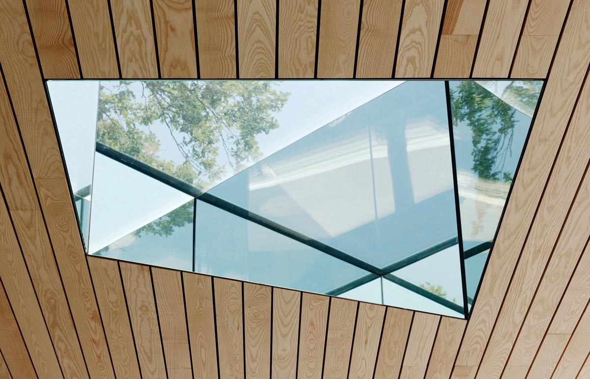Zwei verspiegelte Lichtbrunnen öffnen die Decke des Cafés zu den Kronen der mächtigen, die Promenade säumenden Bäume und spenden der Zimmerpflanze das nötige Licht. Im Süden weitet sich der Raum über seine vom Eingang bis zur westlichen Außenwand geführten Faltschiebefenster hinaus zum See. In der nördlichen Nische aber haben Moser und Hager Architekten die Wand über der Sitzbank mit Streifen aus Spiegelglas verkleidet. Hier ist er wieder, der Attersee: die Natur und was wir Menschen daraus machen, im wechselnden Licht, gebrochen durch Hunderte von Kanten, ein fragiler, ein bleibender Wert.