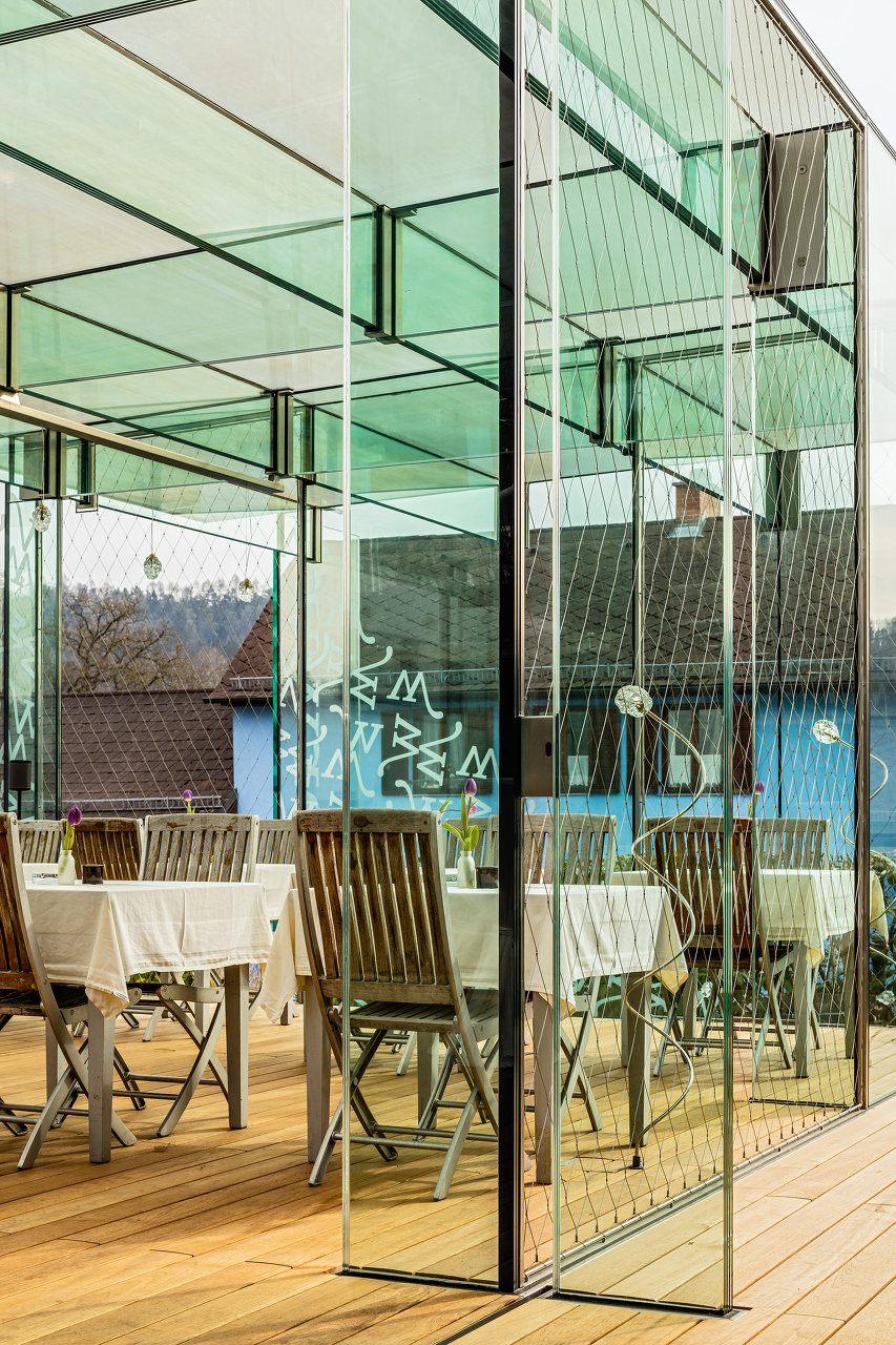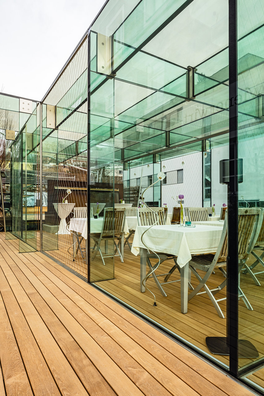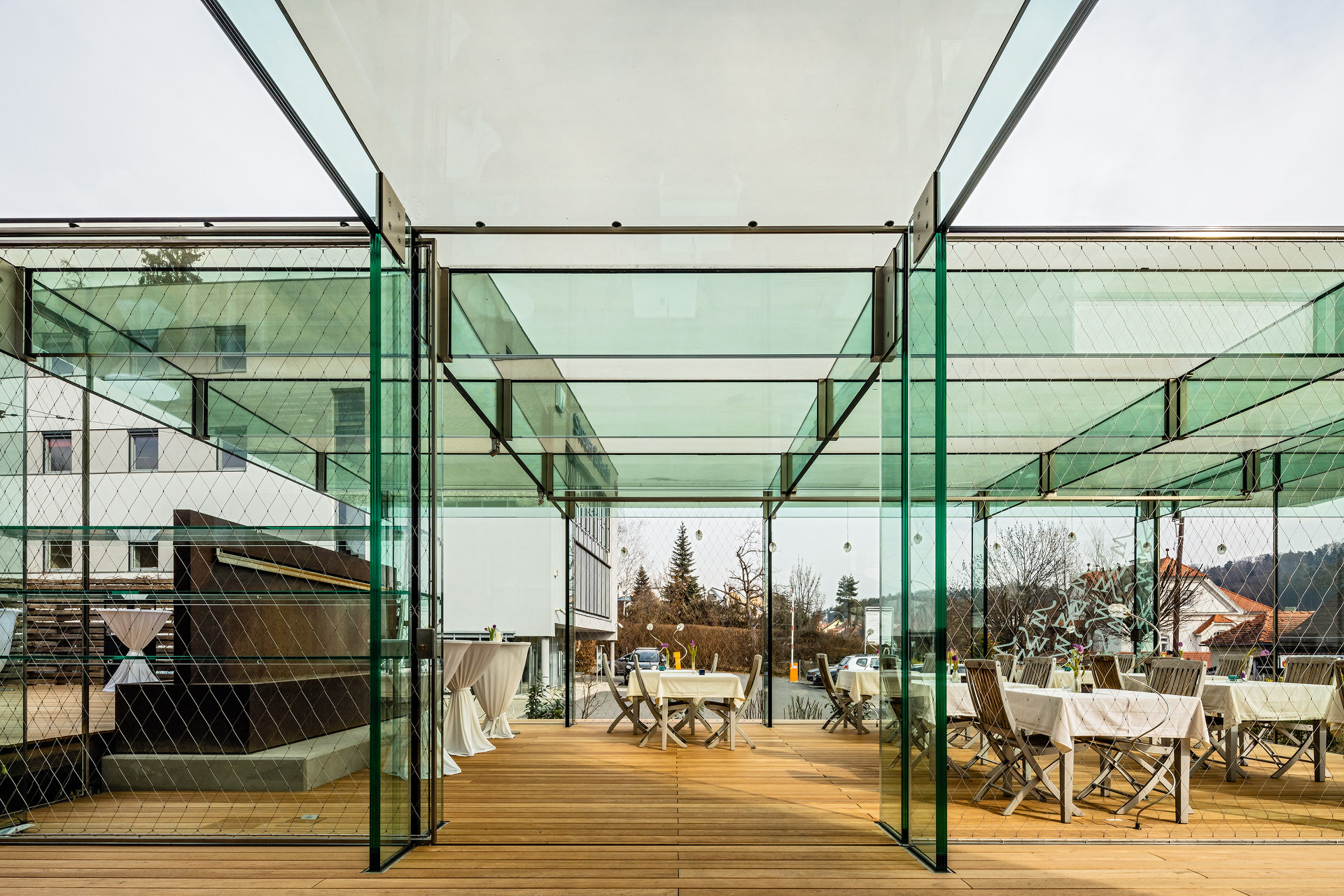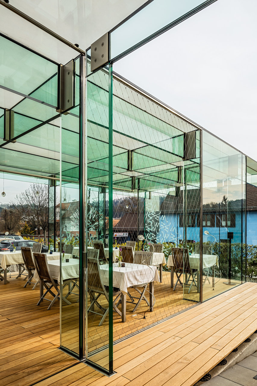 Die Glaskonstruktion ist im Fußpunktbereich linienförmig eingespannt. Die Verbindung der Glasstützen und Glasträger erfolgt mit Edelstahlkonsolen. Die Glasfinnen der Hauptträgerachsen werden mit den vertikalen Glasfinnen mittels Verplattung inklusive mechanischer Sicherung verschraubt. (Text: Architektin)