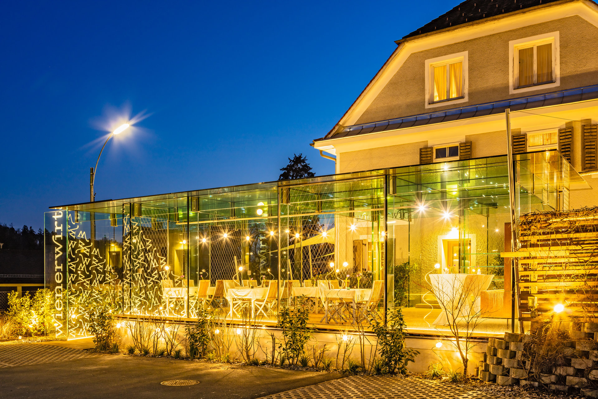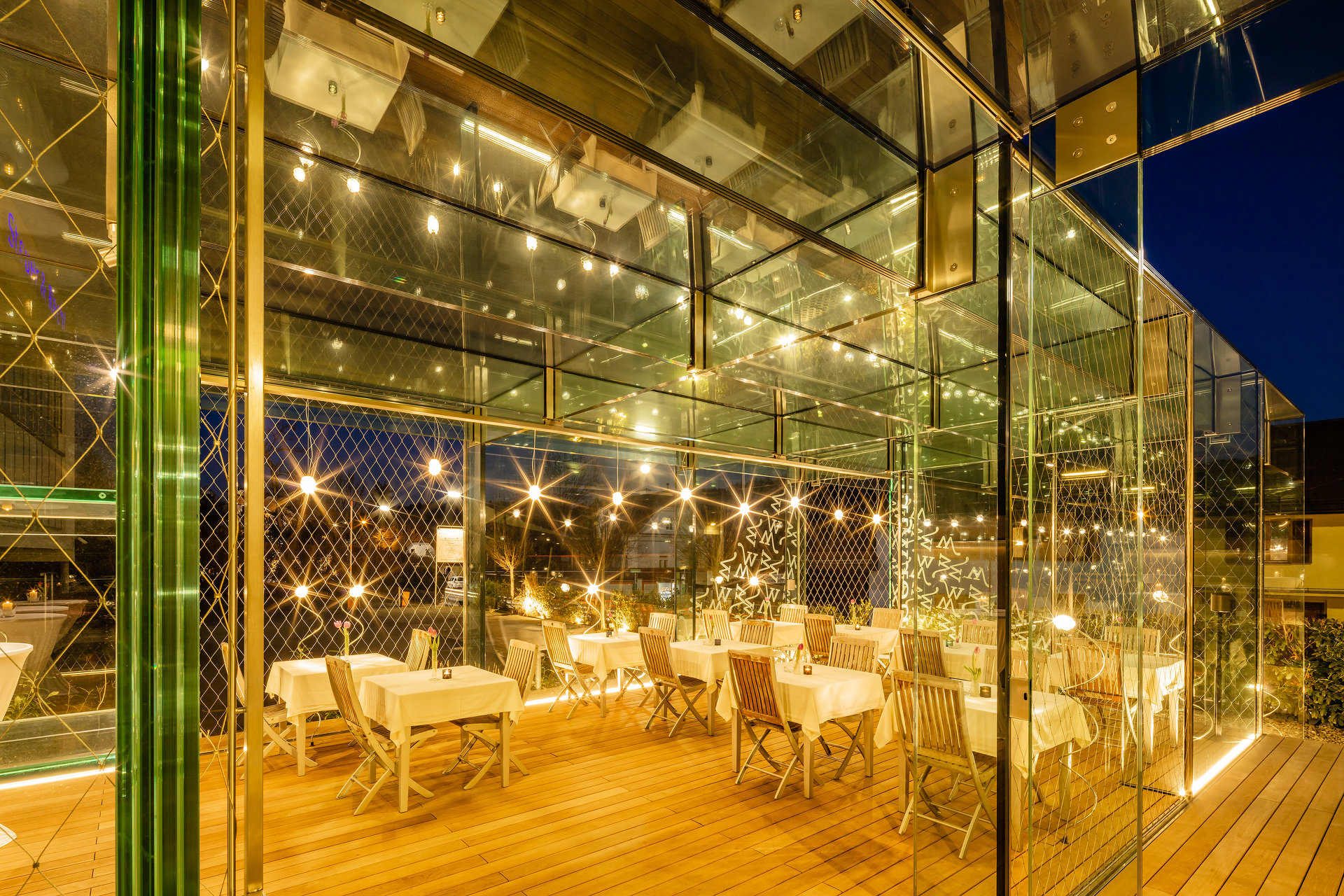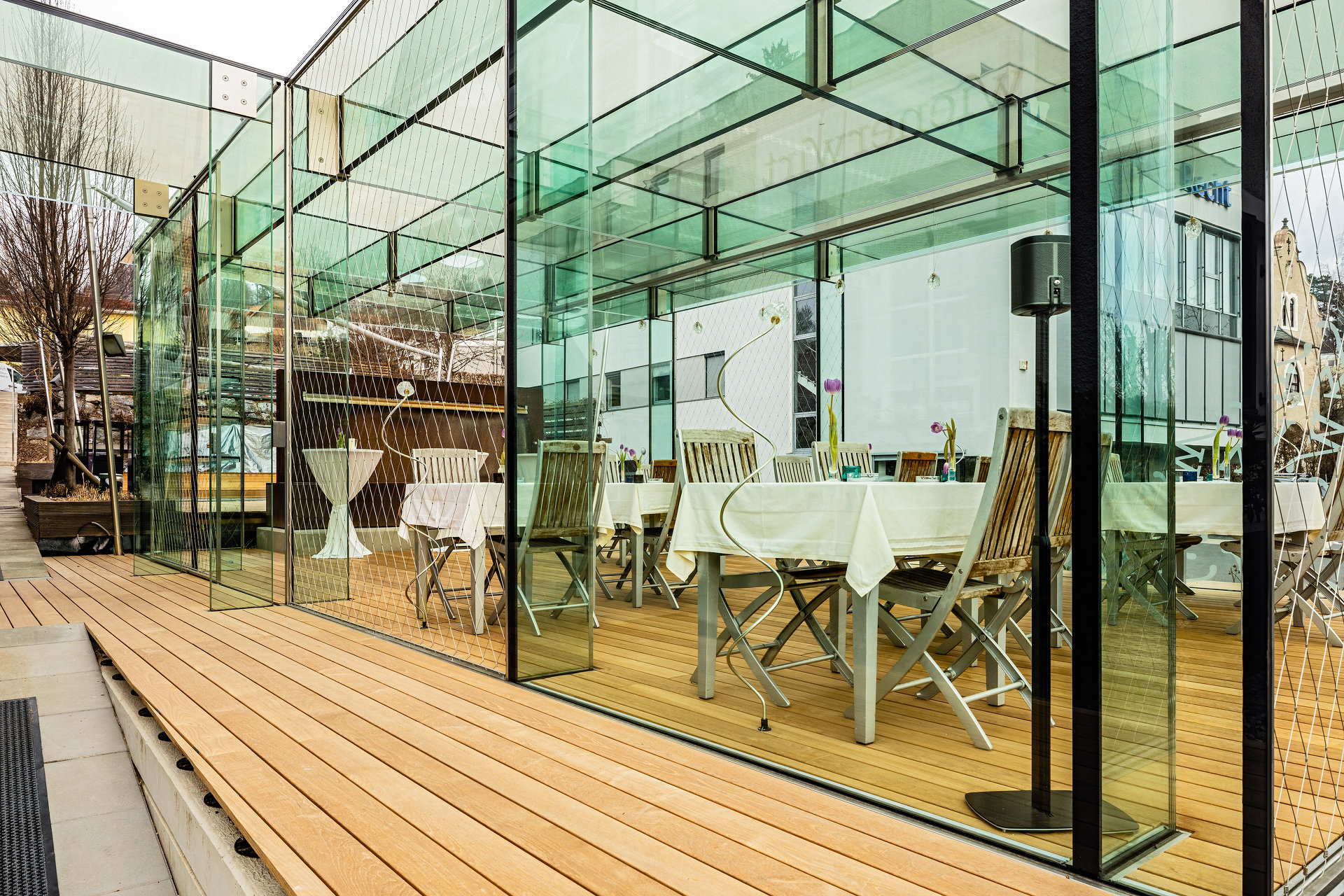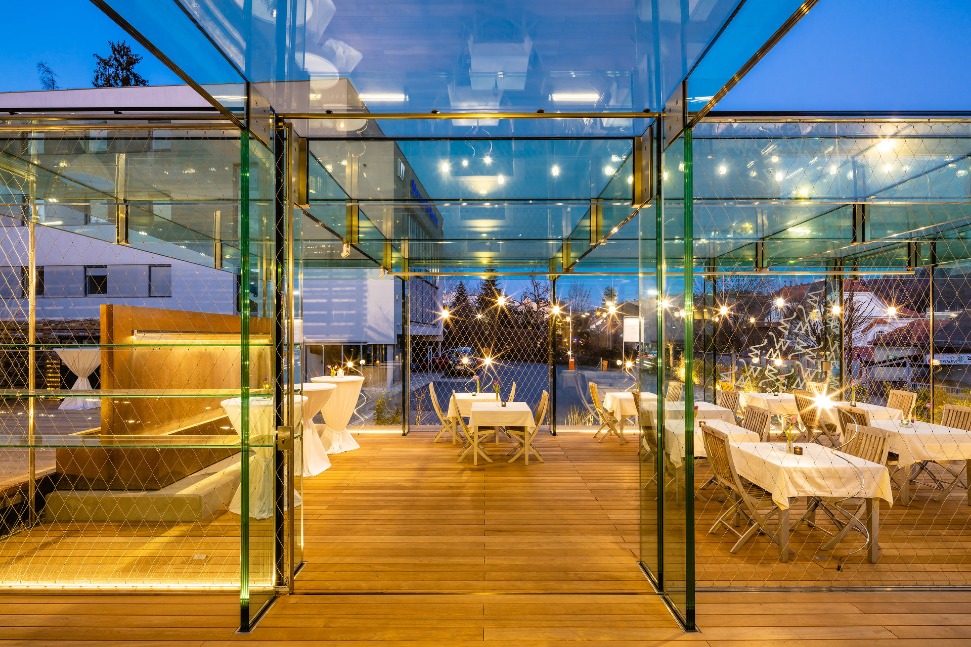 Die Glaskonstruktion ist im Fußpunktbereich linienförmig eingespannt. Die Verbindung der Glasstützen und Glasträger erfolgt mit Edelstahlkonsolen. Die Glasfinnen der Hauptträgerachsen werden mit den vertikalen Glasfinnen mittels Verplattung inklusive mechanischer Sicherung verschraubt. (Text: Architektin)