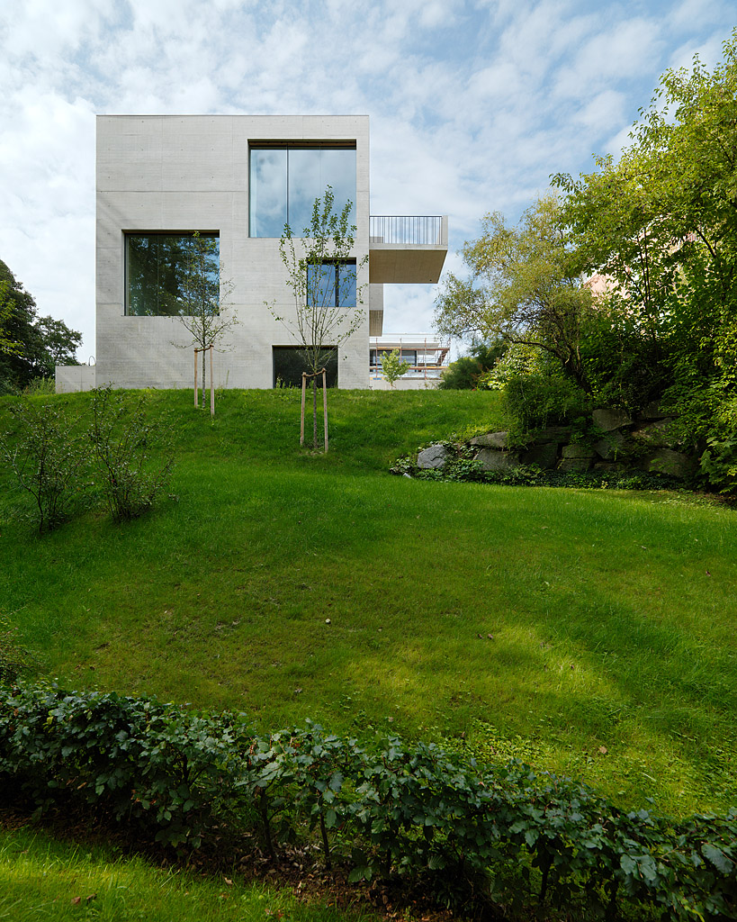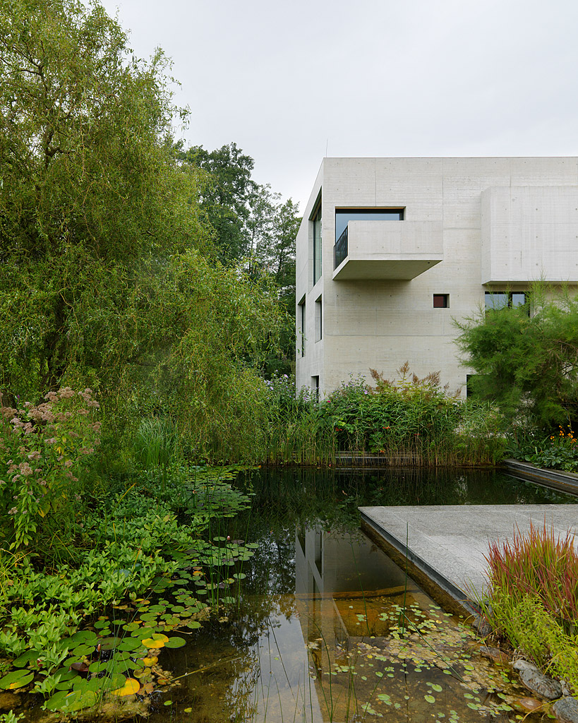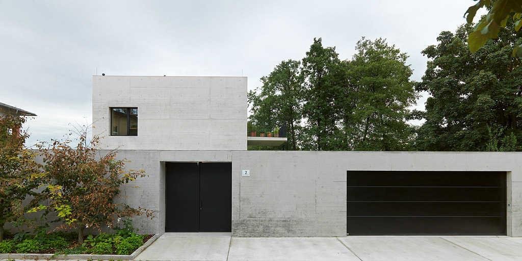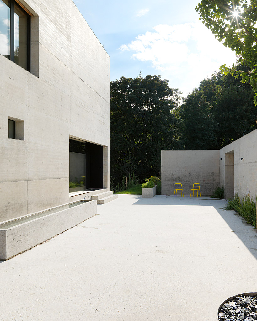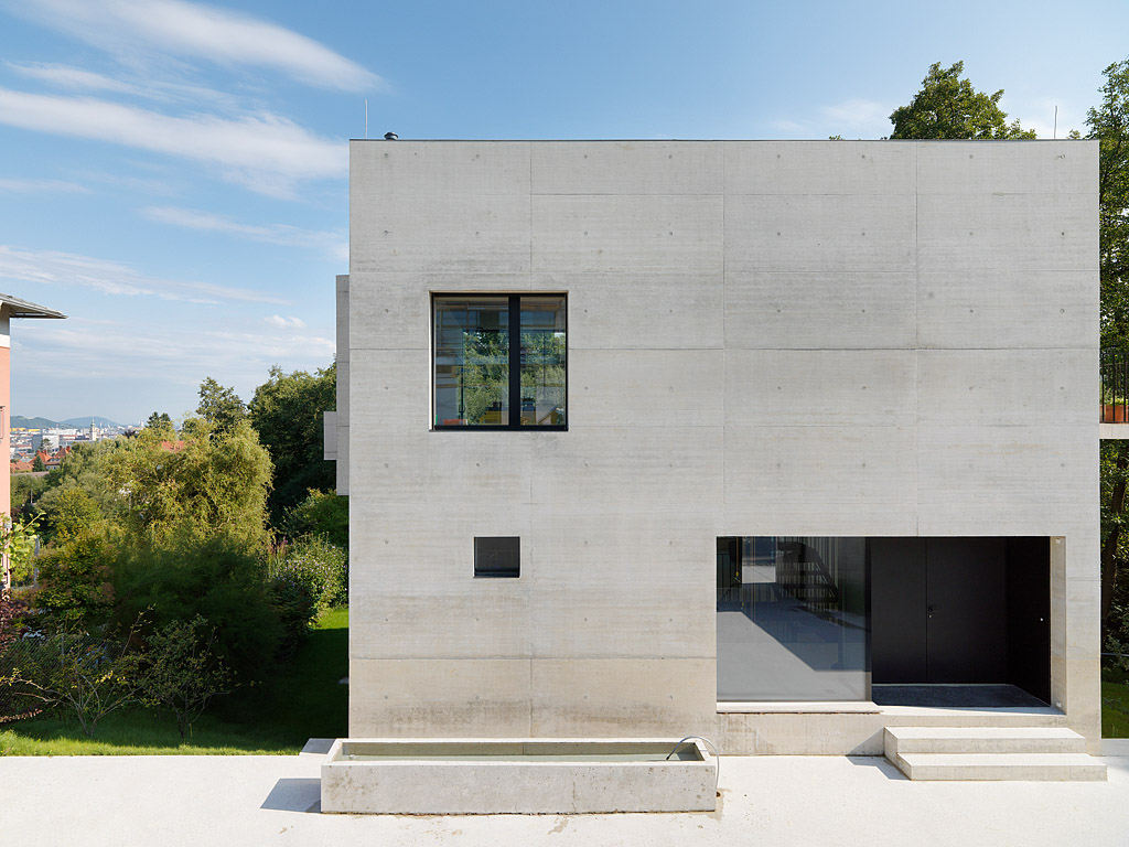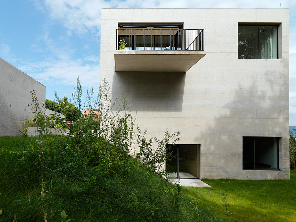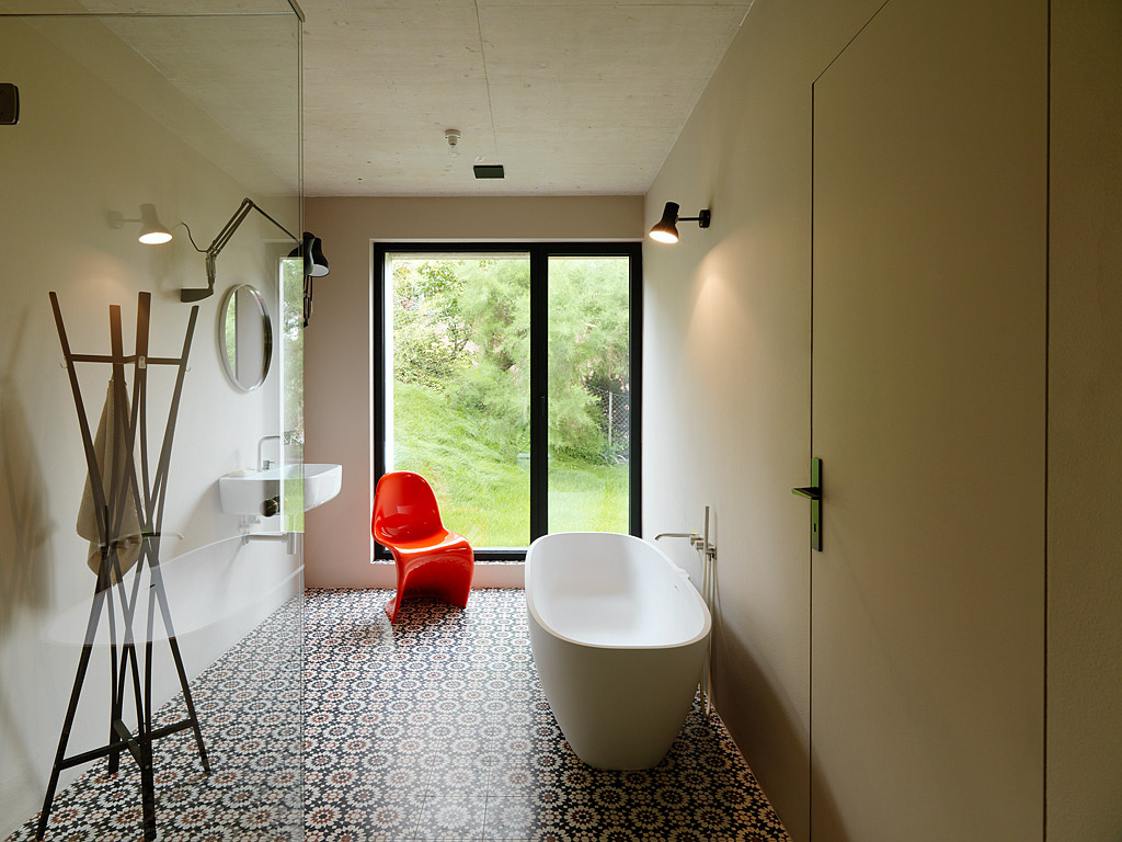 Roher Sichtbeton (an Decken und Wänden mit sich abzeichnender Holzmaserung der verwendeten Schalung, am Boden geschliffen), unbehandeltes Tannenholz (für die Böden in den Schlafräumen, Möbel und dem außenliegendem Sonnenschutz), sowie schwarzer Stahl prägen das Haus und können in Würde altern. Die verwendeten Baustoffe sind allesamt entweder recycelbar oder schon recycelt, wie die verwendete Schaumglasdämmung. Die verwendetet Hölzer sind ohne Klebstoffe und unlackiert. (Text: Architekt:innen, bearbeitet)