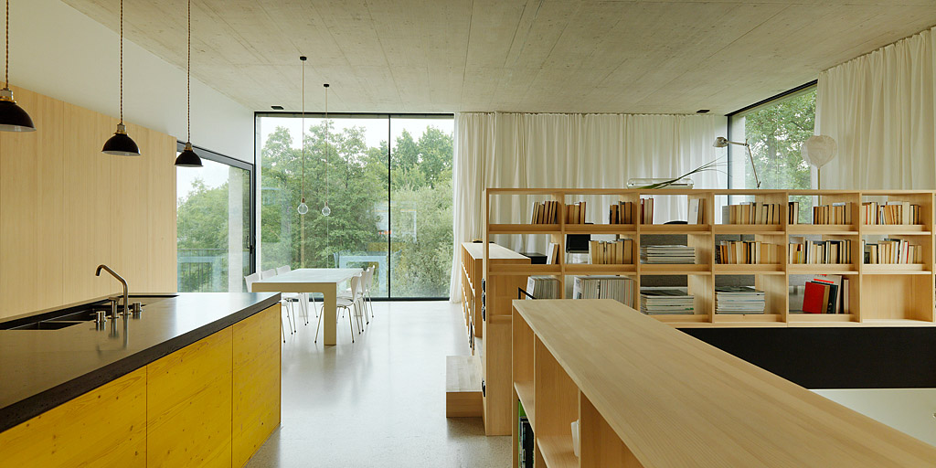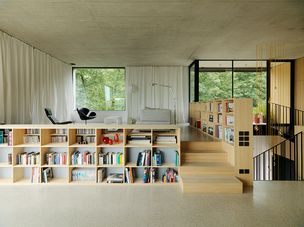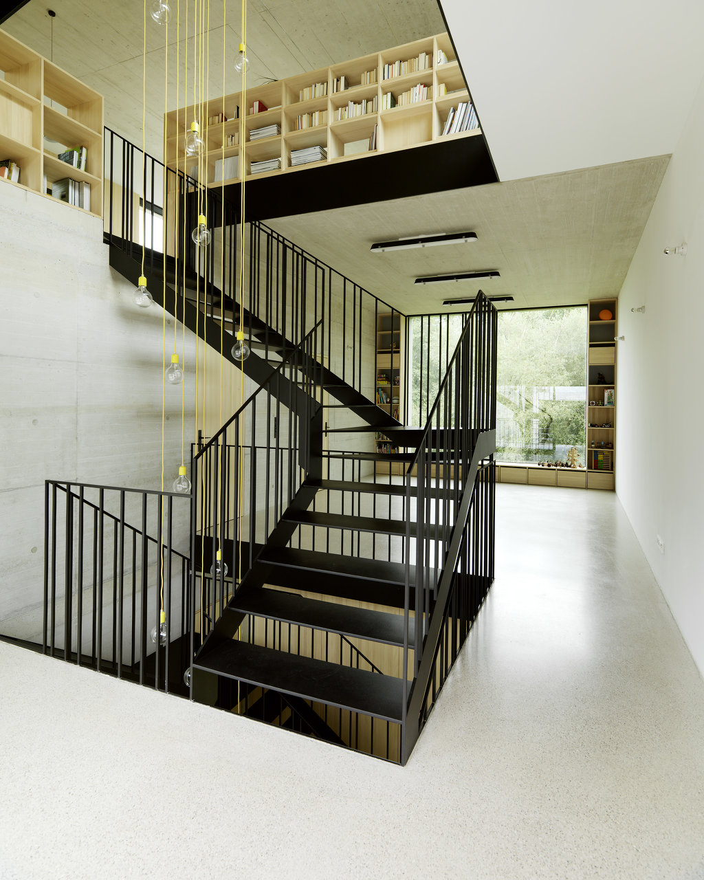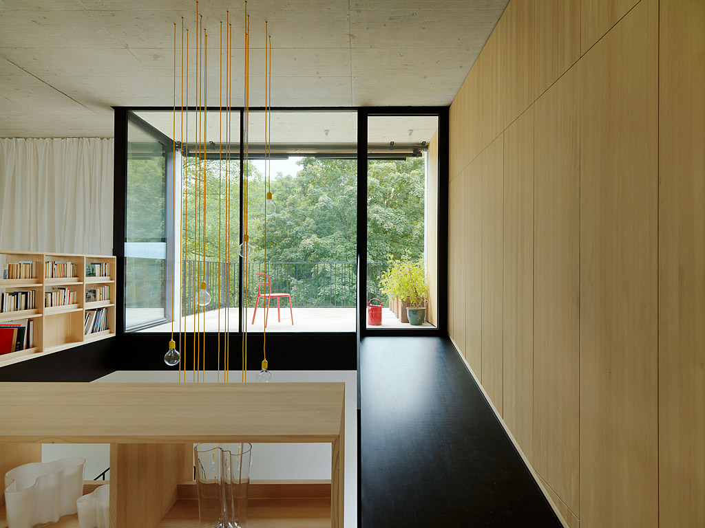 Man betritt das Haus unmittelbar in der mittleren Ebene in einem hohen Raum ohne vorgegebener Funktion. Spielzimmer, Turnsaal, Partylocation, Werkstatt, Büro und viele andere Möglichkeiten bietet dieses Zentrum im Haus. Über eine filigrane Stahltreppe gelangt man ins Obergeschoß. Hier befinden sich die offene Küche, der anschließende Essplatz, und, etwas erhöht, der Wohnbereich, der bei Bedarf durch Vorhänge vom restlichen Raum abgetrennt werden kann. Große, sorgsam situierte Öffnungen fangen Blicke auf die Stadt und das Licht zu unterschiedlichen Tageszeiten ein. Baumkronen vom anschließenden Wald vermitteln das Gefühl vom Leben in einem Baumhaus.