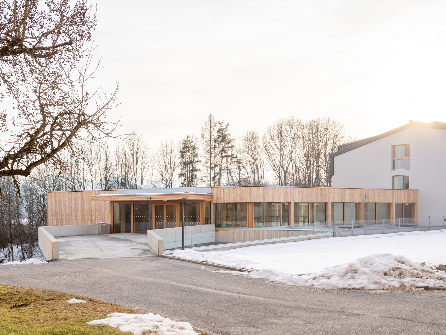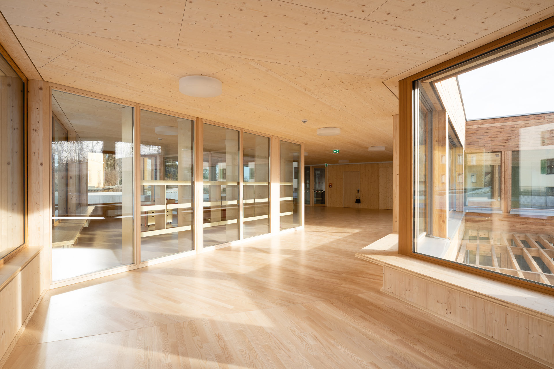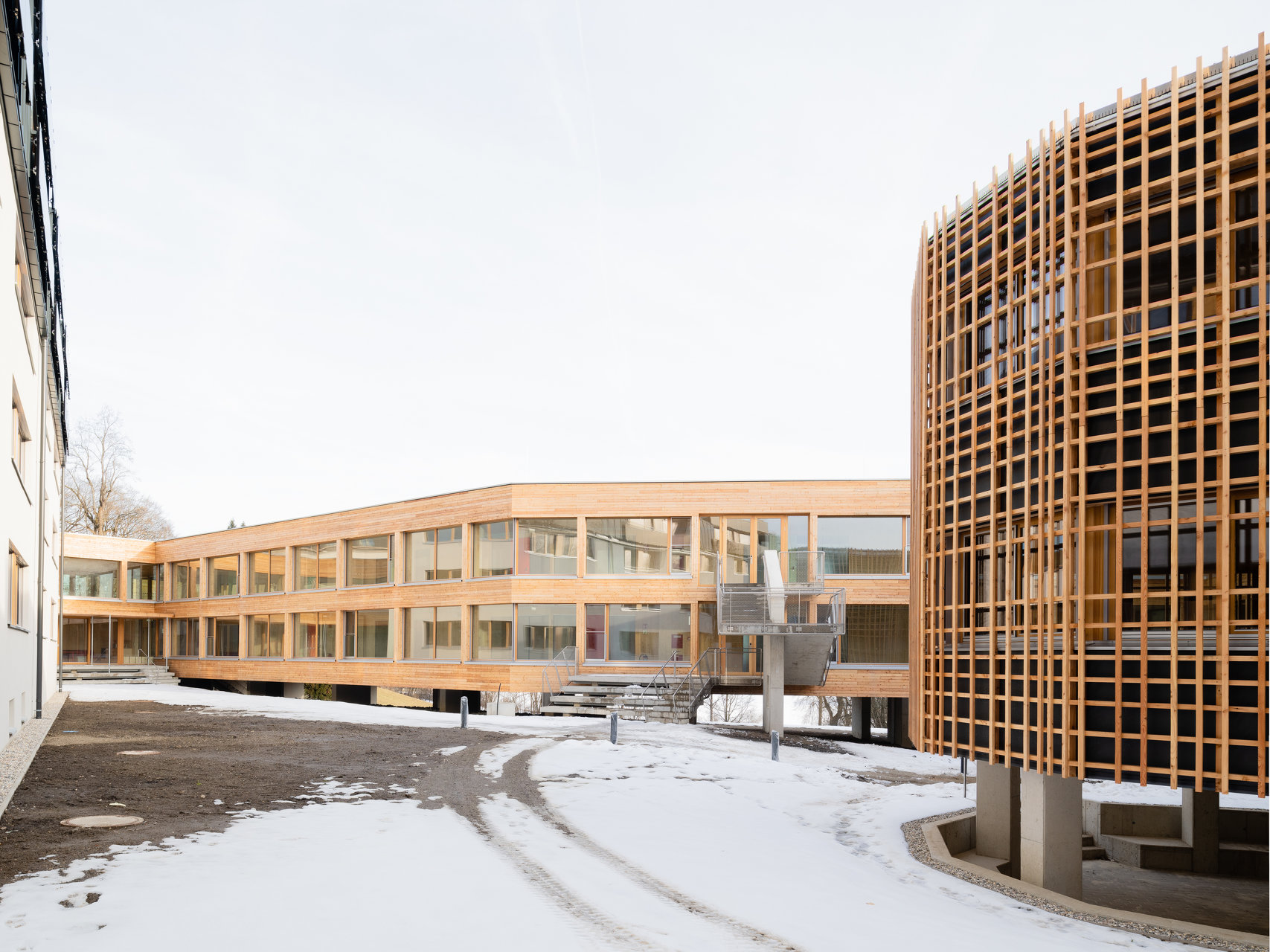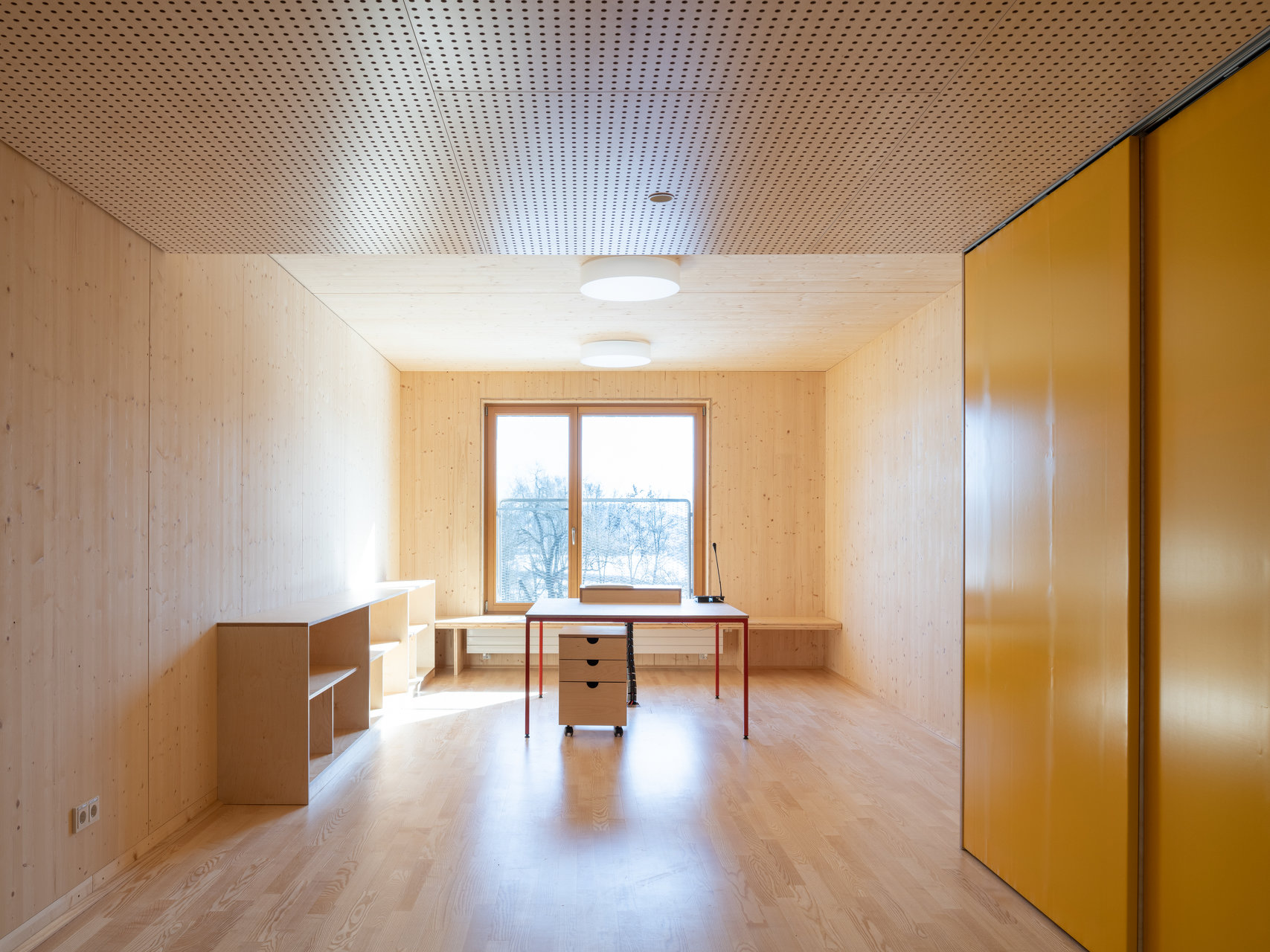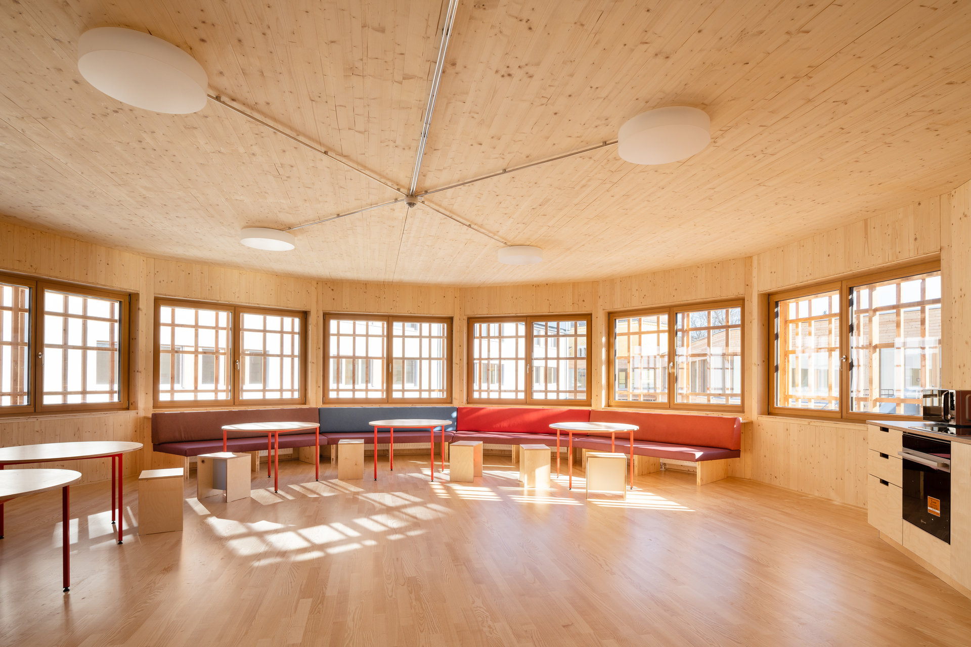 Der Bestand behält seinen Charakter in Massivbauweise. Maßnahmen zur Optimierung der Schallübertragung und neue Fußbodenaufbauten tragen zur Verbesserung bei. Die bestehenden Dreibettzimmer ohne Bad wandeln sich in Zweibettzimmer mit Vorraum, Bad und WC. Das Dachgeschoss wurde abgebrochen und in Massivholzbauweise neu errichtet. Fünf Aufenthaltsräume sind strategisch gut verteilt und bieten den Bewohnerinnen unterschiedliche räumliche Konstellationen an: Ein in den Hof gestellter Pavillon, zweigeschossige Aufenthaltsbereiche im Bestand mit Sitztreppe und ein innenliegender Aufenthaltsraum auf Hofebene. (Text: Architekt:innen, bearbeitet)