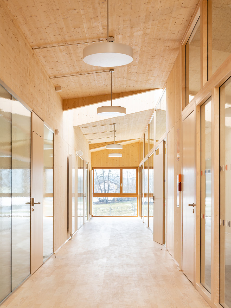 Der Neubau ist in Massivholzweise errichtet, Decken und die tragenden Seitenbauteile in Brettsperrholzplatten ausgeführt, die mit entsprechender Fügetechnik eine große Gebäudefestigkeit erlangen. Die insgesamt 26 Module sind jeweils mit zwei Zweibettzimmer, Vorraum, Bad klein, Bad groß und WC bestückt. Zimmertrennwände und Decken sind aus Brettsperrholzplatten in Fichte, Türen und Einrichtungselemente aus Birkensperrholz, der Boden Eschenholz. Der Werkstoff Holz vermittelt Natürlichkeit und optimiert das Raumklima.