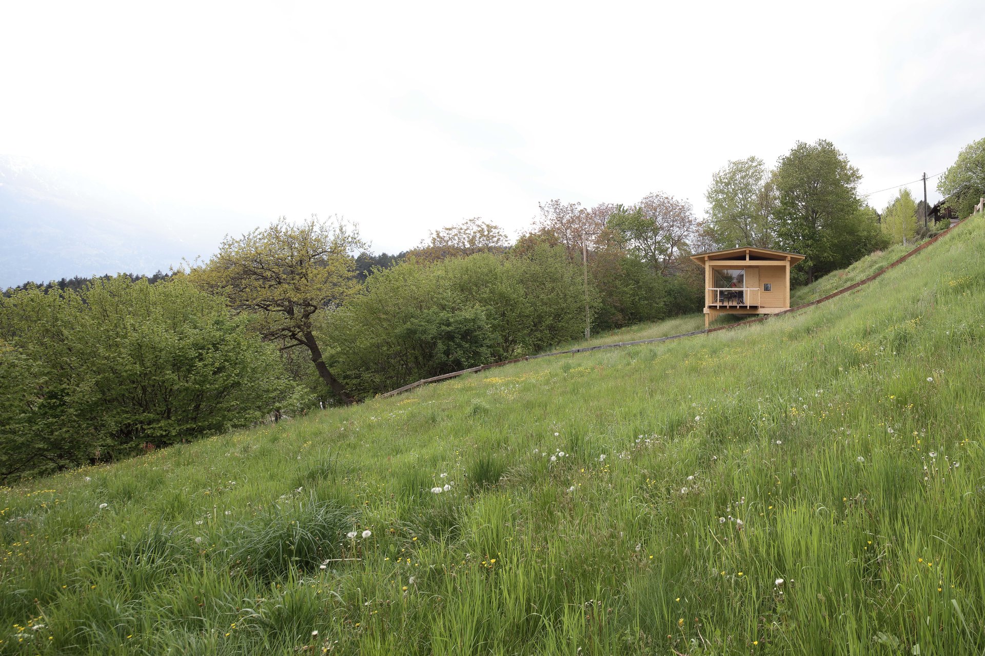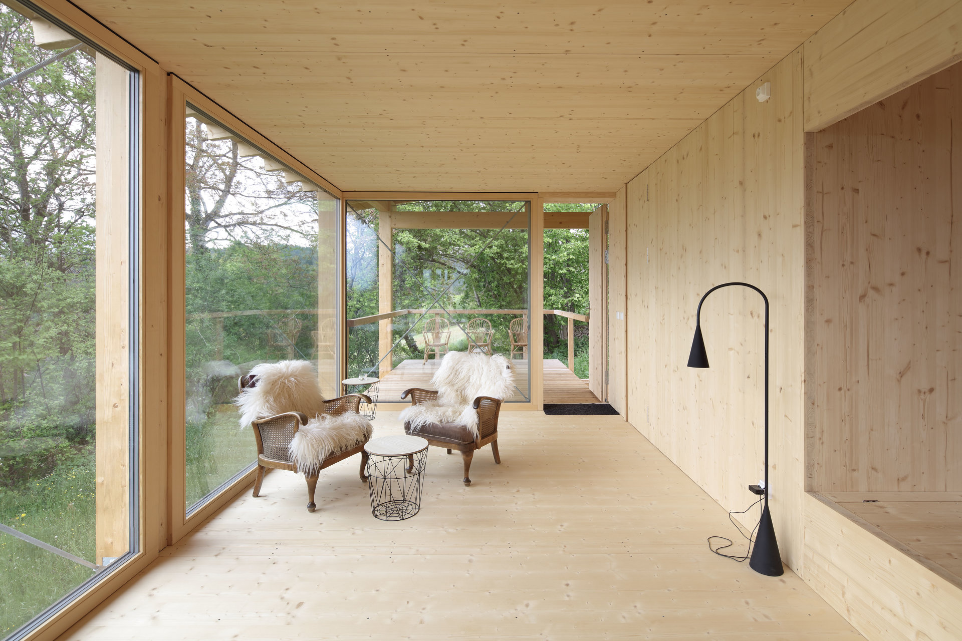 Das Psychologenpaar, das gerne mit dem Campingwagen unterwegs ist, wünschte sich einen Rückzugsort mit Bezug zur umliegenden Natur. Auf 65 Quadratmeter ist ein Einraum-Haus entstanden, das sich nach Osten, Süden und Westen komplett zur Landschaft öffnet und zur nördlichen Hangseite, in einer 140 cm breiten Raumschicht, Schlaf-Alkoven, Bad, WC und Garderobe aufnimmt. Der Einraum ist durch ein Möbel in Wohn-, Koch- und Essbereich gegliedert und setzt sich nach Osten wie Westen auf eine großzügig überdeckte Terrasse fort. Aufbauten und technische Ausstattung sind auf ein Minimum reduziert und sämtliche Oberflächen in unbehandeltem Fichtenholz ausgeführt. Die Installationsleitungen sind kompakt in einer Wand gebündelt bzw. wo notwendig „auf Holz“ geführt – als Heizquelle dient ein Holzofen. (Text: Architekt:innen)
