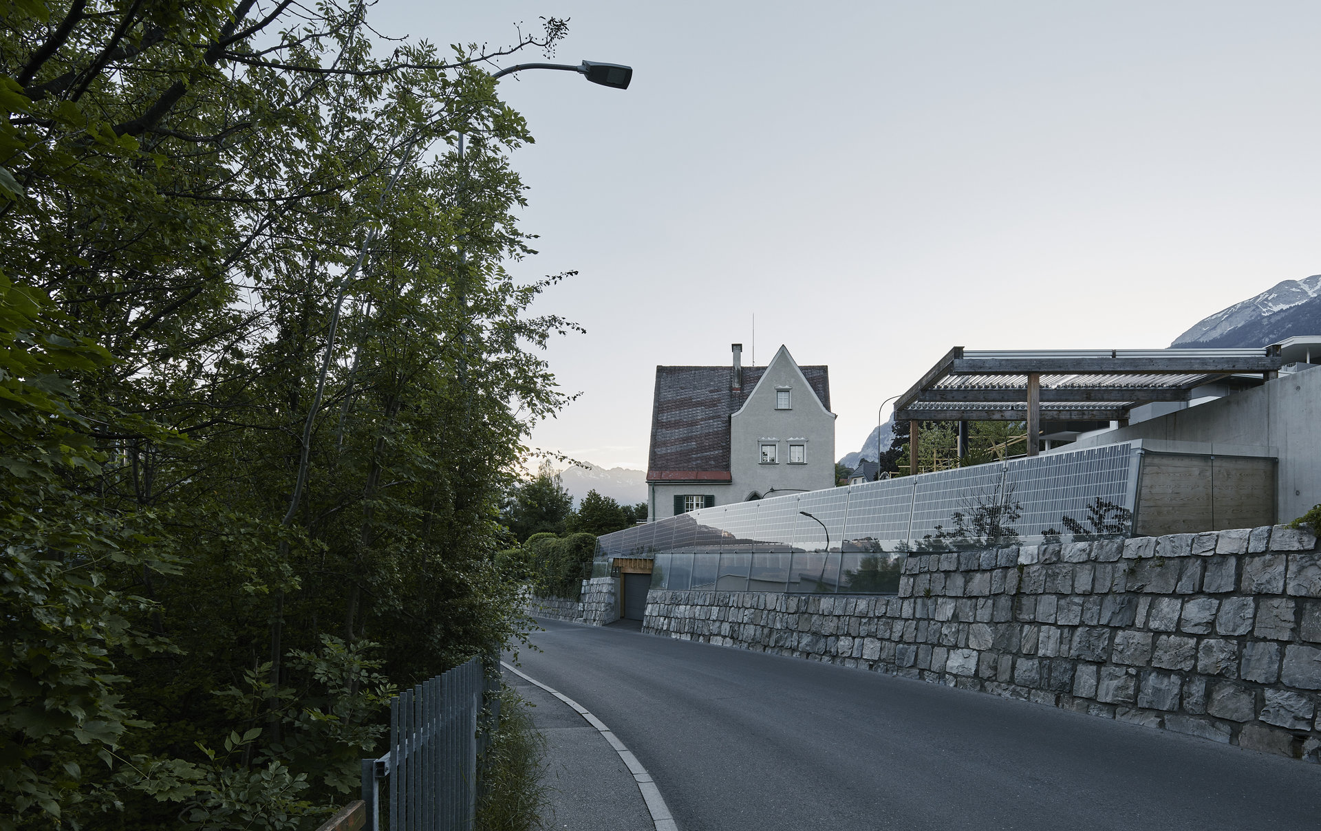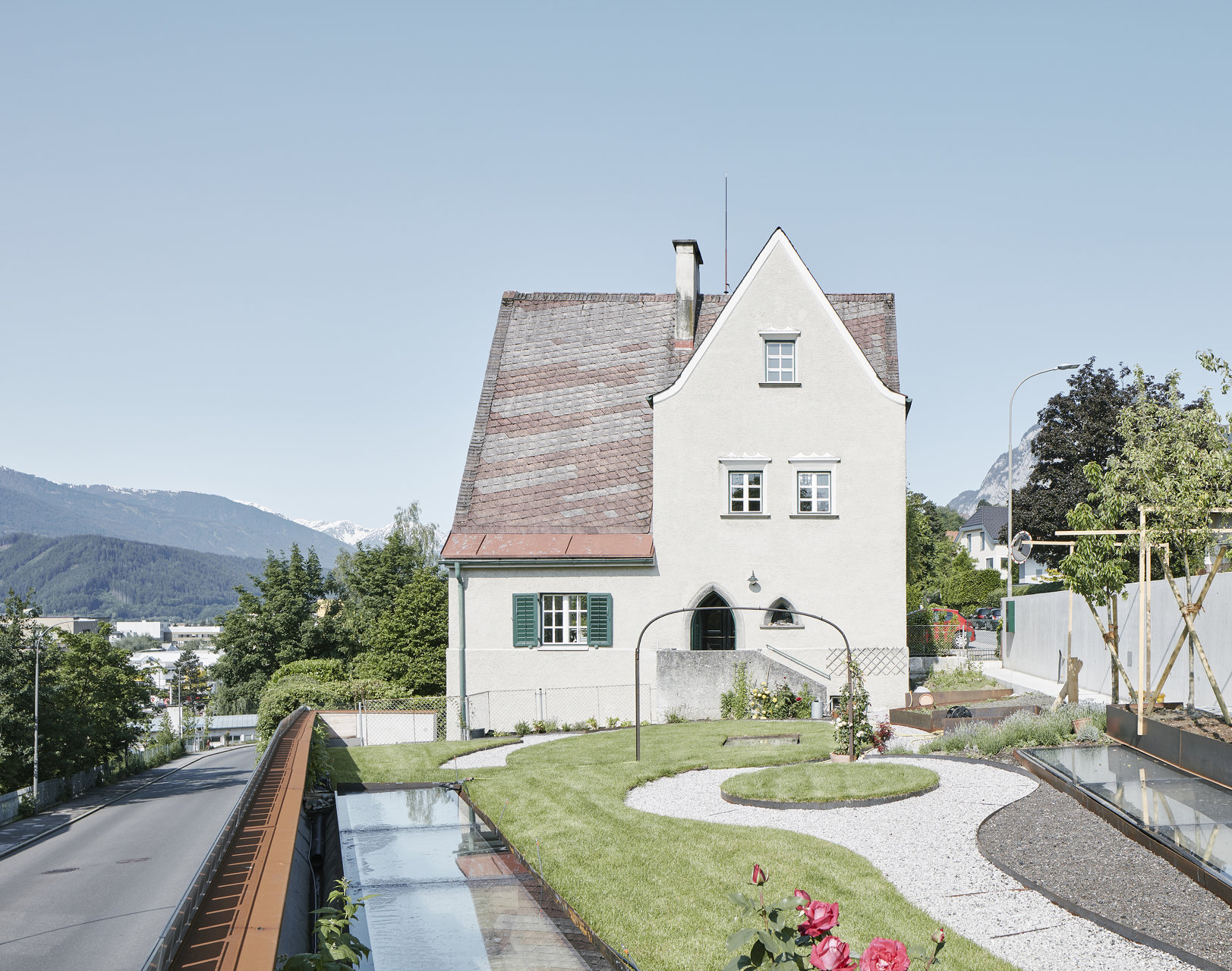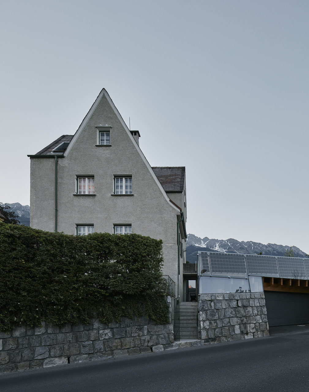 Das 1925 vom Tiroler Architekten Siegfried Mazagg geplante Haus Walter befindet sich auf einem spitzwinkeligen Grundstück in Hötting. Mit seinen zwei unterschiedlich weit heruntergezogenen Steildächern und den damit einhergehenden vier verschiedenen, markanten Fassaden ist es ein Zeugnis der zeichenhaften Handschrift des jung verstorbenen Architekten.Bis vor kurzem wurde das unter Denkmalschutz stehende Haus von der Tochter des ursprünglichen Bauherrens bewohnt und in fast komplett originalem Zustand erhalten. Daniel Fügenschuh konnte die kleine Villa erwerben und adaptierte sie mit minimalen Eingriffen als Wohnhaus für sich und seine Familie. In der untersten Ebene richtete er eine eigenständig erschlossene Einliegerwohnung ein, das Wohngeschoß öffnete er im Westen hin zu einer neuen Terrasse und einem kleinen Naturschwimmbad. Im Osten schuf er Raum für das eigene Architekturbüro, das – wie schon sein erstes, wenige Meter unterhalb liegendes Atelier – komplett in den Hang eingegraben ist. Eine Holzkonstruktion aus Brettsperrholz überspannt stützenfrei die gesamte Fläche, Boden und Wände wurden in Sichtbeton ausgeführt. Der darüber liegende Garten wurde auf der Basis von Zeichnungen aus der Entstehungszeit rekonstruiert. (Text: Claudia Wedekind)