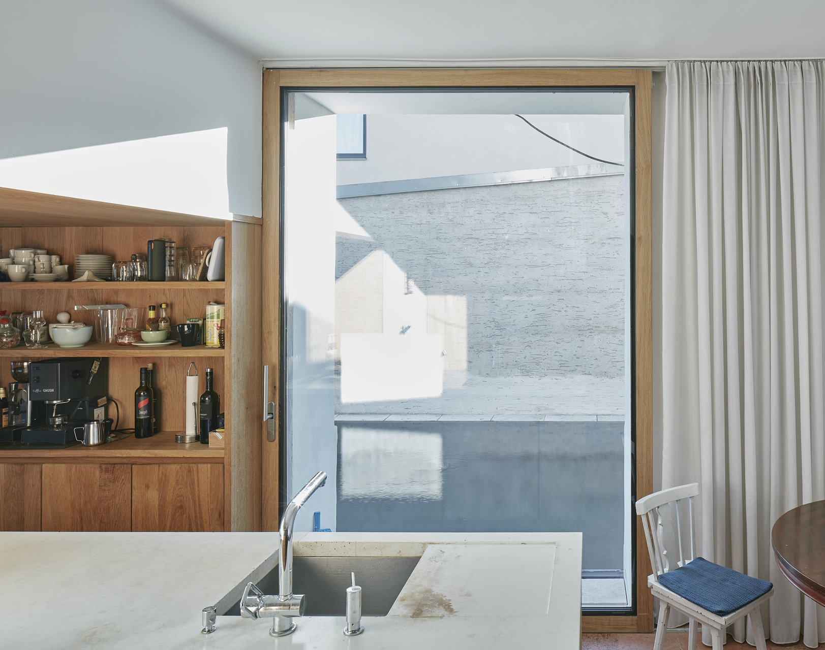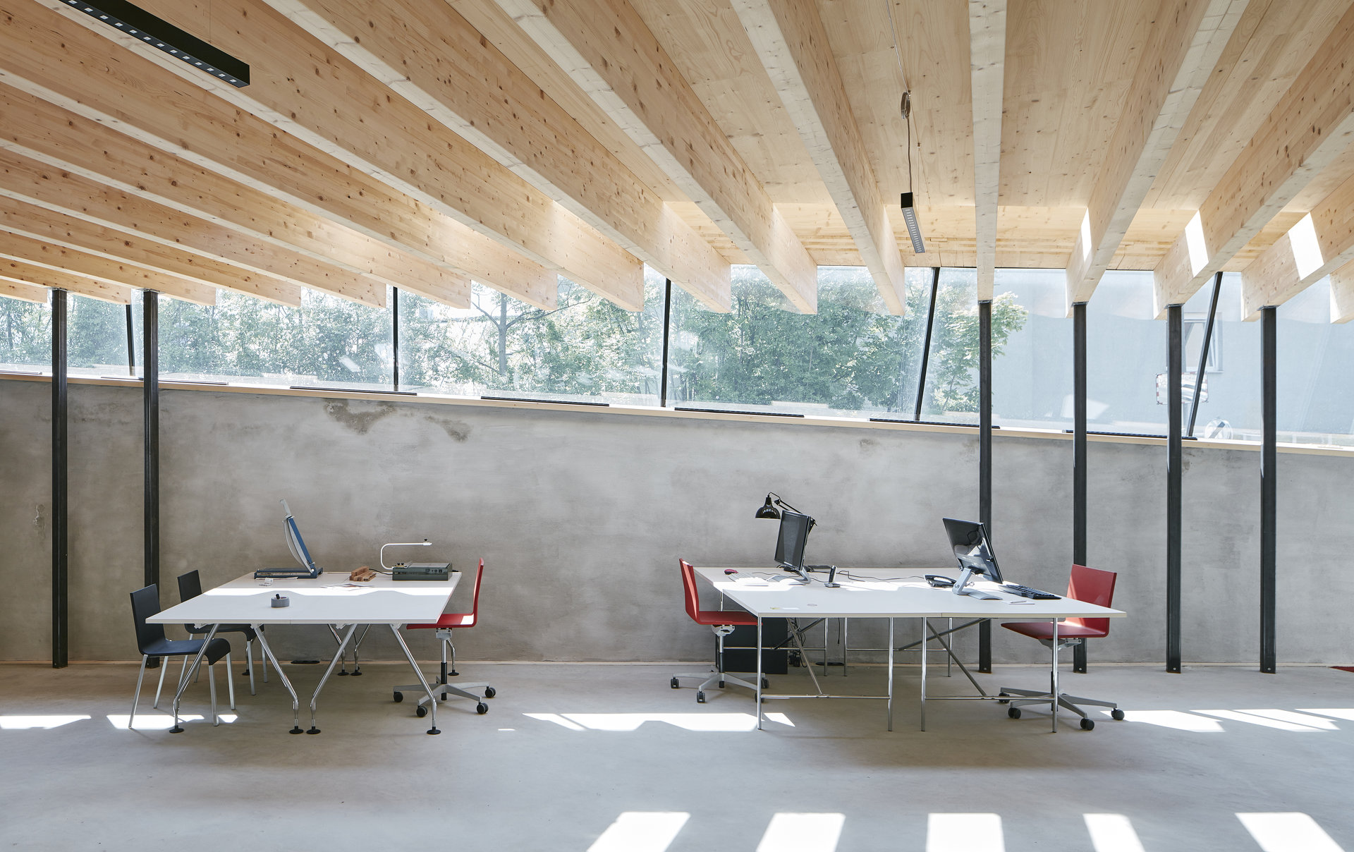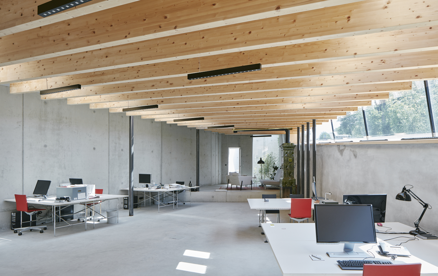 Das 1925 vom Tiroler Architekten Siegfried Mazagg geplante Haus Walter befindet sich auf einem spitzwinkeligen Grundstück in Hötting. Mit seinen zwei unterschiedlich weit heruntergezogenen Steildächern und den damit einhergehenden vier verschiedenen, markanten Fassaden ist es ein Zeugnis der zeichenhaften Handschrift des jung verstorbenen Architekten.Bis vor kurzem wurde das unter Denkmalschutz stehende Haus von der Tochter des ursprünglichen Bauherrens bewohnt und in fast komplett originalem Zustand erhalten. Daniel Fügenschuh konnte die kleine Villa erwerben und adaptierte sie mit minimalen Eingriffen als Wohnhaus für sich und seine Familie. In der untersten Ebene richtete er eine eigenständig erschlossene Einliegerwohnung ein, das Wohngeschoß öffnete er im Westen hin zu einer neuen Terrasse und einem kleinen Naturschwimmbad. Im Osten schuf er Raum für das eigene Architekturbüro, das – wie schon sein erstes, wenige Meter unterhalb liegendes Atelier – komplett in den Hang eingegraben ist. Eine Holzkonstruktion aus Brettsperrholz überspannt stützenfrei die gesamte Fläche, Boden und Wände wurden in Sichtbeton ausgeführt. Der darüber liegende Garten wurde auf der Basis von Zeichnungen aus der Entstehungszeit rekonstruiert. (Text: Claudia Wedekind)