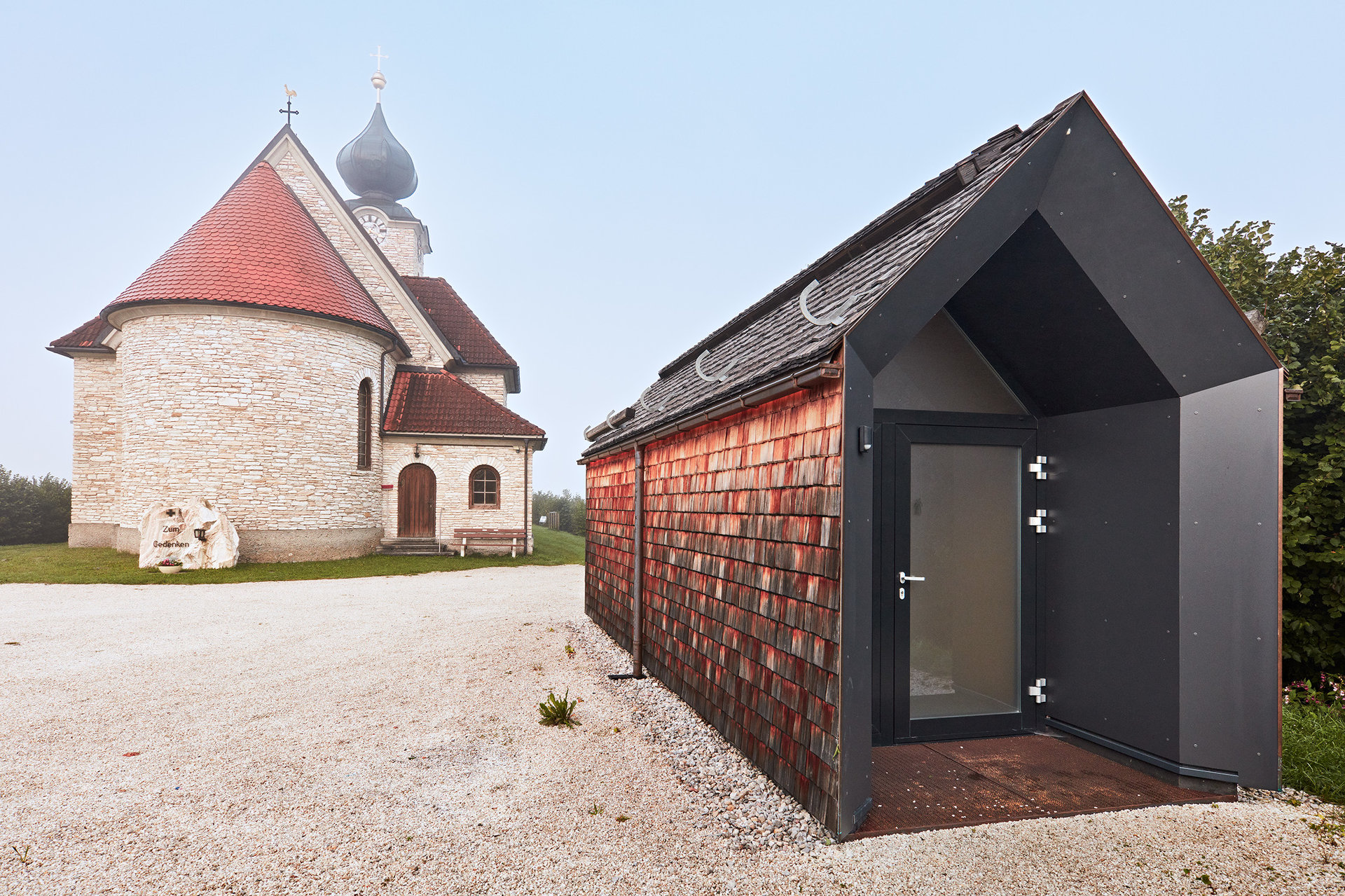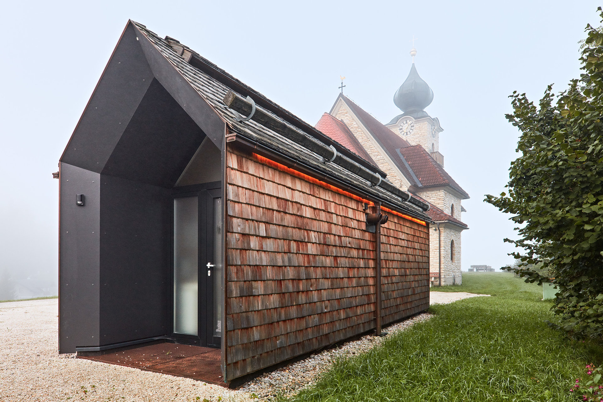 Auf einem Plateau, ca. 50 Meter über dem Ennstal, wurde der katholischen Filialkirche in Stein a. d. Enns aufgrund fehlender Infrastruktur ein kleiner Baukörper hinzugefügt. Dieser wurde so situiert, dass zusätzlich ein neuer Platz definiert wurde.Entwurfsbestimmend waren die Form der Kirche und des Steildaches, welche sich sowohl am Baukörper als auch im Innenbereich wiederfindet. Durch die Verwendung von kleinteiligem Material ordnet sich das neue Gebäude der Kirche unter.