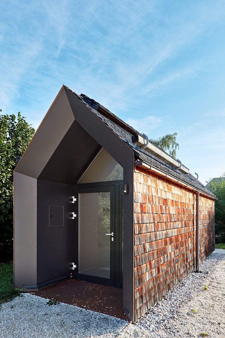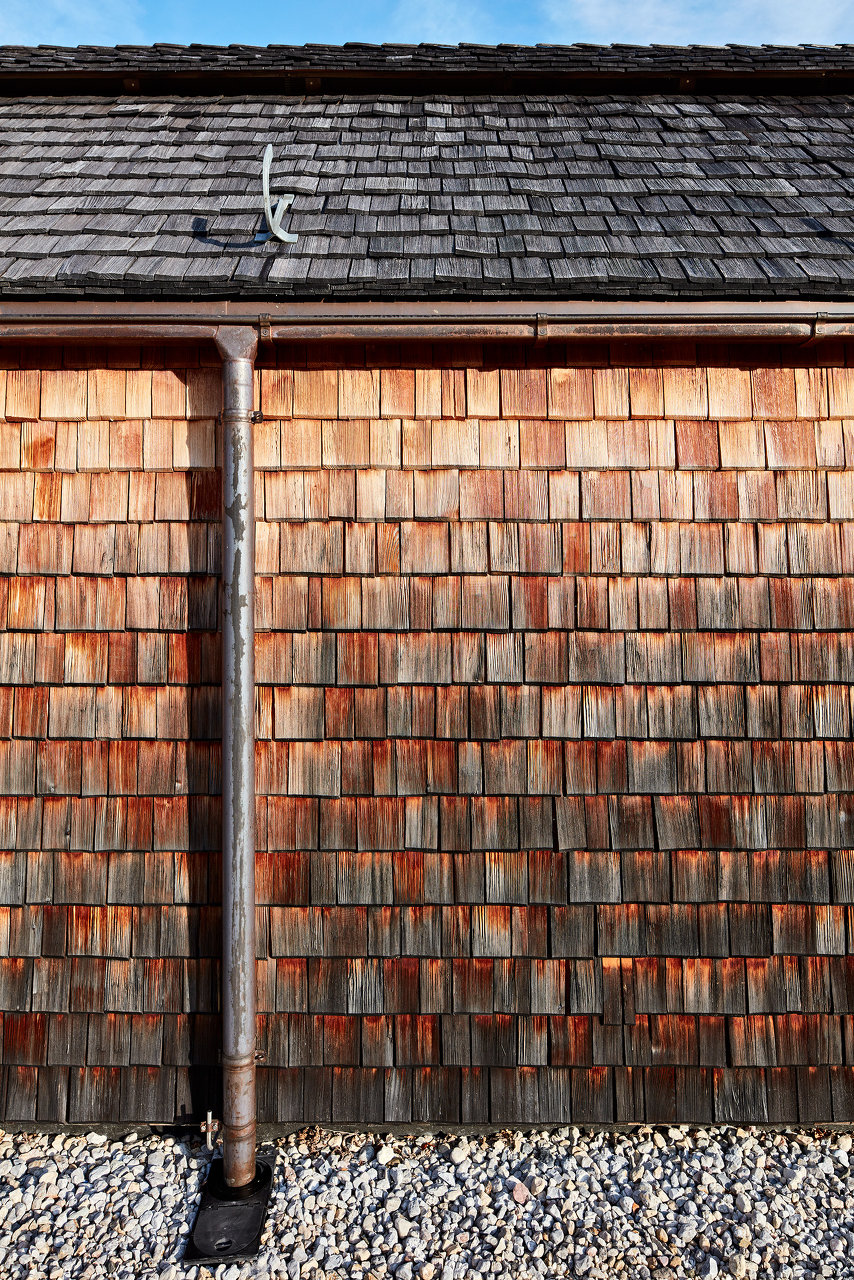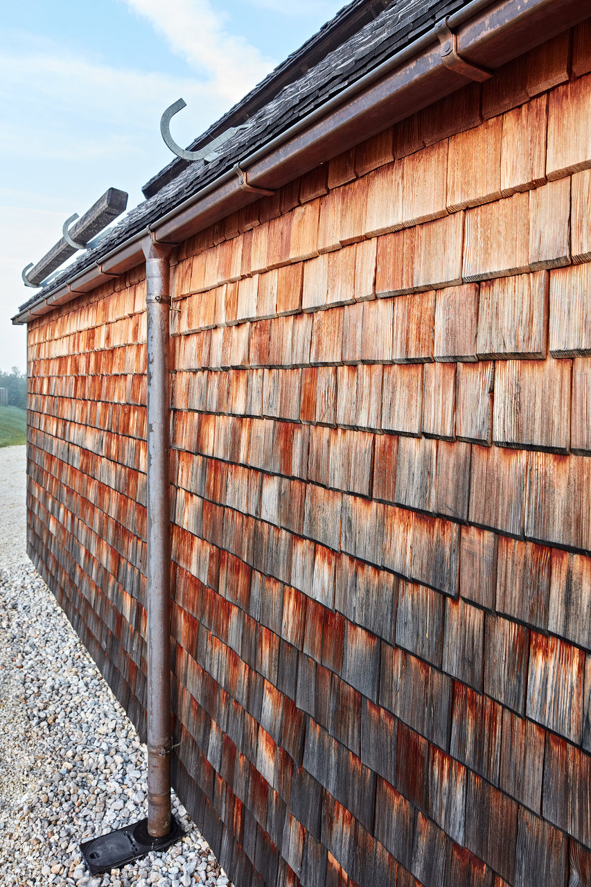 Die Fassade wurde in Lärchenschindeldeckung ausgearbeitet, da diese einen regionalen Bezug herstellt und der Witterung über Jahrzehnte trotzen kann, ohne zusätzliche Wartungsarbeiten und Erhaltungsmaßnahmen zu verursachen. (Text: Architekt, bearbeitet)