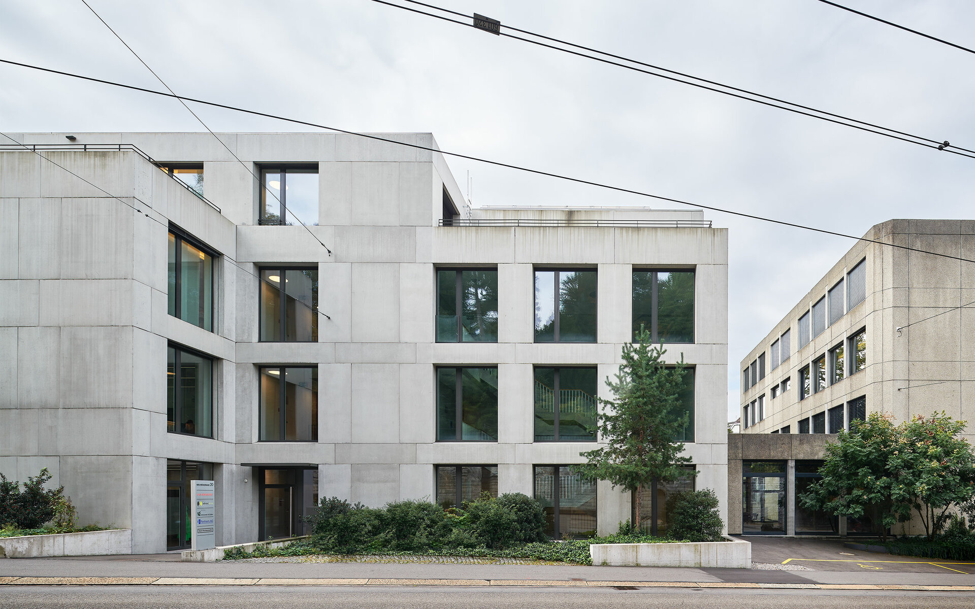 Geprägt ist die gebaute Nachbarschaft durch die Auflösung des Blockrandes. Die Bestandsbauten begrenzen die an den Strassenraum stossende, parkähnliche Umgebung. Der Neubau fügt sich als gleichwertiges Element zusammen mit dem Bestandsbau in eine Reihe vorhandener Solitäre ein und präzisiert dadurch die städtebauliche Situation. Mit zwei markanten Vorsprüngen setzt er strassenseitig das bestehende Thema der gestaffelten Fassade fort. Die vorgefundene Grundrissstruktur wurde weiterentwickelt, damit eine homogene, in sich logische Gesamtanlage entsteht.