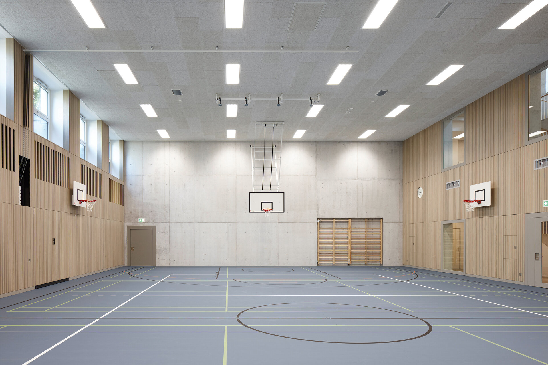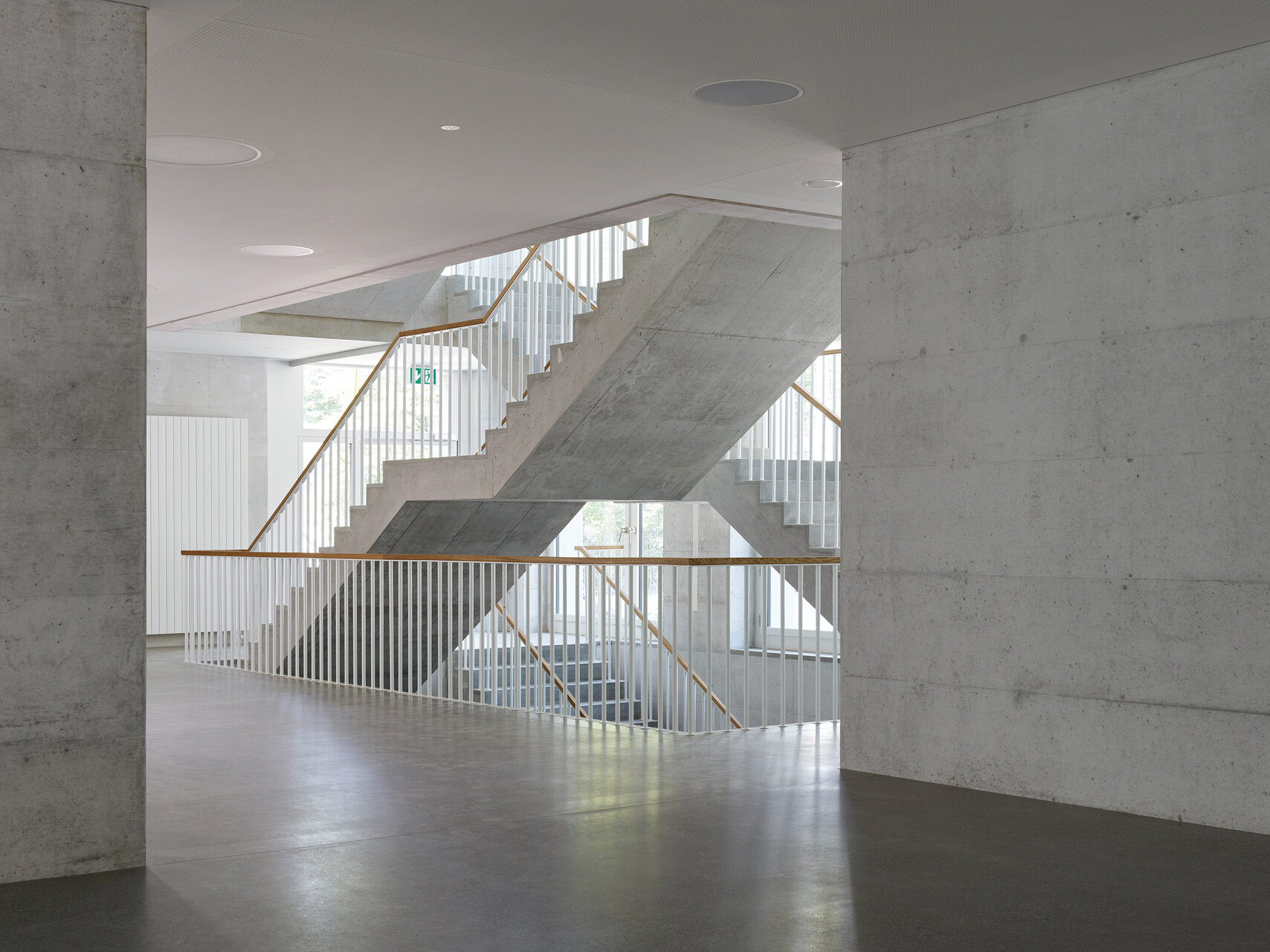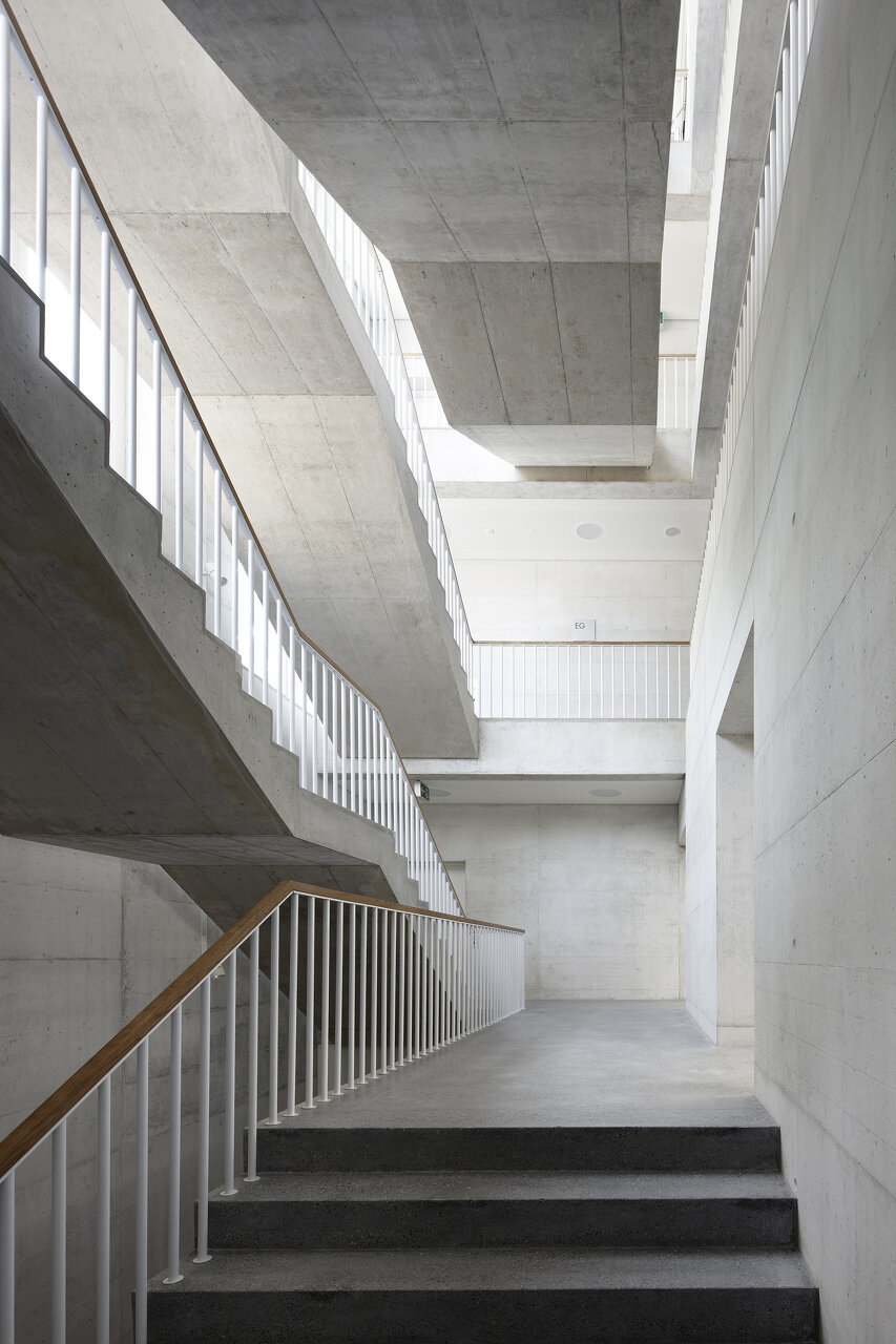 Die eingeschossige Eingangshalle verbindet den Neu- mit dem Altbau. Die Durchgangs- und Aufenthaltszonen bestechen durch räumliche Durchlässigkeit. Eine teilweise doppelläufige Treppe erschliesst den Neubau in der Vertikalen. Das strassenseitige Panoramafenster im Treppenhaus stellt den Bezug zur Stadt her. Alle Klassenzimmer richten sich zum Park oder zur Villa aus, wodurch sich die Lärmbelastung massiv reduzieren liess. (Text: Architekten, bearbeitet)