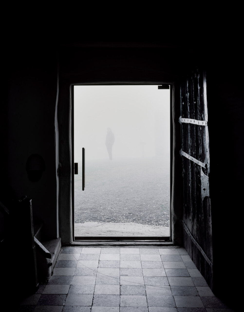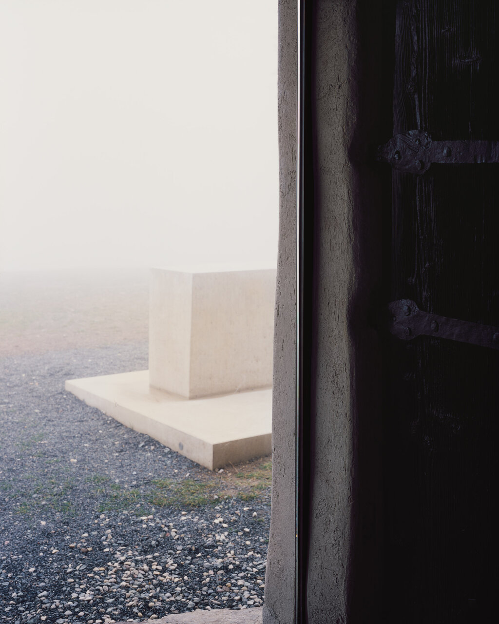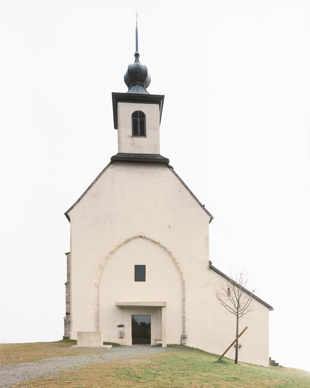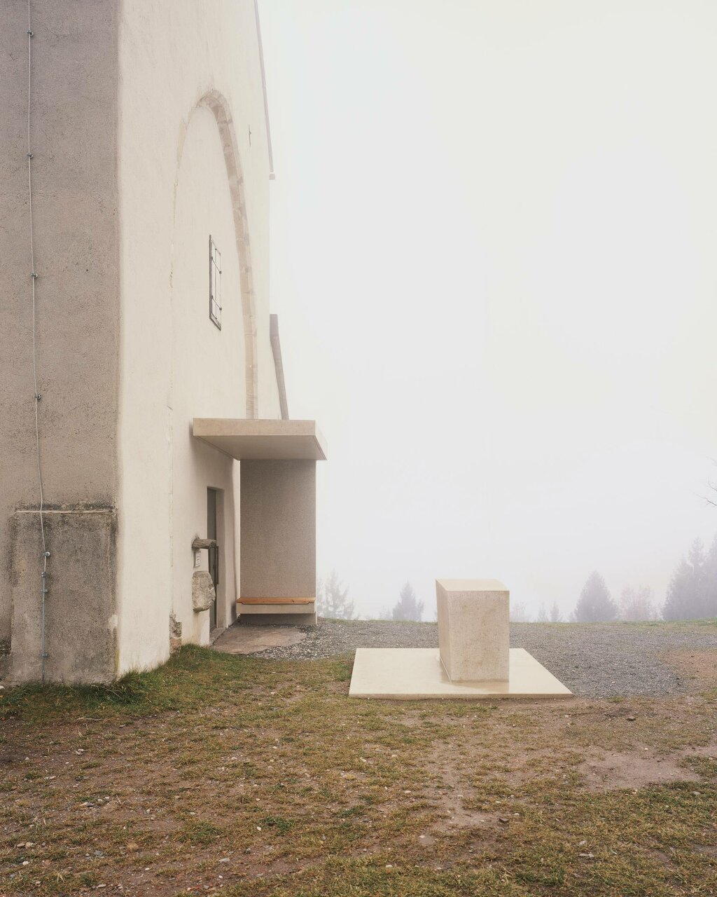 Ein neues Eingangsensemble mit den Elementen Glastür, Vordach und Tischobjekt (Außenaltar) führt den ursprünglichen Grundrissgedanken der gotischen Kirche fort und schafft neue architektonische Qualitäten. Eine in die bestehende Laibung eingesetzte Nurglastüre gestaltet das Portal dauerhaft einsehbar, ohne dass die alte Holztür entfernt werden musste. Das Vordach aus teilweise geschliffenem Beton dient zugleich als Windfang mit Sitzbank. Um den in die Landschaft vorgerückten Außenaltar aus gefärbtem Sichtbeton können sich bei größeren Feierlichkeiten zahlreiche Menschen versammeln. Mit minimalem Materialeinsatz verlängert das Ensemble die Kirchenachse in den Bereich des ursprünglich geplanten Langhauses und lässt Außen- und Innenraum fließen. Der Außenaltar greift das Thema der Außenkanzel auf. Eine Kanzel aus Holz befand sich noch bis Anfang des 20. Jahrhunderts neben dem Portal.