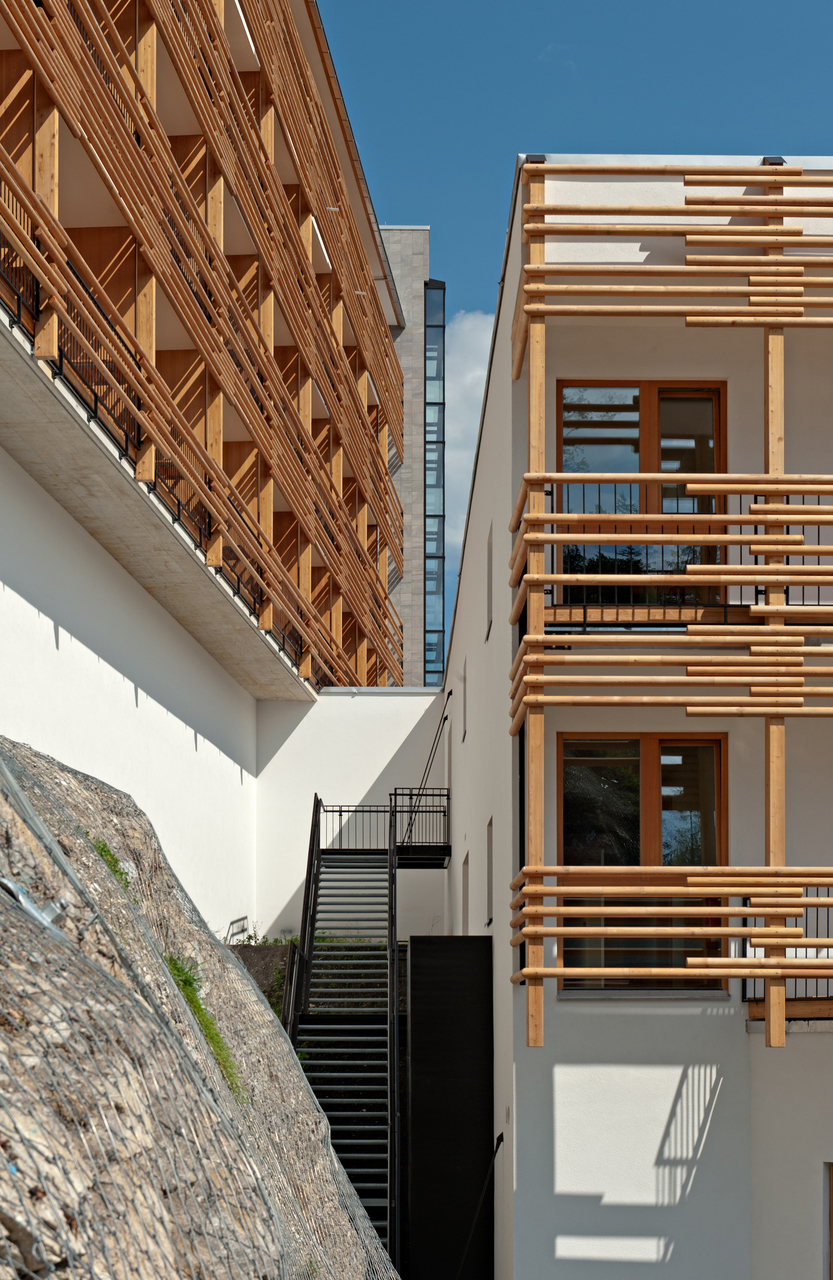 Damit eine ortsübliche, homogene Siedlungsstruktur gewährleistet wird, war es notwendig, die Sockelgeschoße als kultivierte Terrassen auszuformen, welche sich durch ihr Erscheinungsbild mit dem Gelände verzahnen und sich somit die Proportionen des geforderten Volumens in einer natürlichen Weise verbessern. Die restliche Baumasse wurde in drei Baukörper gegliedert die sich in die aus der Historie gewachsene Bebauungsstruktur mit ihren Volumina integriert. Auch die Ausrichtung der Körper lässt durch ihre Verschränkung den Ostteil mit dem Westteil des Dorfes verschmelzen.