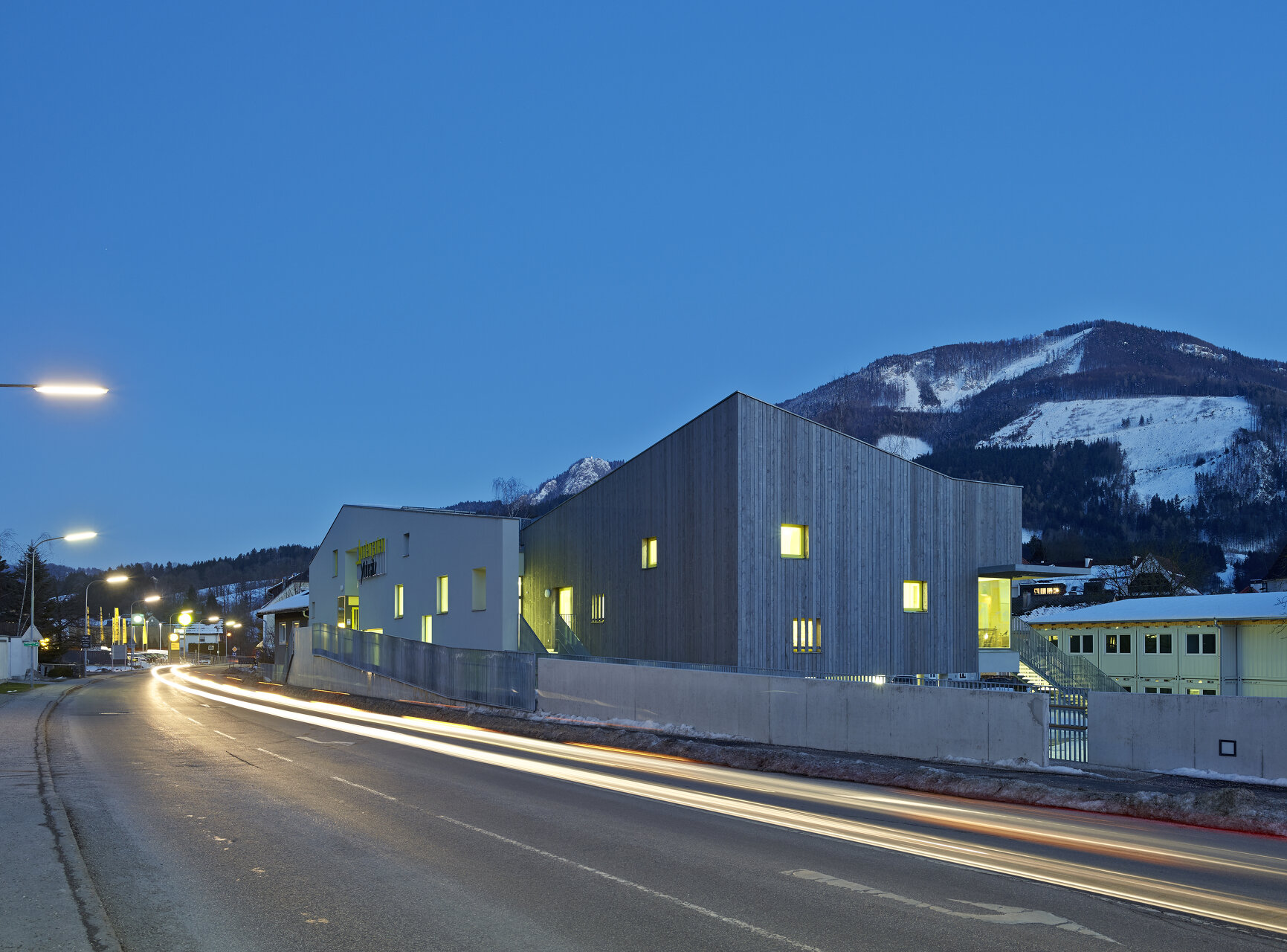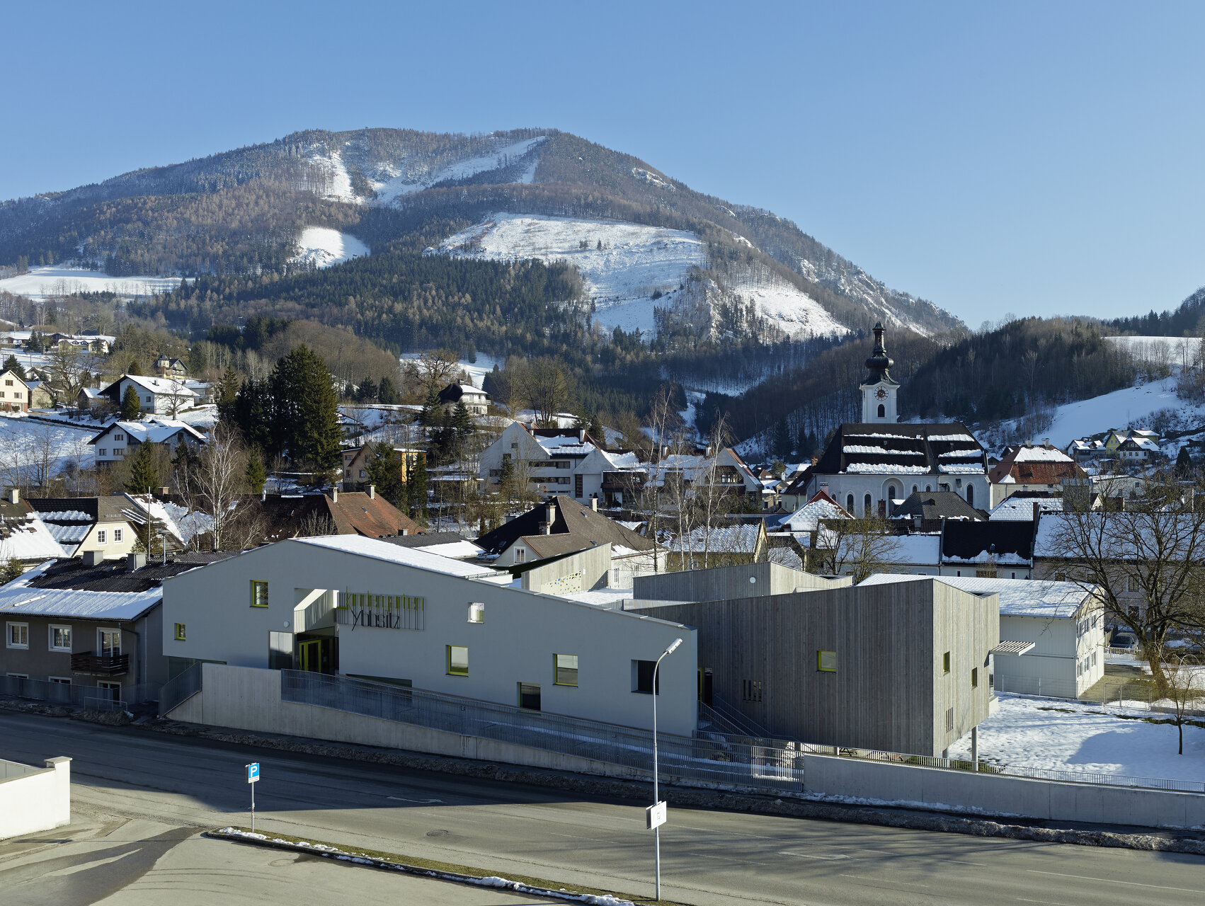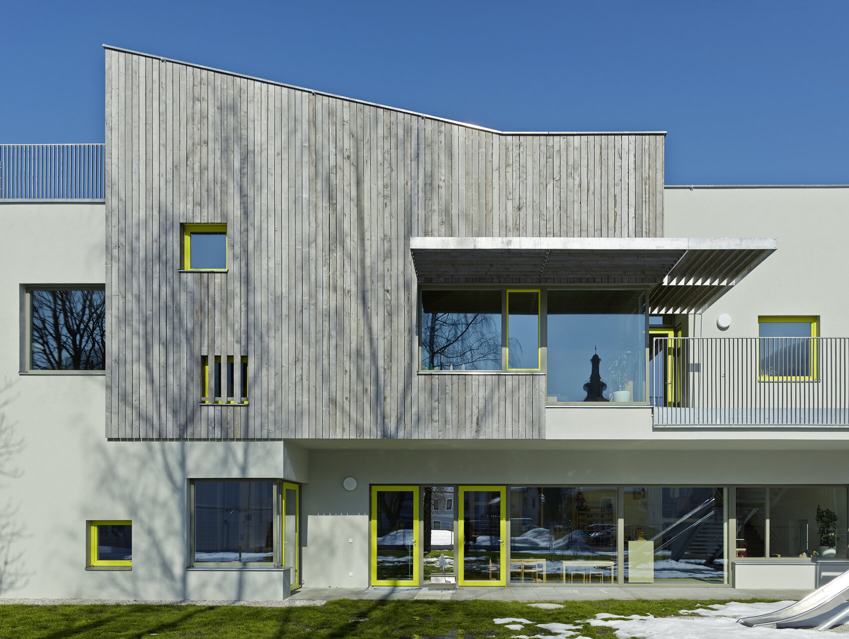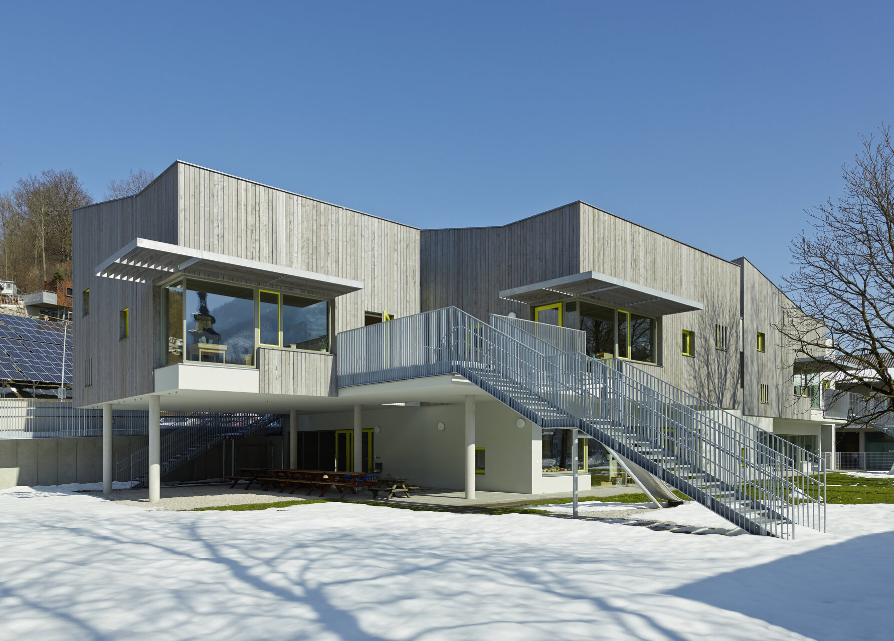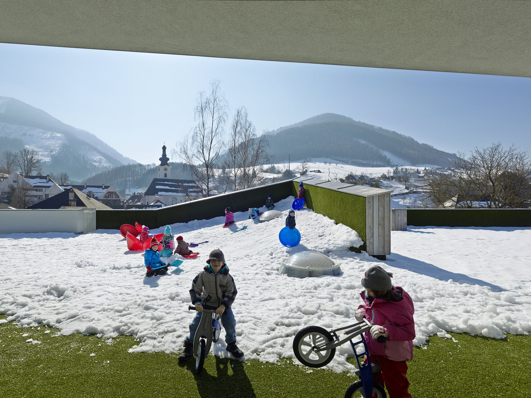 In der abwechslungsreich gestalteten geometrischen Großform des Kindergartens sind fünf Gruppen und zwei Bewegungsräume untergebracht. Der Sockel wurde als Massivbau und das Obergeschoß als Holzbau mit Lärchenholzfassade errichtet. Beide Ebenen können barrierefrei erreicht werden: straßenseitig die obere Etage über eine 30 m lange Rampe, von der anderen Seite direkt über den Dorfplatz das Erdgeschoß. Außenseitig liegt ein helles Stiegenhaus. Hausintern gibt es zur inneren Erschließung zwischen den Etagen filzbezogene Stufen, die von den Kindern gerne zum Spielen genutzt werden. An der dorfzugewandten Seite führt eine Aluminiumrutsche direkt in den Garten.