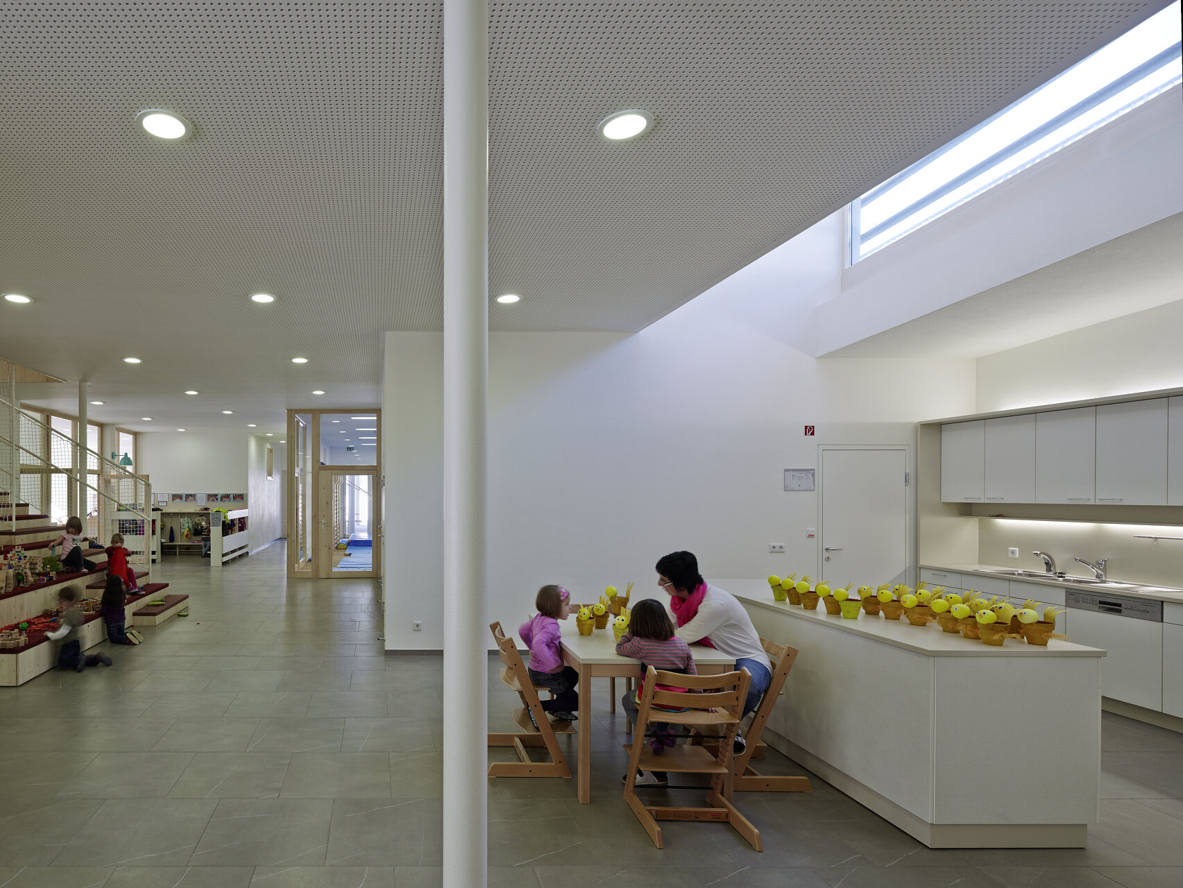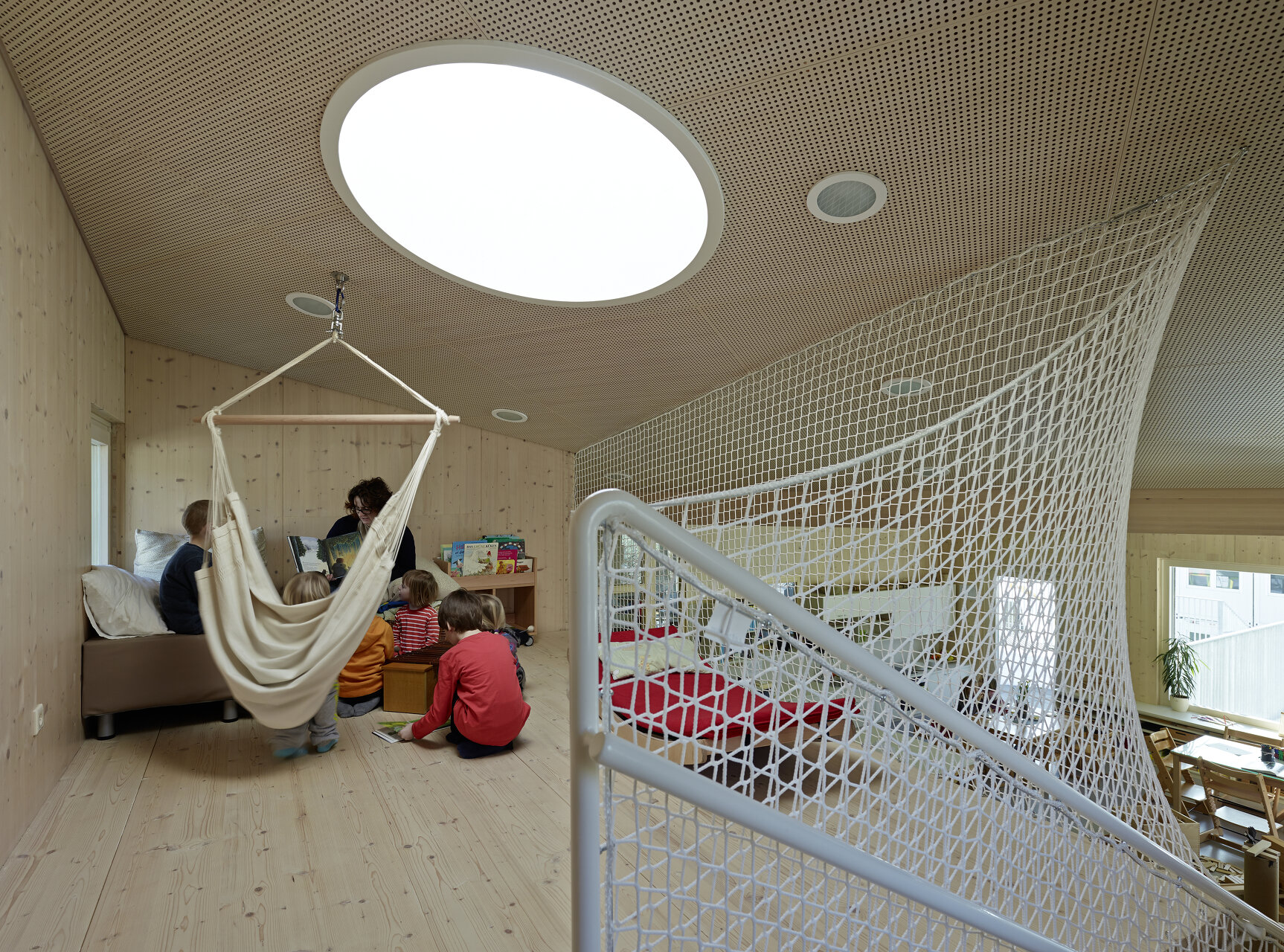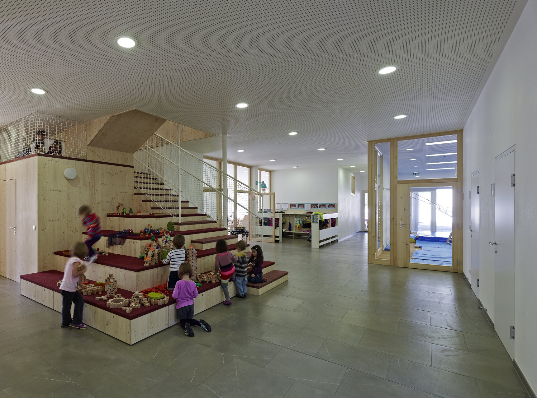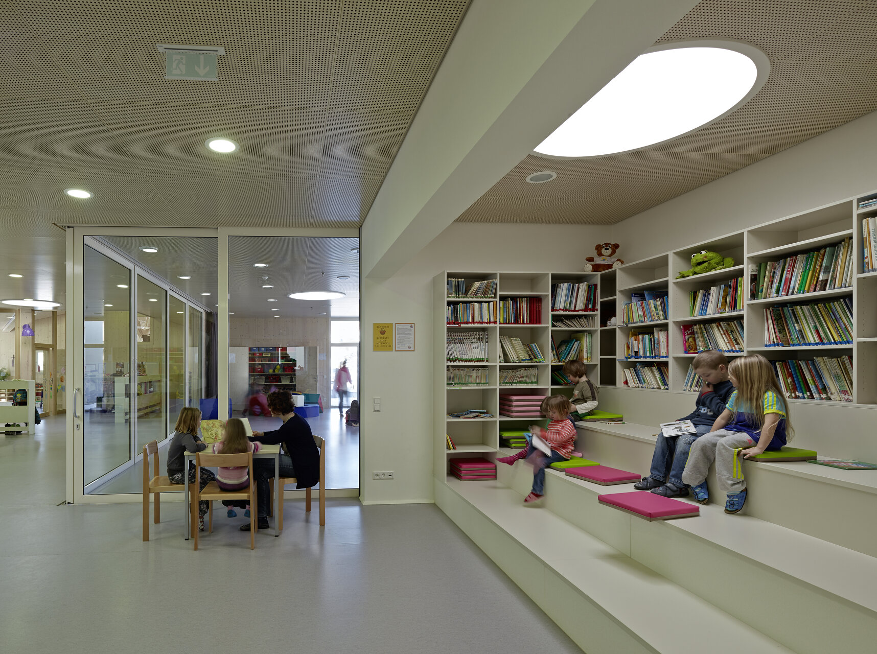 Gemeinsam genutzte Plätze wie etwa die Bibliothek, die mit breiten Holzstufen davor zum Lesen gleich vor Ort einlädt, fördern die Gemeinschaft. Das Prinzip des Forums oder Marktplatzes zieht sich von der Anordnung der Kindergartengruppen im Haus über ihre jeweilige interne Gestaltung durch: vom gemeinsam „Öffentlichen“, wo gegessen oder gespielt wird, bis zum privaten Rückzugsraum in „Nestern“ auf einer geschützten Galerie oder in den darunterliegenden „Höhlen“. Jeder Gruppe vorgelagert ist eine Tageslichtkuppel. Die Farben der Lampen am Zugang sind optisches Unterscheidungsmerkmal.