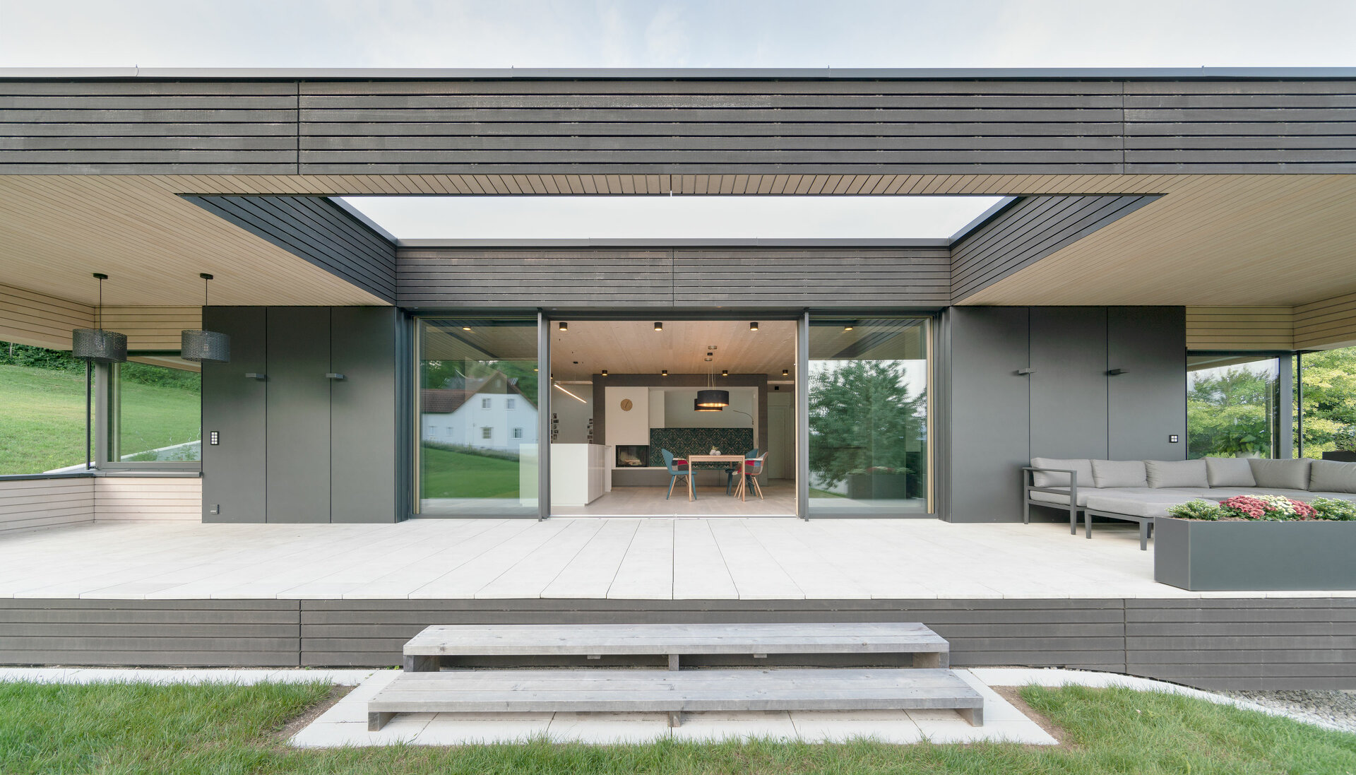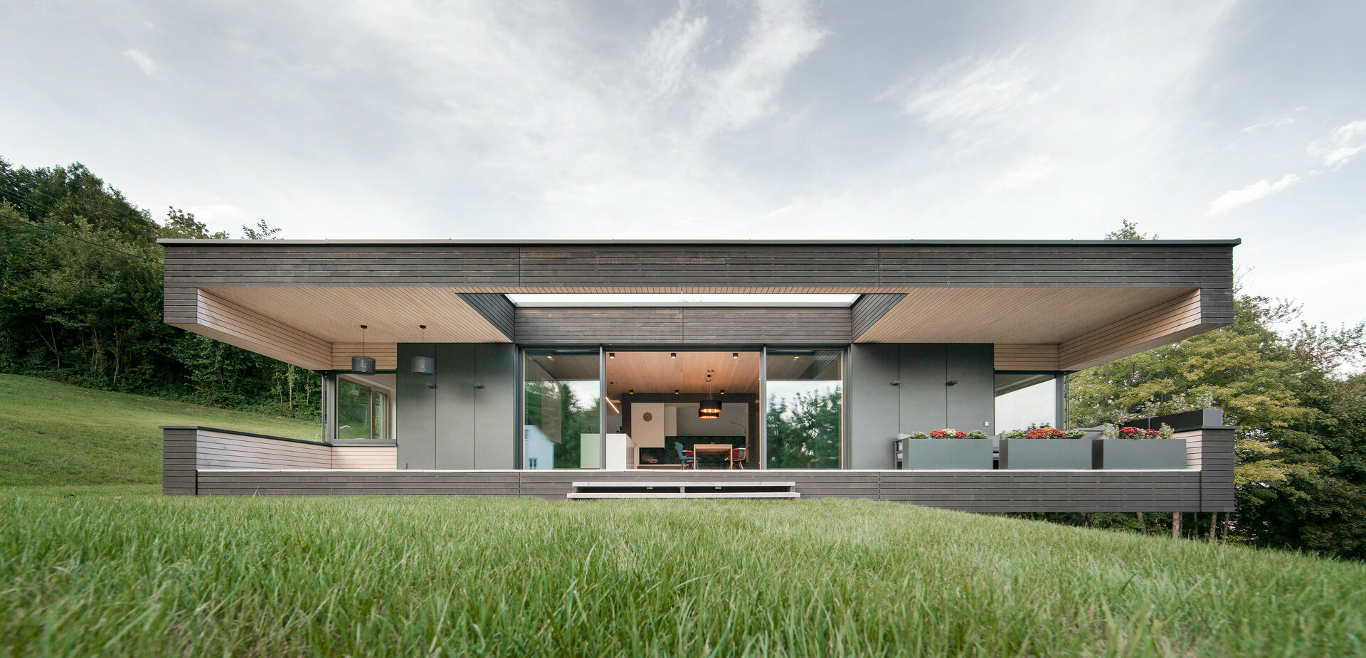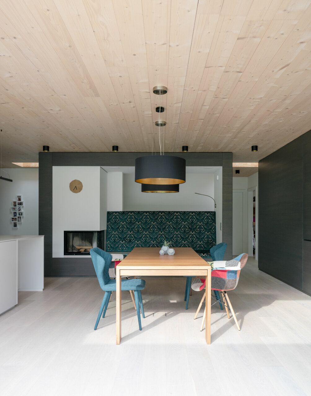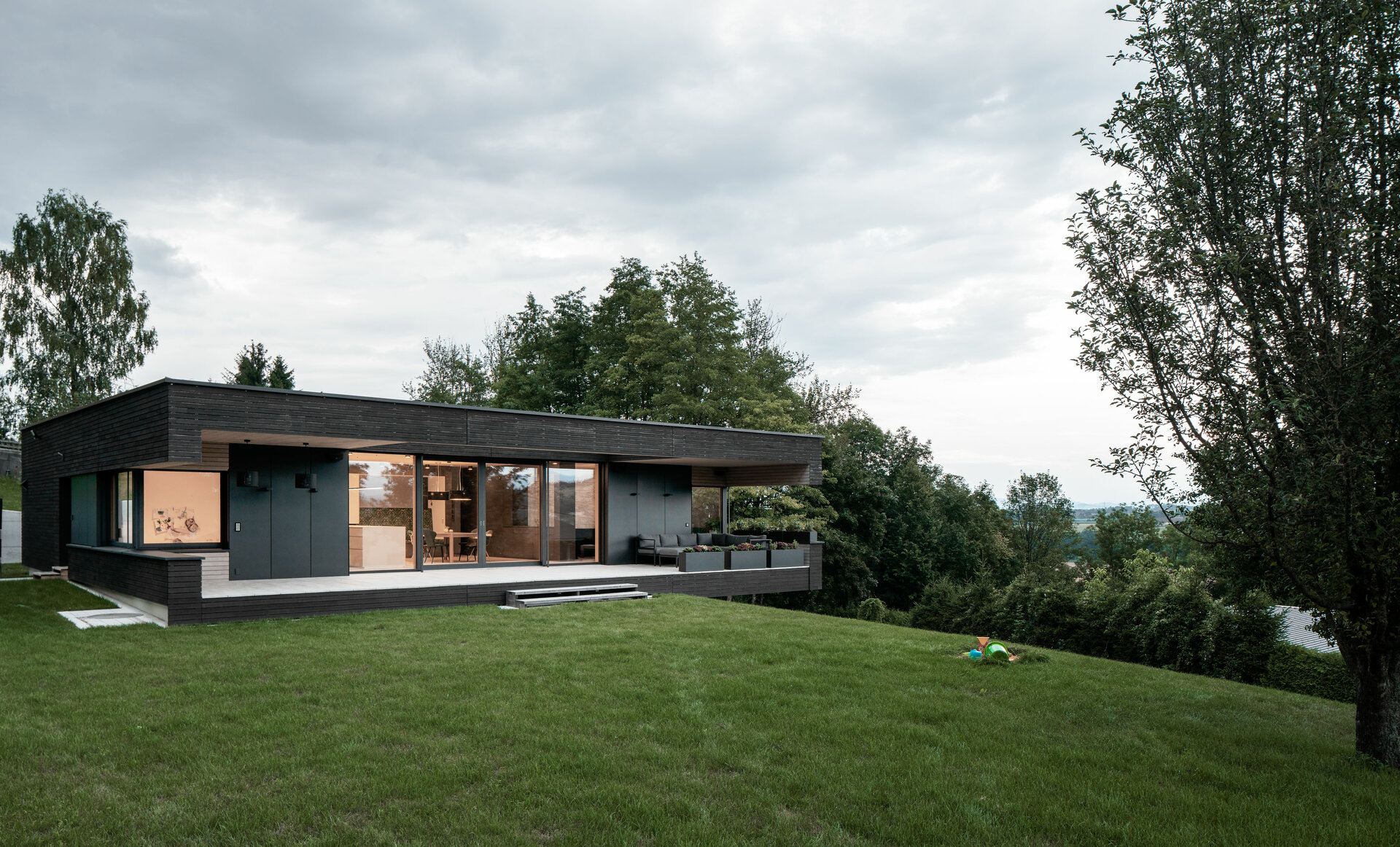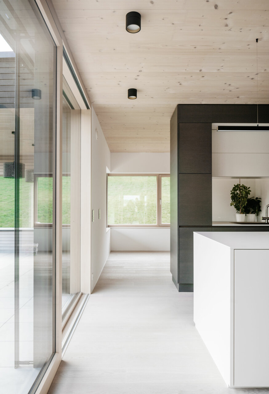 Der Holzbau berührt das Gelände im Norden und eröffnet eine Eingangs- und Serviceebene im Keller. Die Holzkonstruktion ist komplett vorgefertigt und vor Ort montiert, was sie nachhaltig und effizient im Bauprozess macht. Helles Holz als Hauptmaterial von Boden und Decke definiert die Atmosphäre im Haus und wird durch dunkel gefärbte Holz- und Faserzementplatten für die Fassade kontrastiert. Die offenen und hellen Innenräume der Villa werden durch die Materialpalette weiter hervorgehoben. Ein Holzboden und eine passende Decke lassen die Zimmer hell und großzügig wirken. Die funktionalen Volumina, die den zentralen Wohnbereich trennen, sind in dunklem Holz materialisiert, welches ihren einzigartigen Zweck im Raum hervorhebt. Sämtliche Materialien, Texturen, Farben und der offene Grundriss lassen die Villa großzügig aber auch kompakt wirken. (Text: Architekt:innen)
