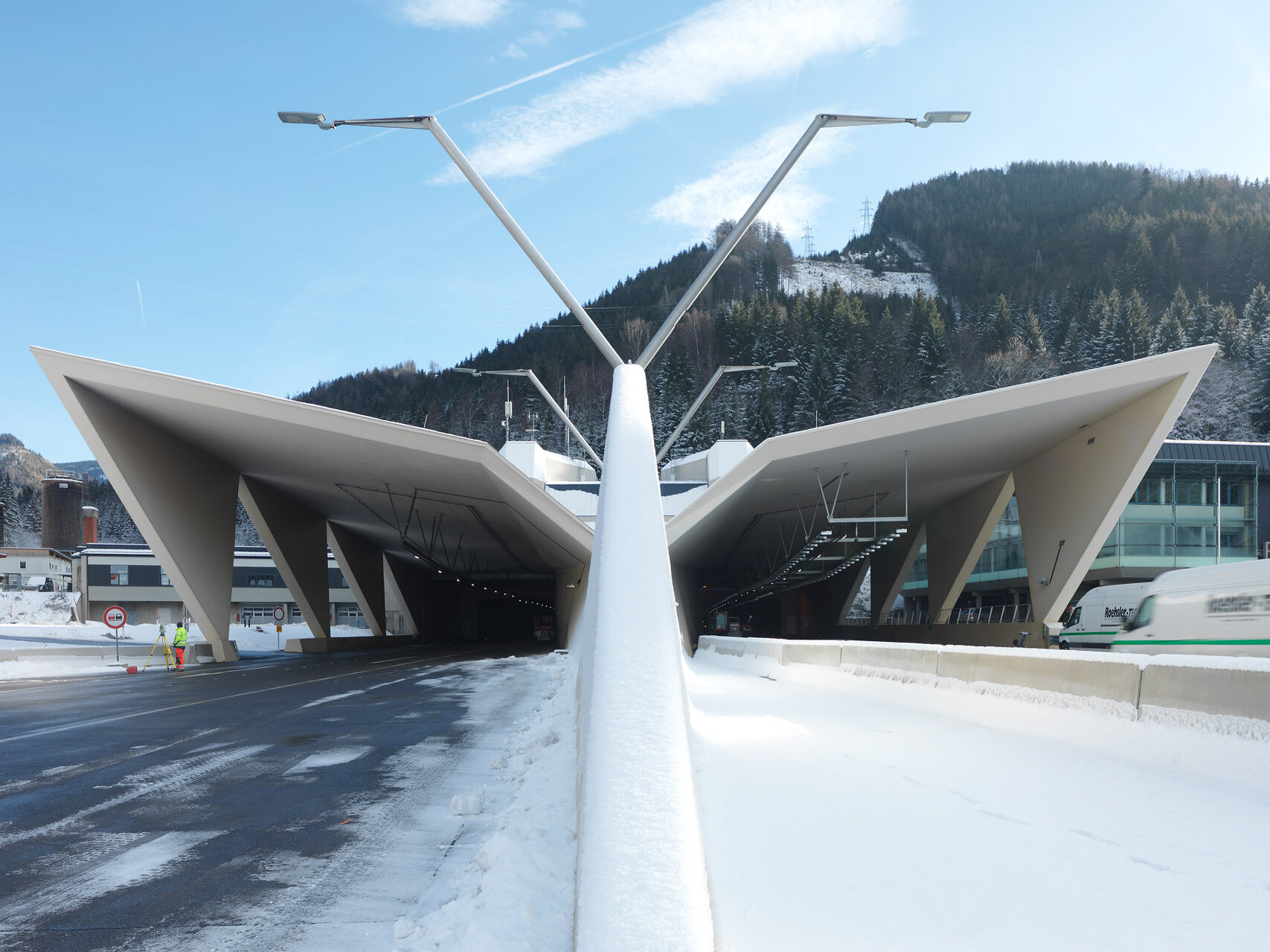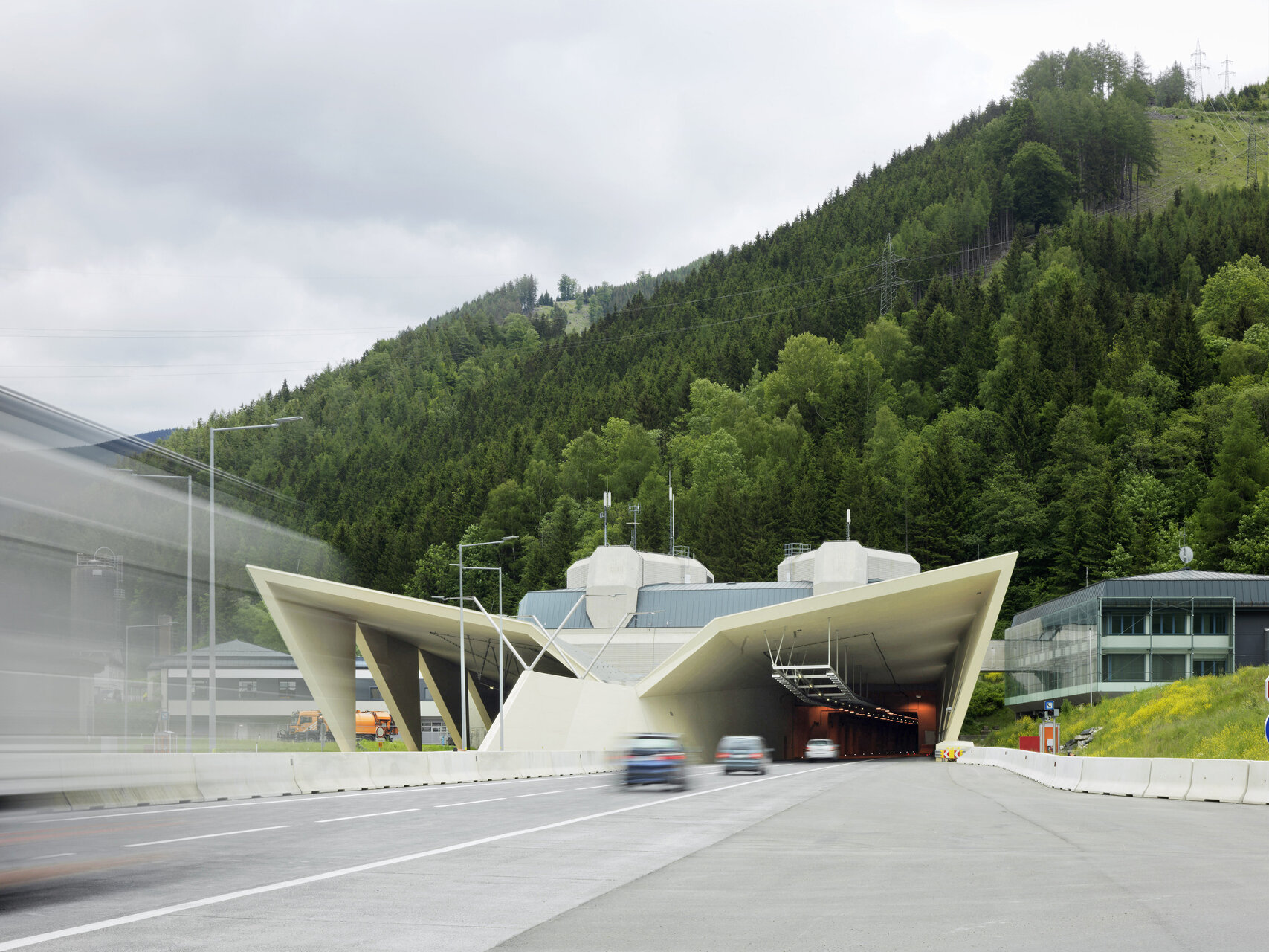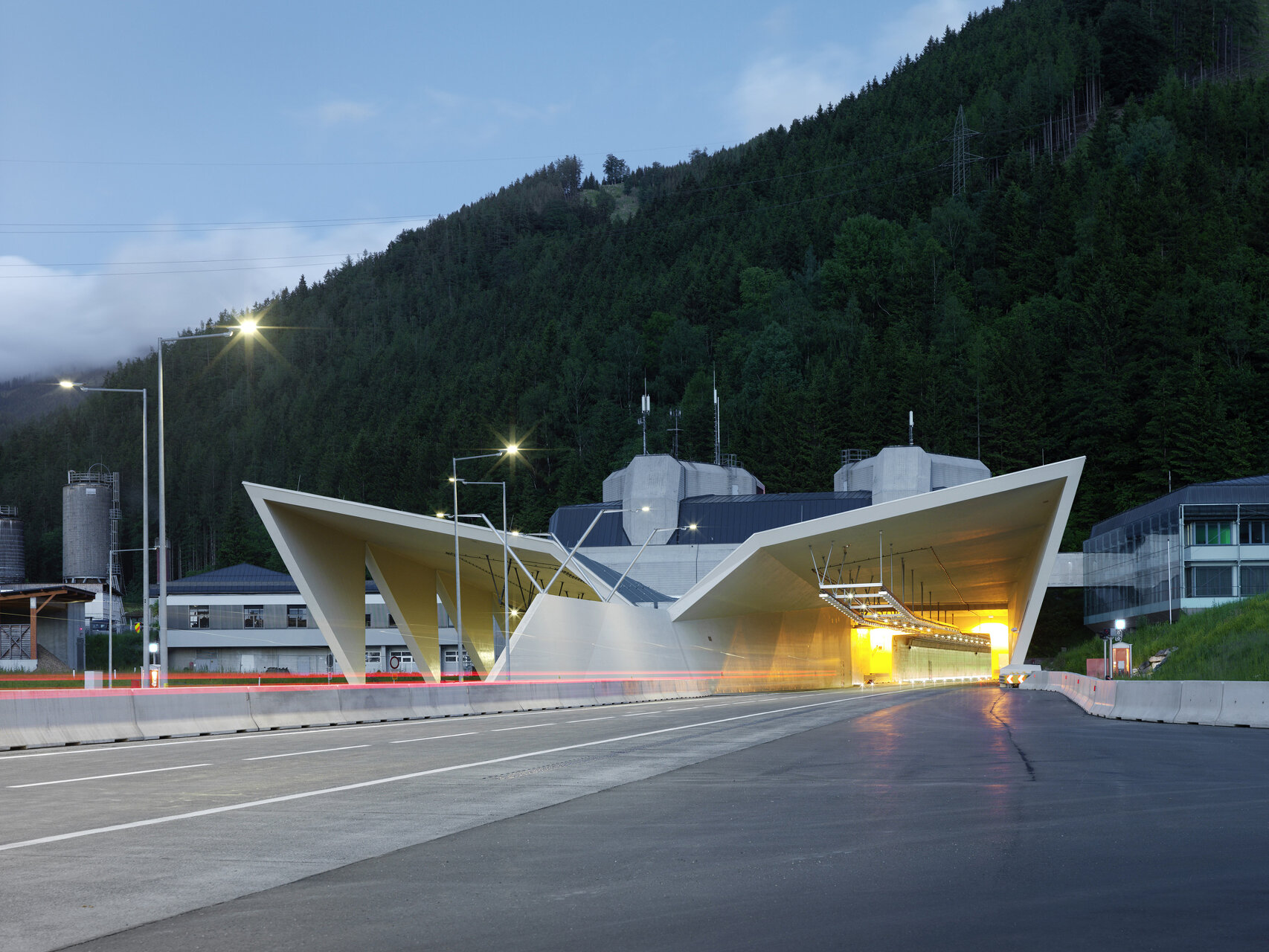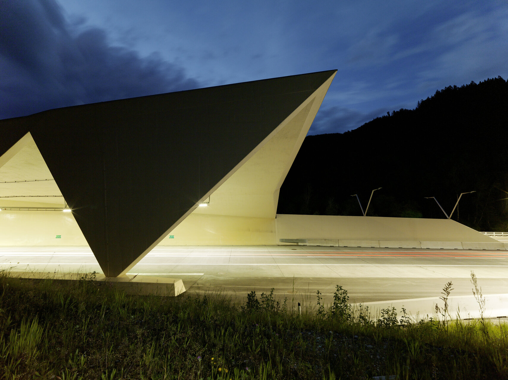 Das Dach faltet sich in Dreiecken in die Höhe, in Zacken verlaufen auch die äußeren Wandelemente, die auf brüstungsartigen Scheiben aufgelagert sind und gleichzeitig vor Schneeverwehungen schützen. Diese dreieckigen Ausschnitte werden zum Tunnel hin immer kleiner um den Übergang von Tages- zu Kunstlicht anzupassen. Innenwände von Tunneln sind standardmäßig mit einem hellen Farbton versehen, diese Beschichtung wird für die neue Portal-Aufweitung innen wie außen übernommen. Die 70 Meter entfernt stehenden Lüftungstürme sind aus Stahlbeton mit Sichtbetonqualität und nicht beschichtet. (Text: Martina Pfeifer Steiner)