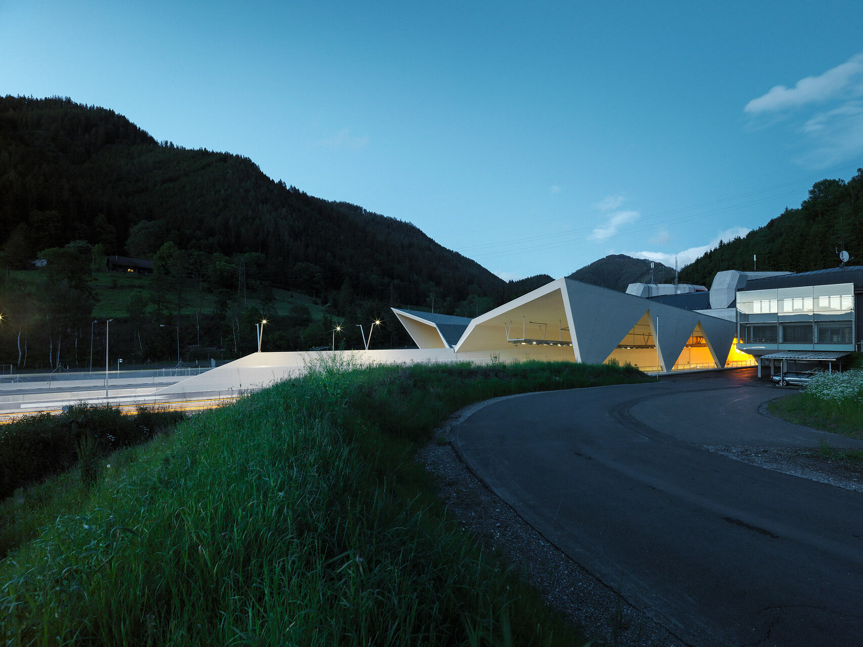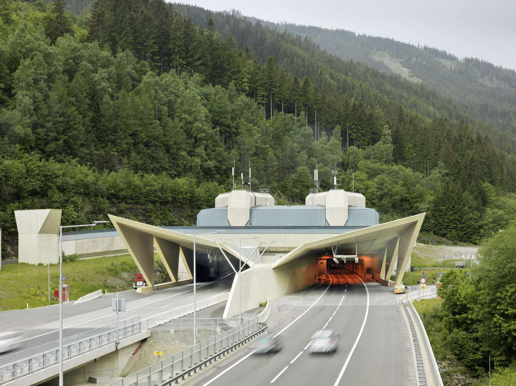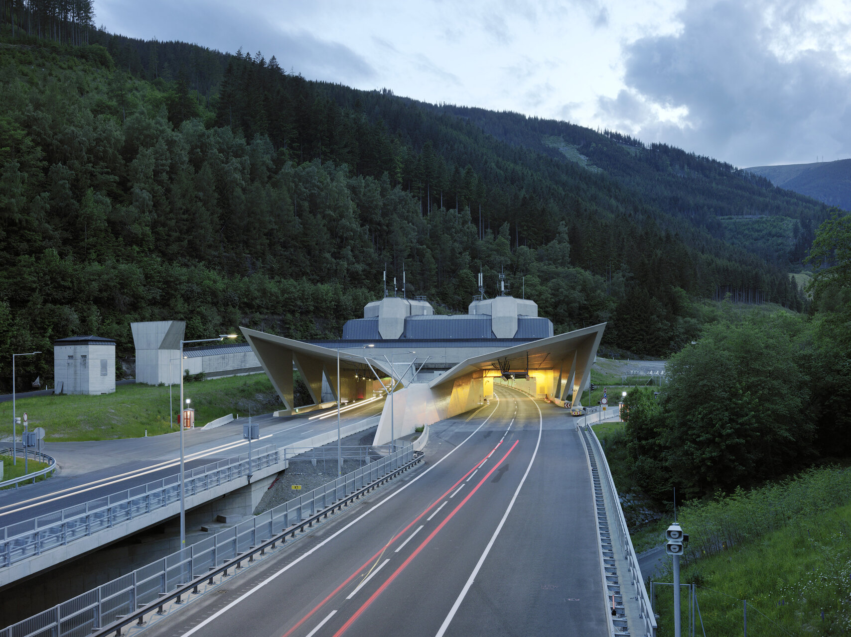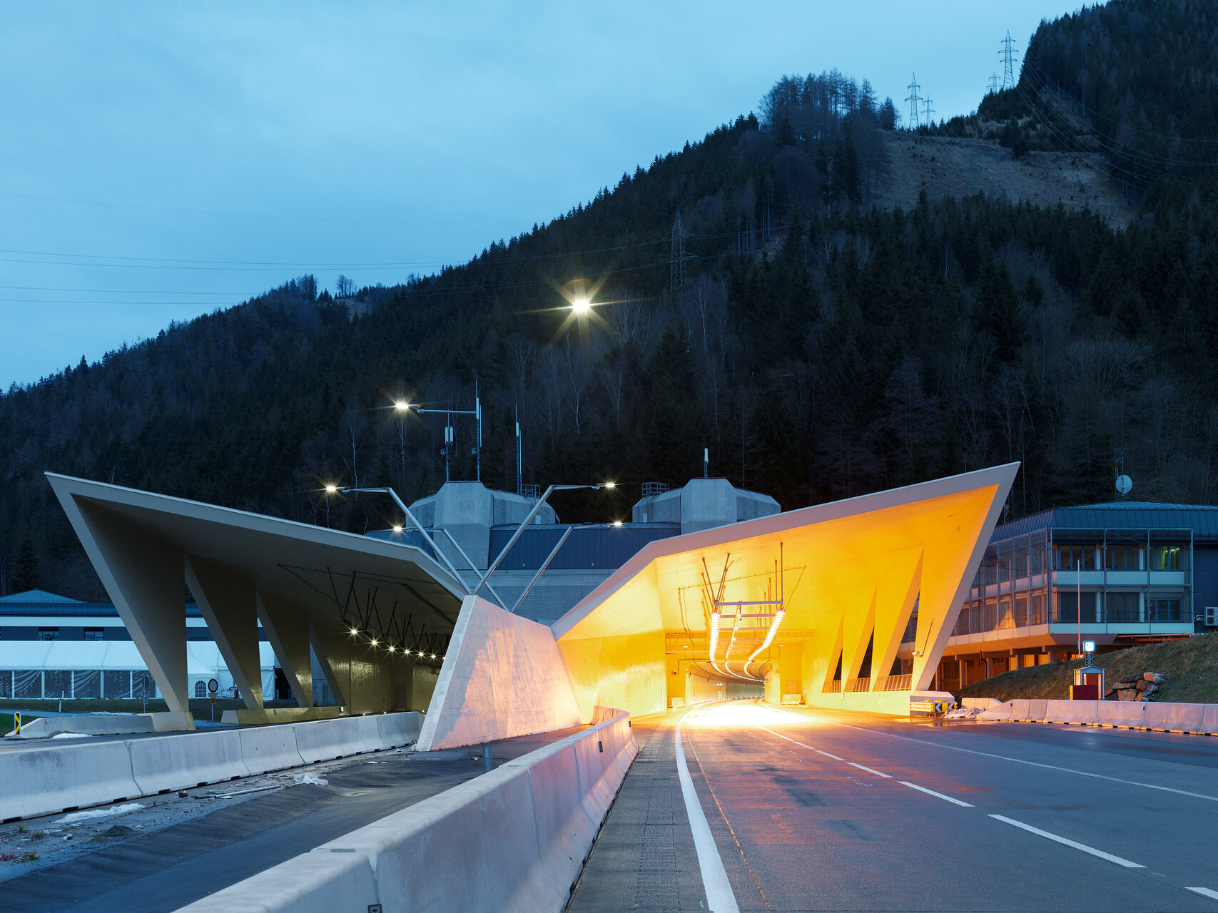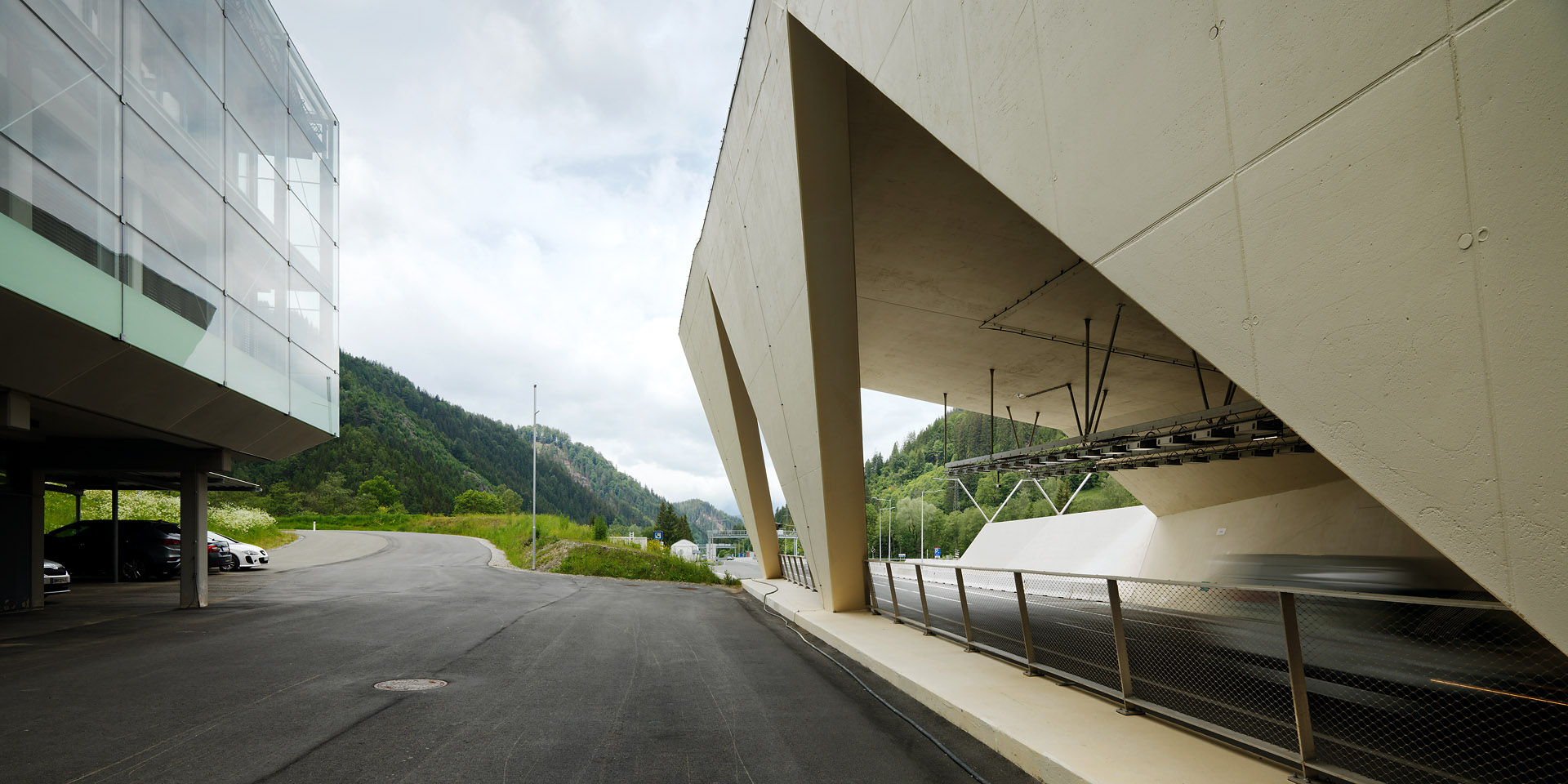 Das Dach faltet sich in Dreiecken in die Höhe, in Zacken verlaufen auch die äußeren Wandelemente, die auf brüstungsartigen Scheiben aufgelagert sind und gleichzeitig vor Schneeverwehungen schützen. Diese dreieckigen Ausschnitte werden zum Tunnel hin immer kleiner um den Übergang von Tages- zu Kunstlicht anzupassen. Innenwände von Tunneln sind standardmäßig mit einem hellen Farbton versehen, diese Beschichtung wird für die neue Portal-Aufweitung innen wie außen übernommen. Die 70 Meter entfernt stehenden Lüftungstürme sind aus Stahlbeton mit Sichtbetonqualität und nicht beschichtet. (Text: Martina Pfeifer Steiner)