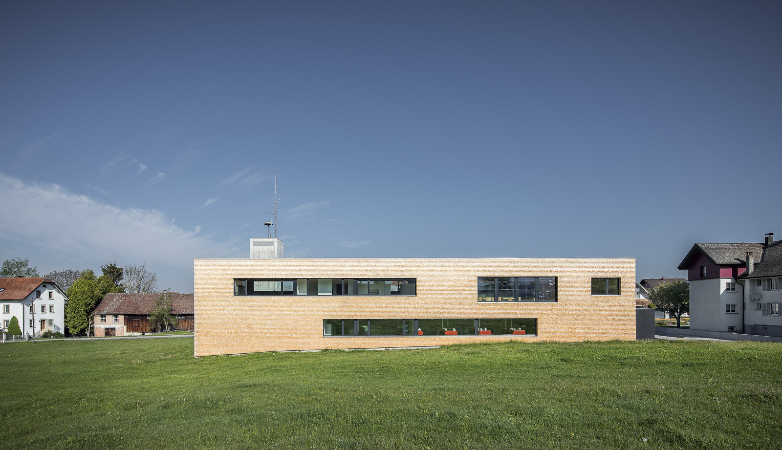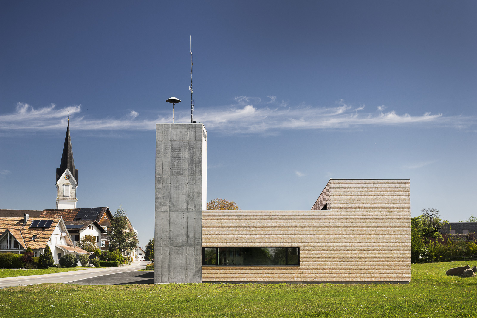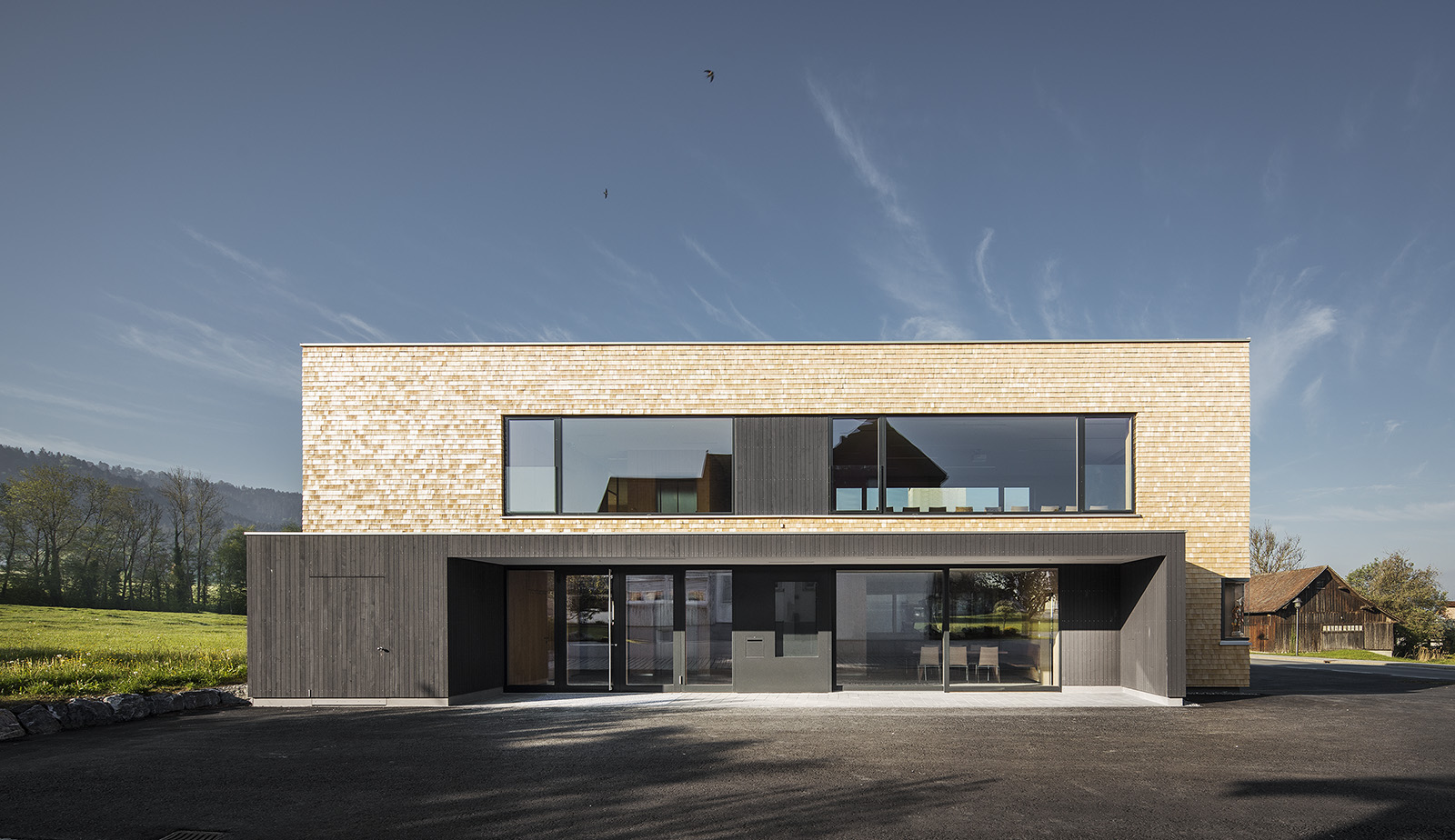 Der mit Schindeln verkleidete zweigeschoßige Baukörper schließt nach Norden Richtung Ortszentrum und nach Osten zu den freien Weideflächen ab. Seine L-Form fasst den überhohen eingeschoßigen Garagentrakt ein. Der Turm in Stahlbeton mit Holzausfachung markiert die Ecke Richtung Ortsausgang.