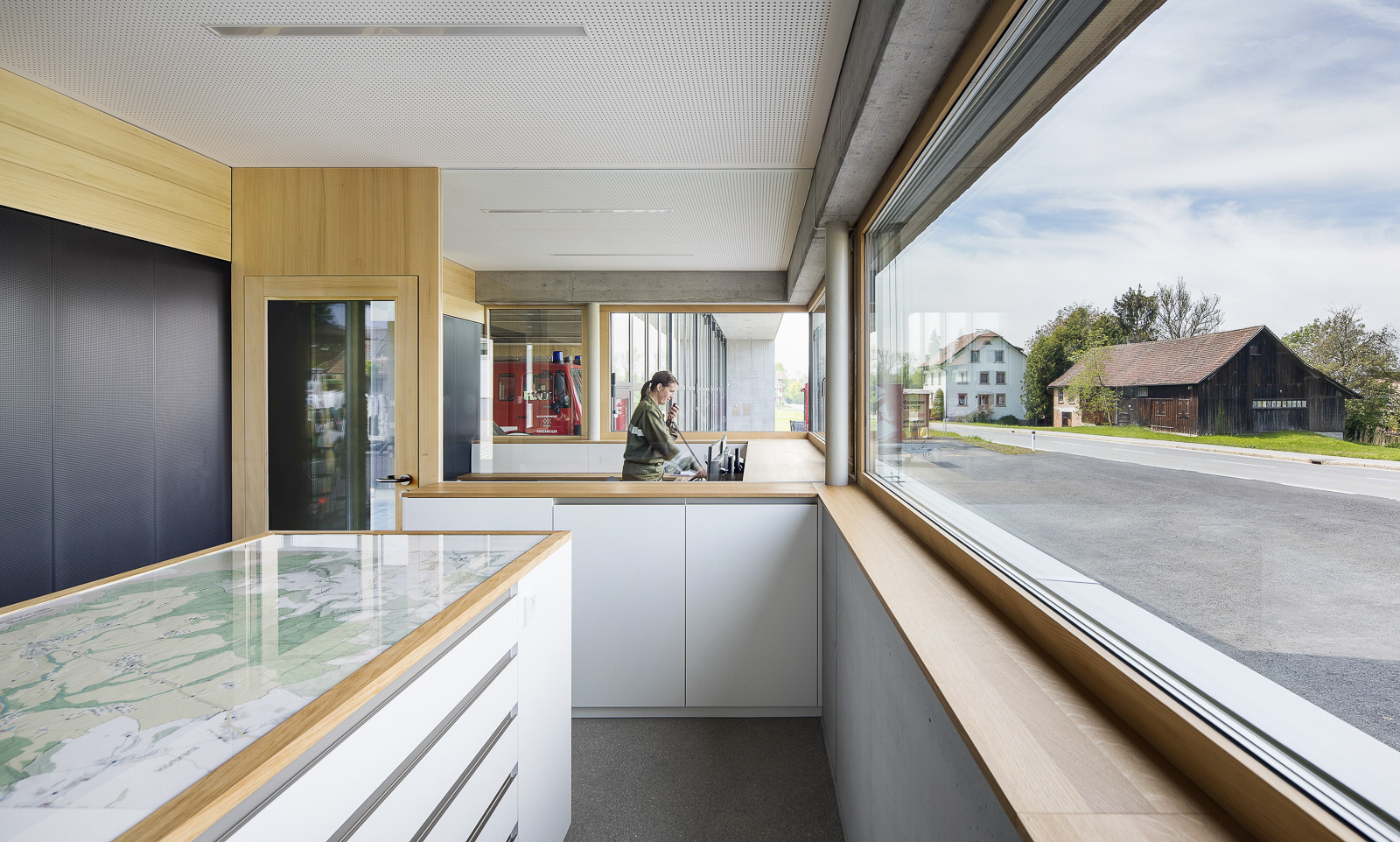 Der Neubau ist in massiver Bauweise erstellt. Die Oberflächen der Aufenthalts- und Schulungsräume sind großteils in Weißtannentäfer ausgeführt, das aus den eigenen Waldbeständen der Feuerwehrmitglieder stammt. Werkstätten- und Garagenbereiche bilden eine robuste und dauerhafte Kombination aus Beton und Stahl.