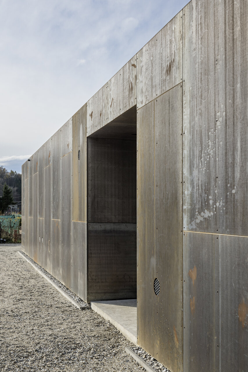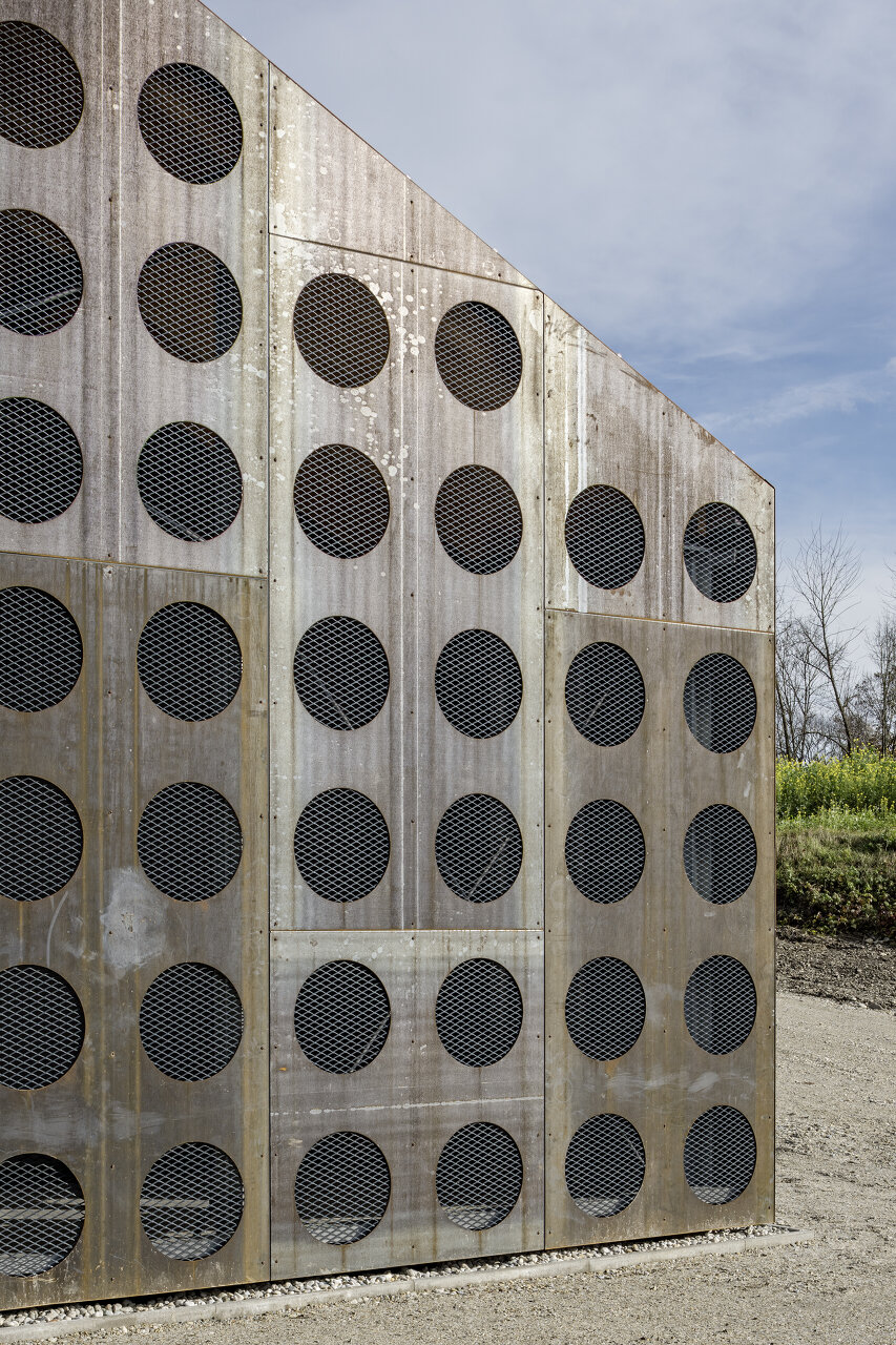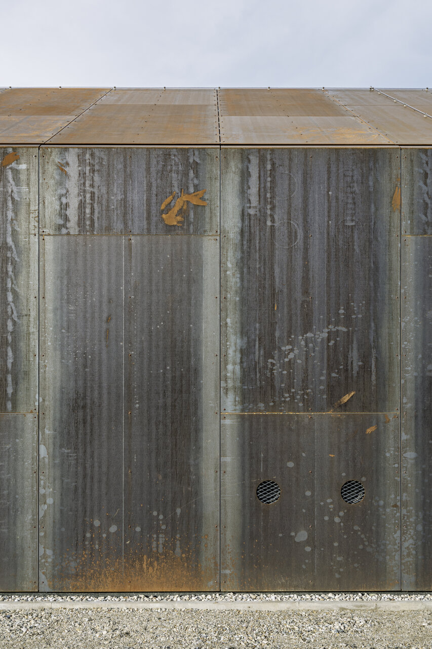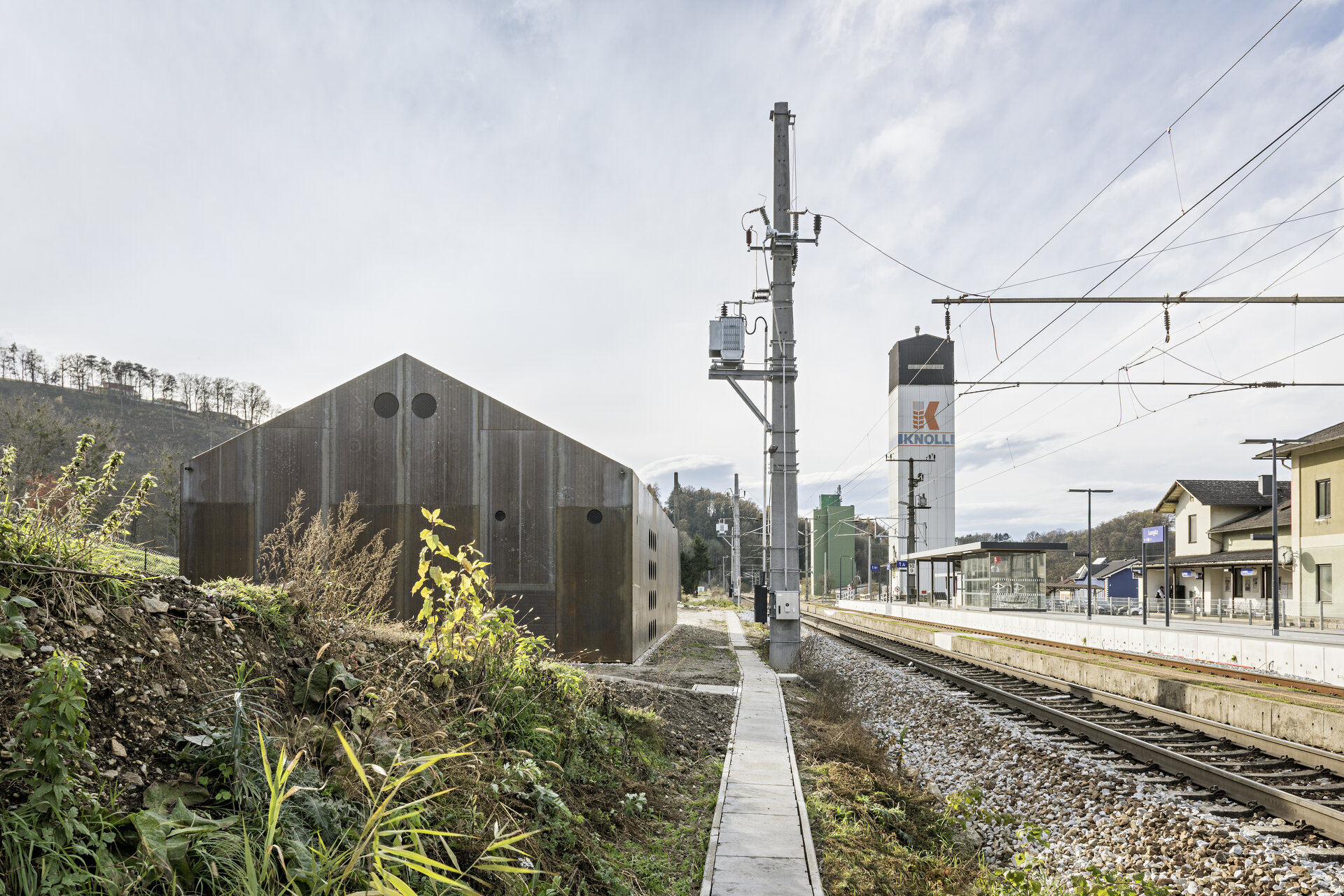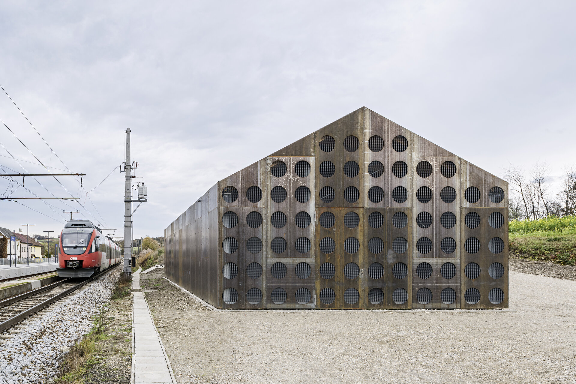 Das gesamte Gebäude ist in Corten-Stahl Platten gehüllt: an den Außenwänden als hinterlüftete Fassade, bei den Dachflächen als Verkleidung des mit Abdichtungsfolie gedeckten Satteldachs. Das Material wird mit der Zeit durch den Alterungsprozess die für Eisenbahnanlagen typische rotbraune Patina annehmen. Damit grenzt sich das Bauwerk klar von der Stahl-Glas Architektur der personenfrequentierten Bereiche ab. (Text: Architekt:innen, bearbeitet)