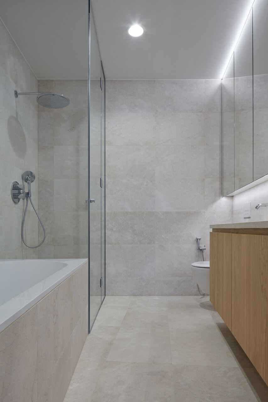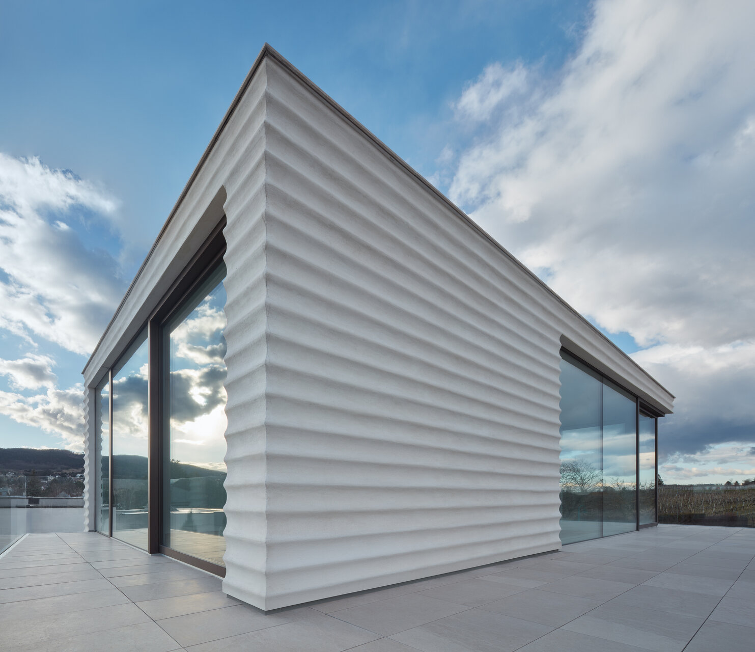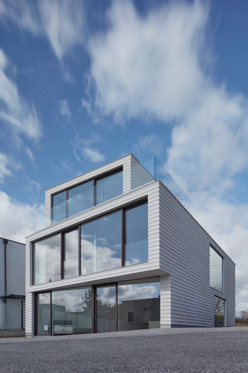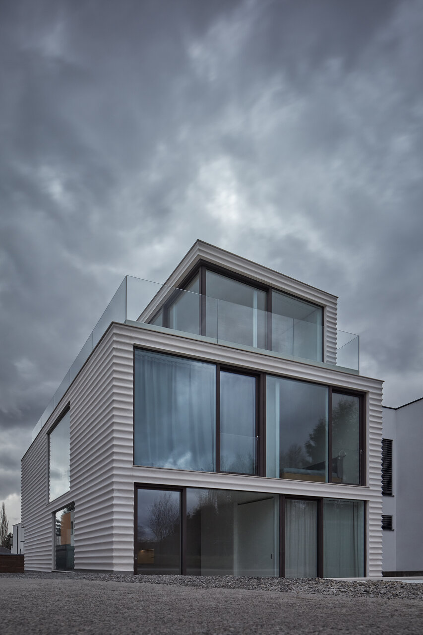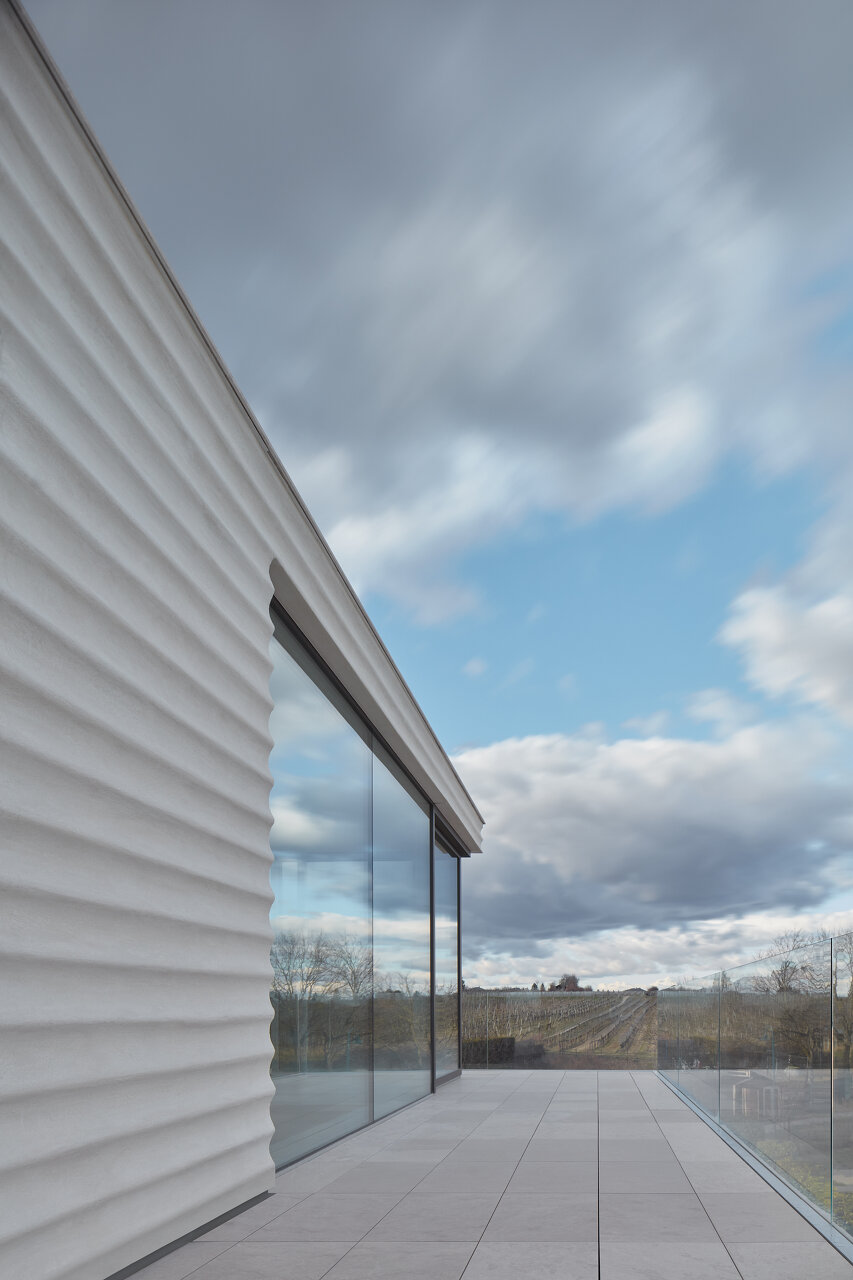 Vom intimen Eingang der Villa gelangt man zu großzügigen Wohnräumen mit einer durchdringenden Verbindung zum Außenraum. Das letzte Geschoss der Penthouse-Wohnung bietet schließlich einen Blick in die angrenzenden Weinberge.