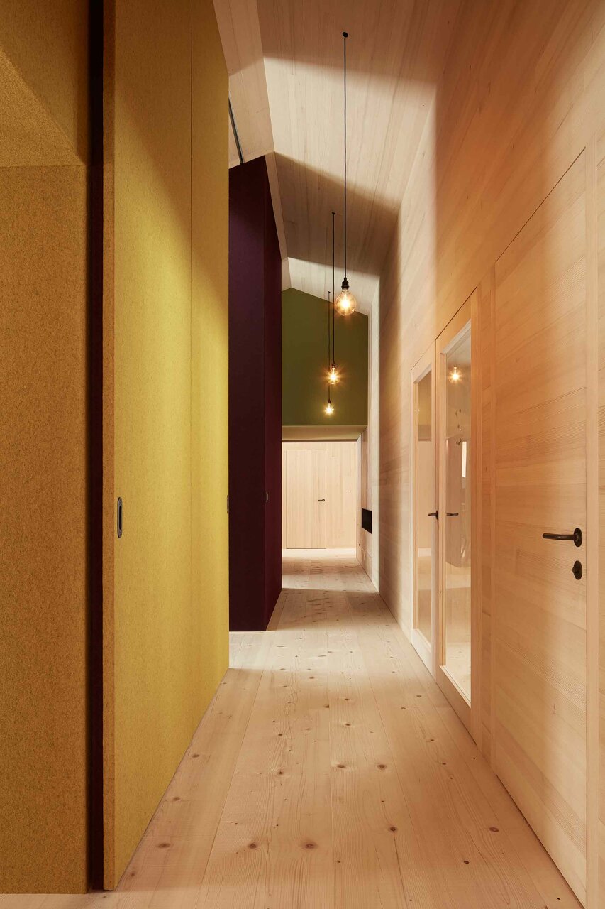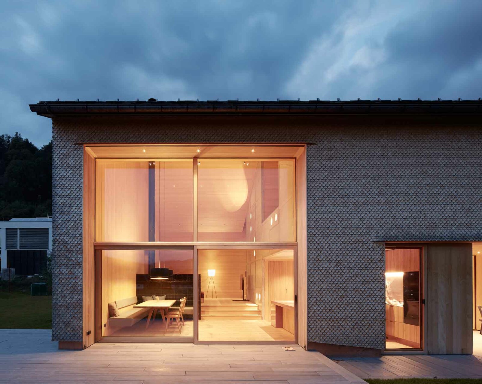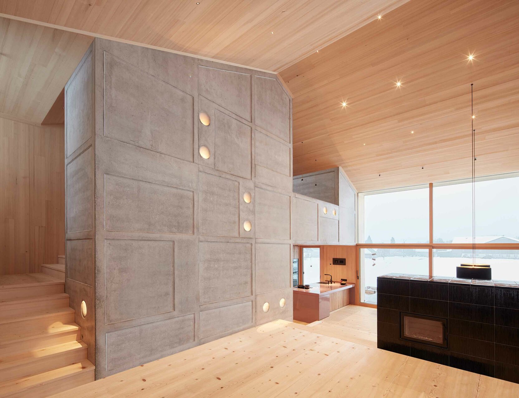 Ausgehend vom Schopf öffnet sich das Erdgeschoss zum Kochbereich. Dieser befindet sich wie traditionell üblich gleich beim Eingang. Mit einer geringen Raumhöhe und dem betonierten Kassettentäfer entsteht eine Übersetzung traditioneller Strukturen in eine neue Form, die den Charakter einer Stube in die Küche holt. Essen, Wohnen und Arbeiten entwickelt sich über die beiden Geschosse als offene Wohnlandschaft um den betonierten Kassettenkern. Durch das Spiel von unterschiedlichen Raumhöhen, kleinen Niveauunterschieden, dem Kamin und einem zentralen Kern wird der offene Wohnraum gegliedert und ermöglicht sowohl gezielte Ausblicke auf die umgebende Landschaft als auch Blickbeziehungen zwischen einzelnen Bereichen der beiden Geschosse.