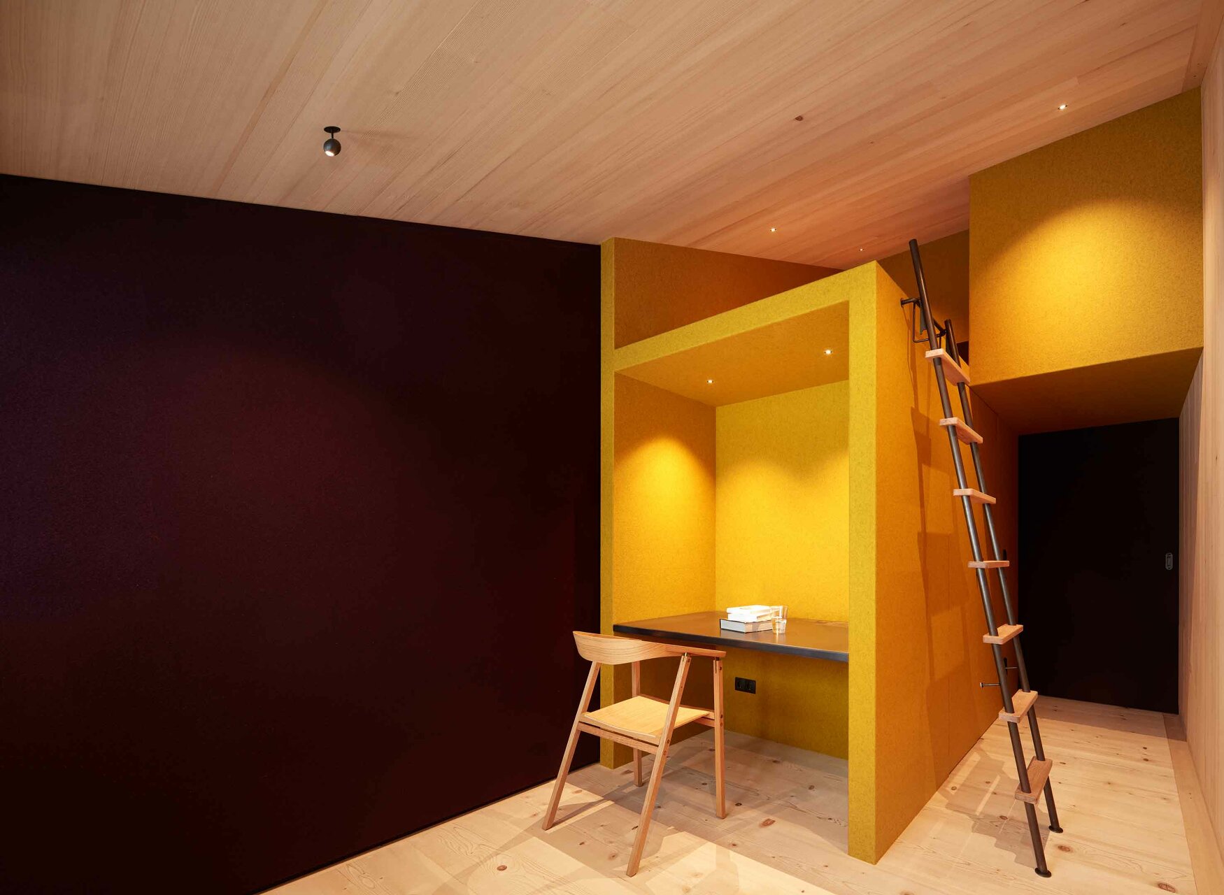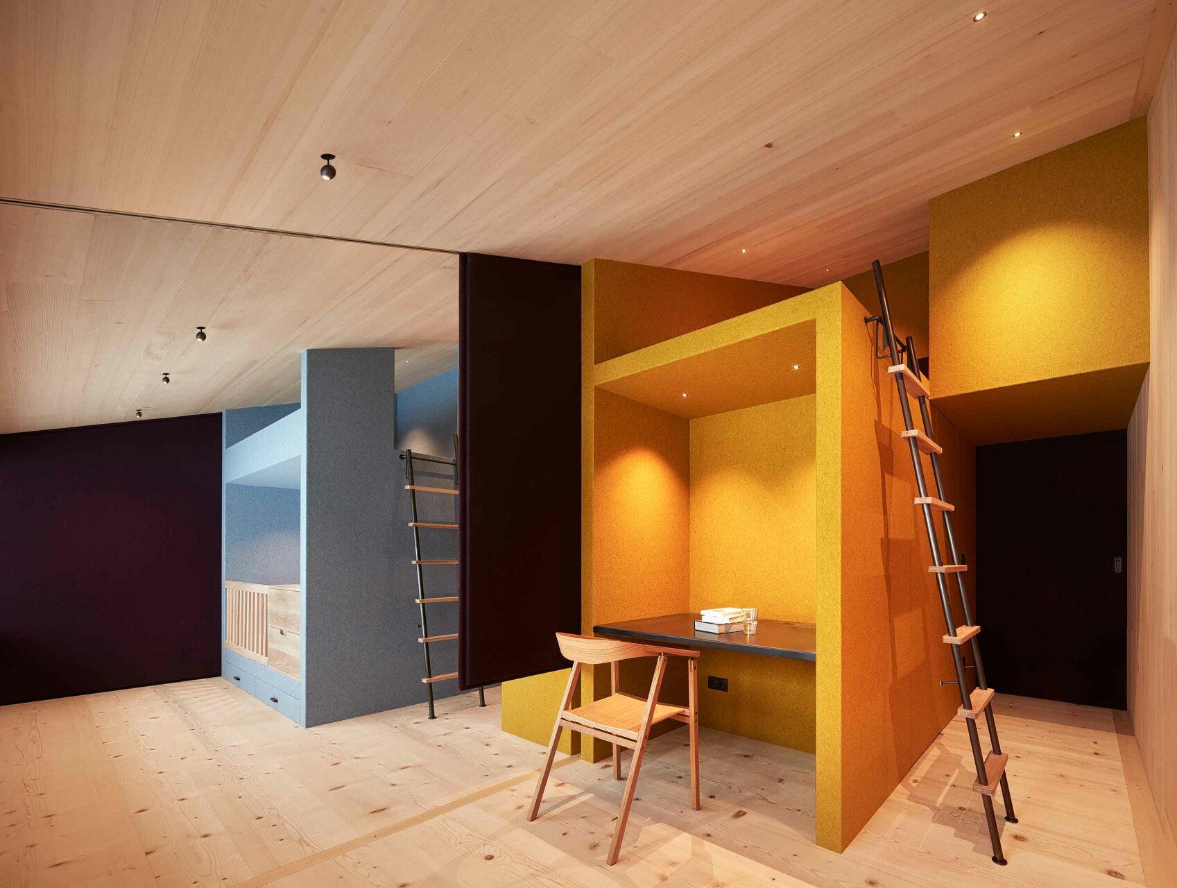 Das Obergeschoss setzt die offene Wohnlandschaft in einer intimeren Form fort und wird zum Spielraum für unterschiedliche räumliche Konstellationen. Der zentrale Kinderraum wird von vier Raumboxen gegliedert, die als plastische Körper auf zwei Ebenen Schlafen, Arbeiten und Stauen beinhalten. Die freie Anordnung im Raum schafft ein durchgängiges Raumgefüge, das sich nachts über Schiebetüren zu klassischen Räumen abtrennen lässt. Es entsteht ein Möglichkeitsraum für die unterschiedlichen Lebensphasen der Familie. (Text: Architekten, bearbeitet)