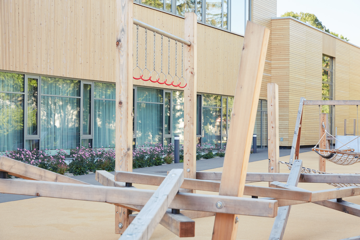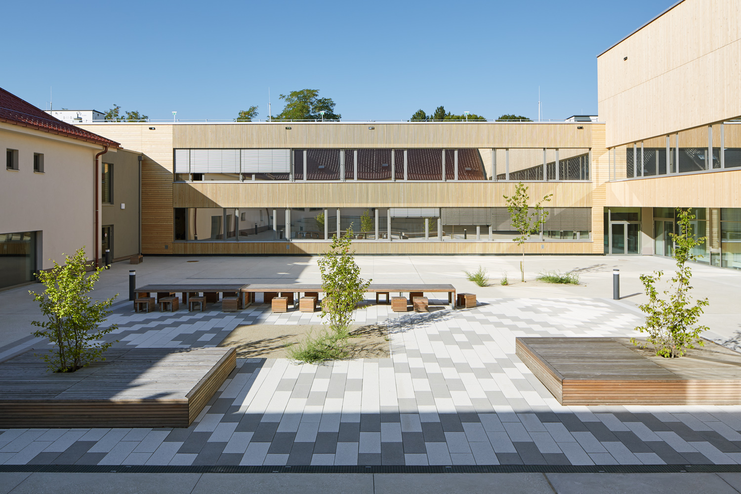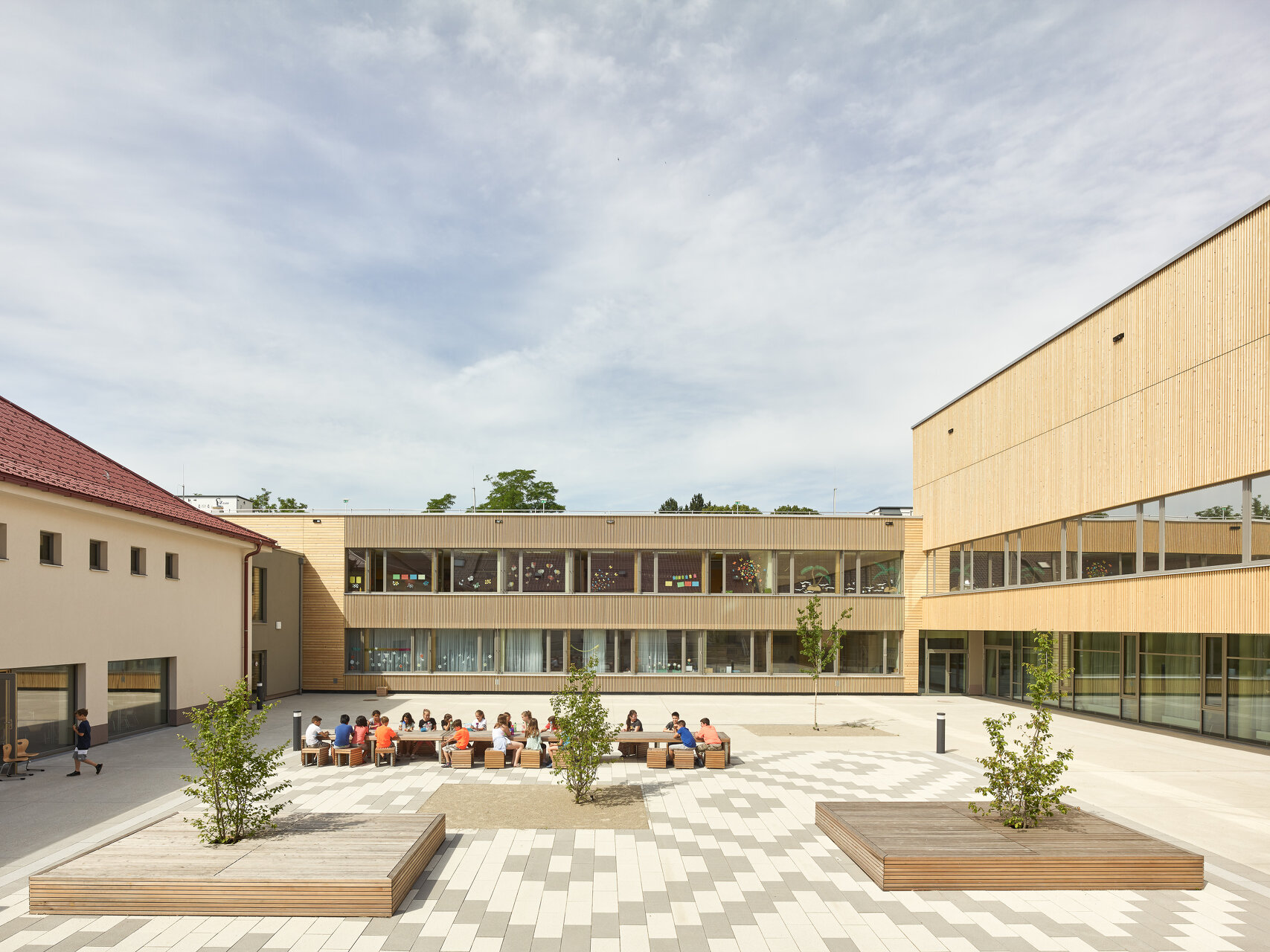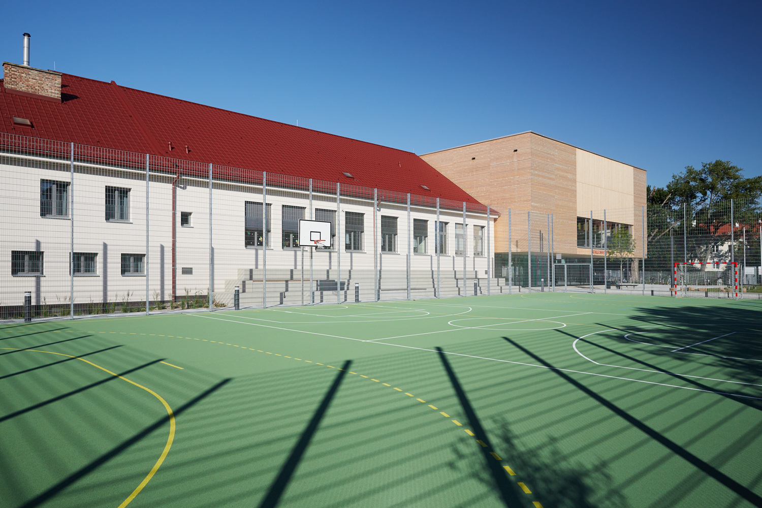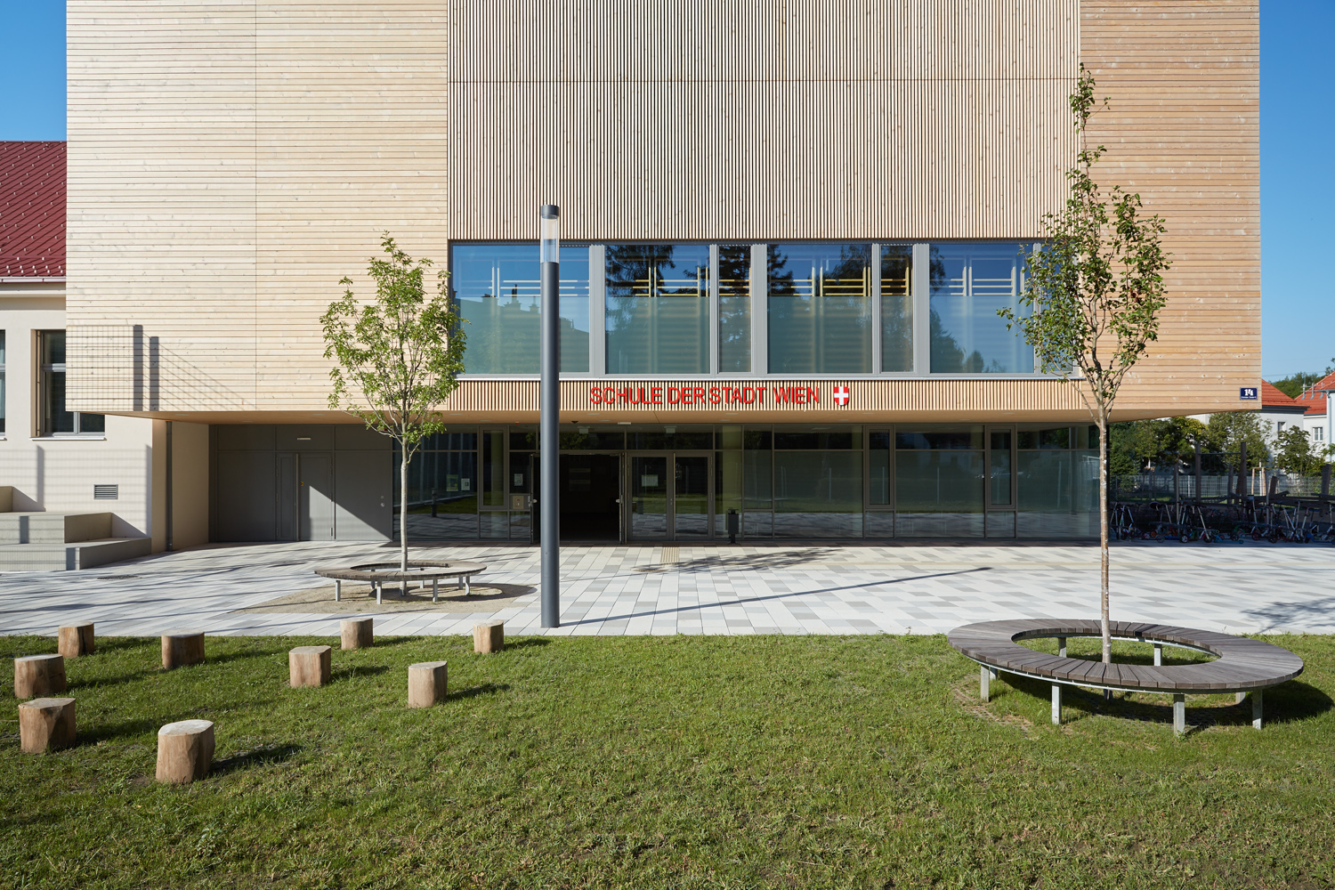 Als einer der ersten Schulbauten in Wien wurde der Neubau überwiegend aus Holz gebaut. Die Fassade ist mit horizontal und vertikal verlegten Fichtenholzlamellen und breiten Fensterbändern abwechslungsreich strukturiert. Die großzügigen Verglasungen im Erdgeschoss bringen Tageslicht ins Innere und verleihen dem kompakten Baukörper Leichtigkeit und Transparenz. Das begrünte Flachdach schafft ein angenehmes Mikroklima und reduziert die Wärmeabstrahlung.