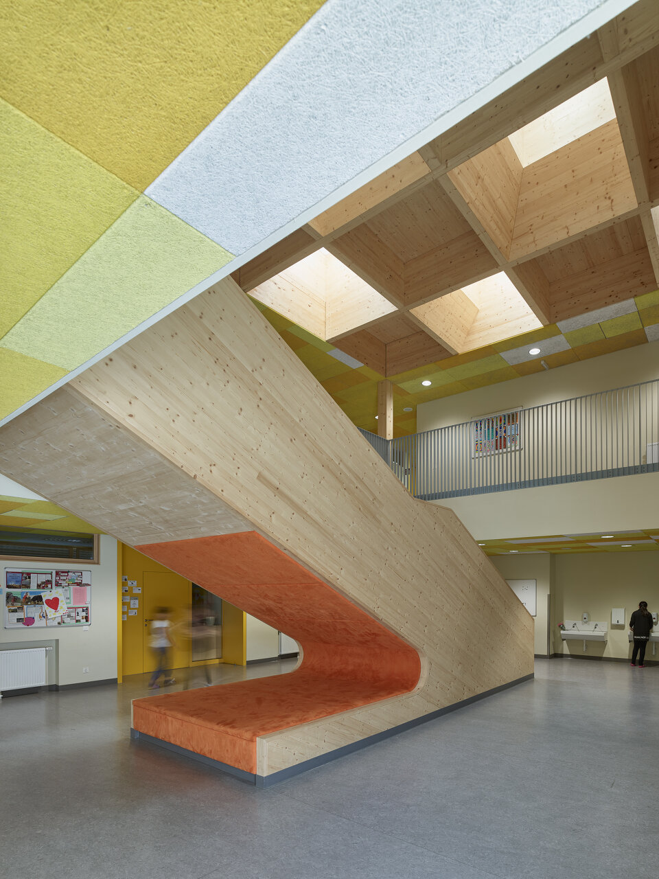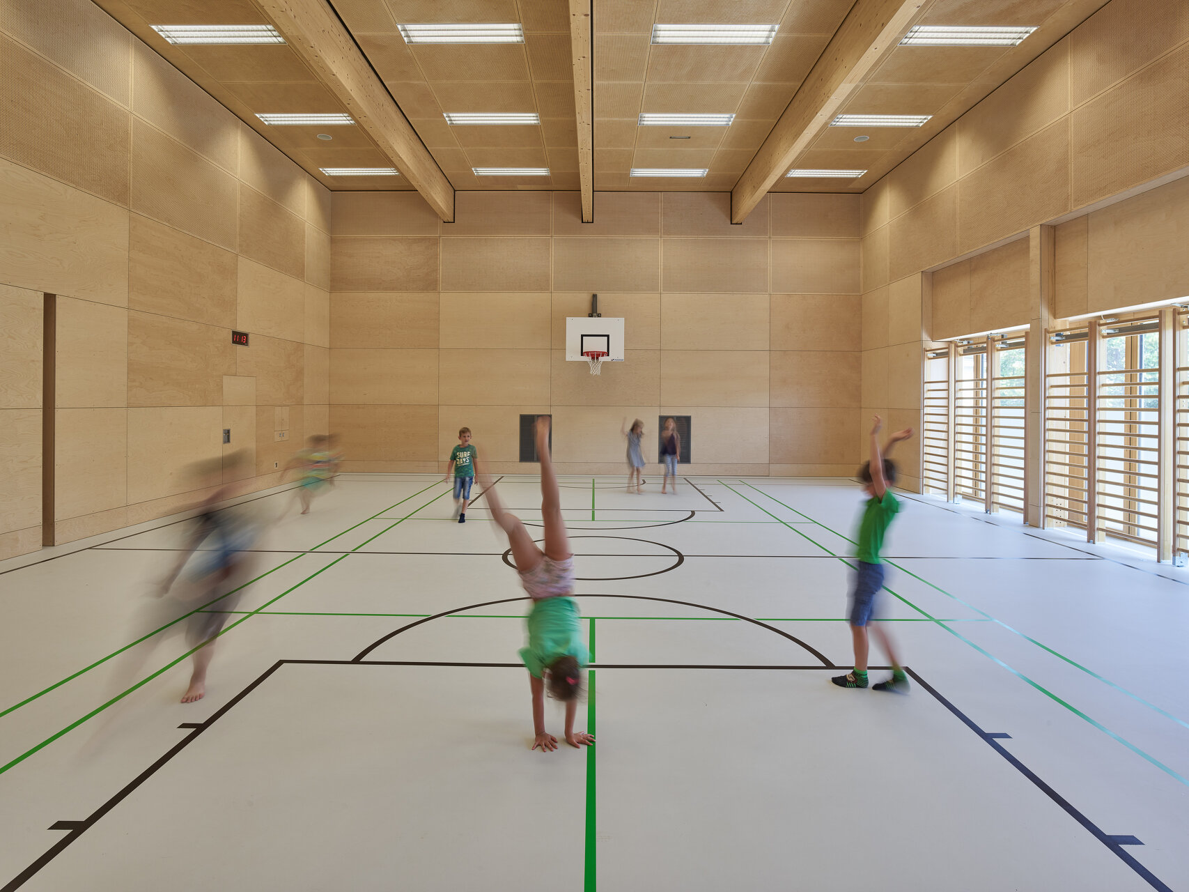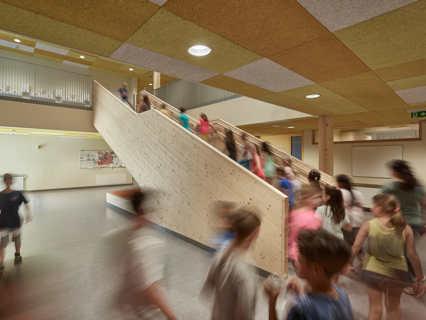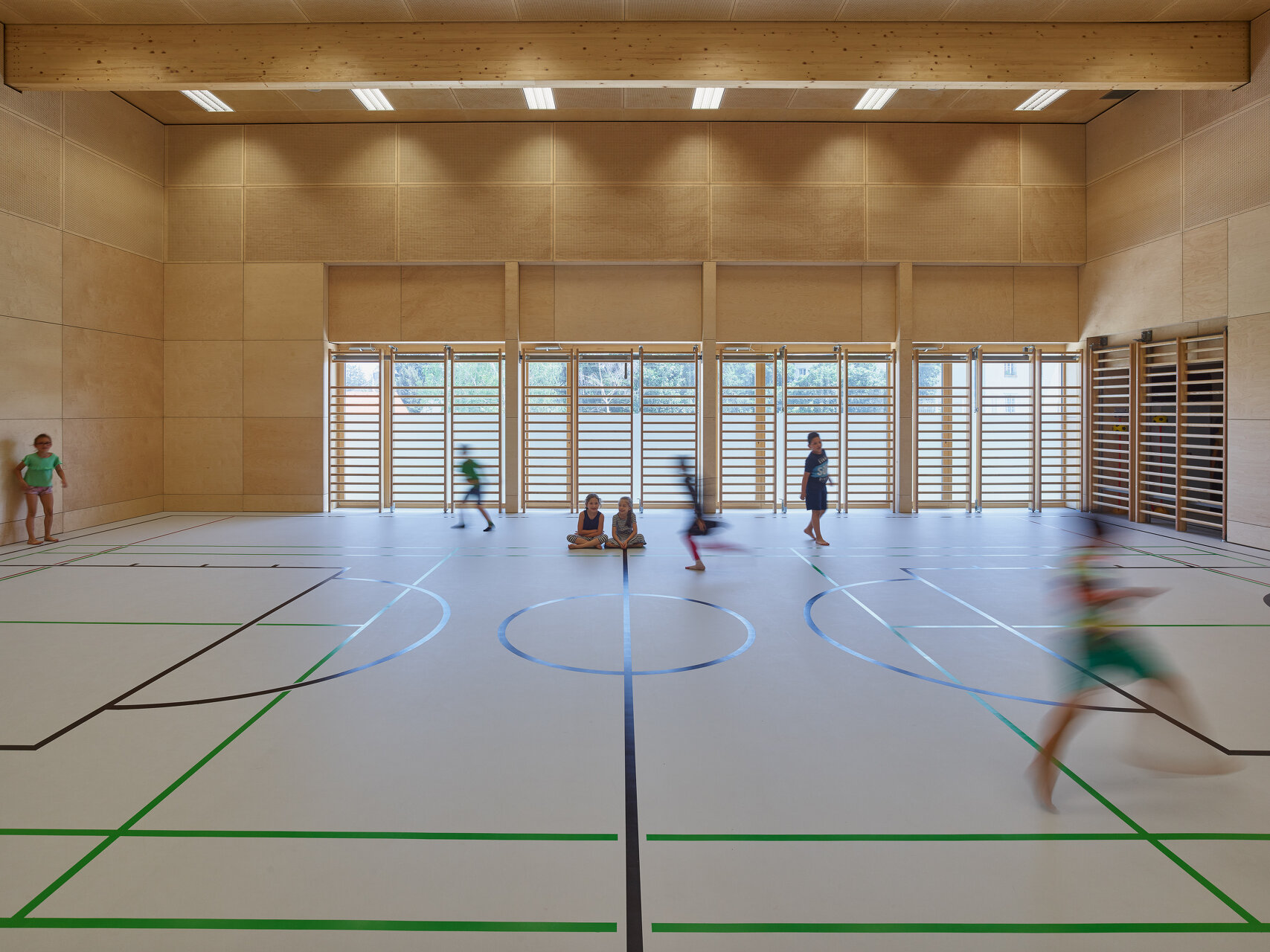Der Zugang zur Schule erfolgt über den Nordtrakt, der im Erdgeschoss Verwaltungsräume und Garderoben beherbergt, darüber liegen die neue zweigeschossige Turnhalle und der Gymnastiksaal. Diese Positionierung ermöglicht im Erdgeschoss eine übersichtliche, ringförmige Erschließung, die Bestand und Neubauten barrierefrei verbindet. Nach Osten kragt der Gymnastiksaal über den Vorplatz aus und überdacht den Eingang. (Text: Architekten)