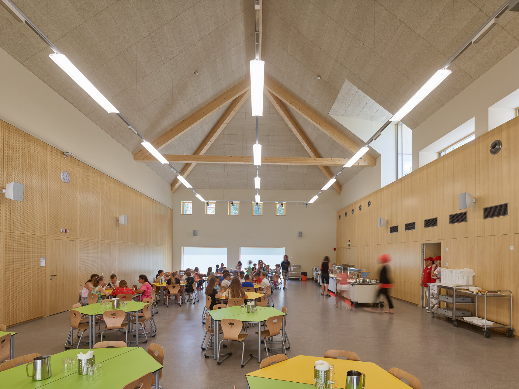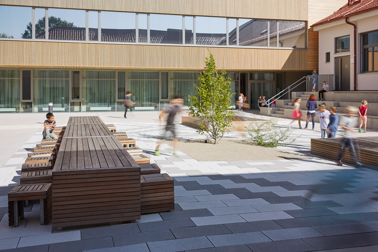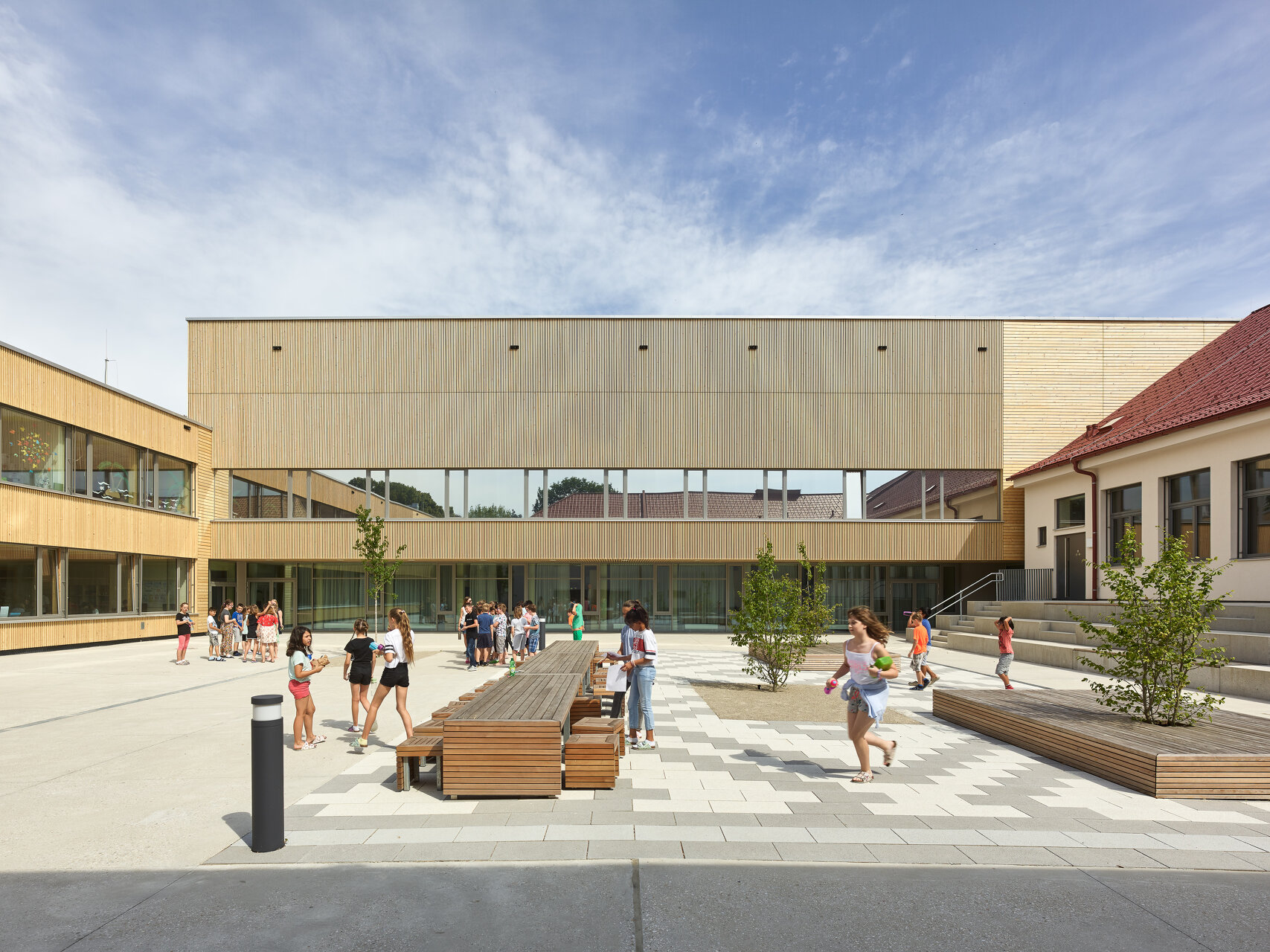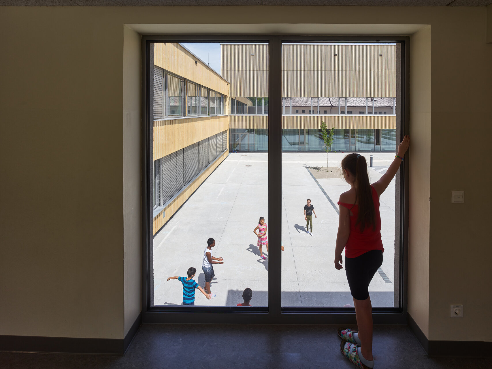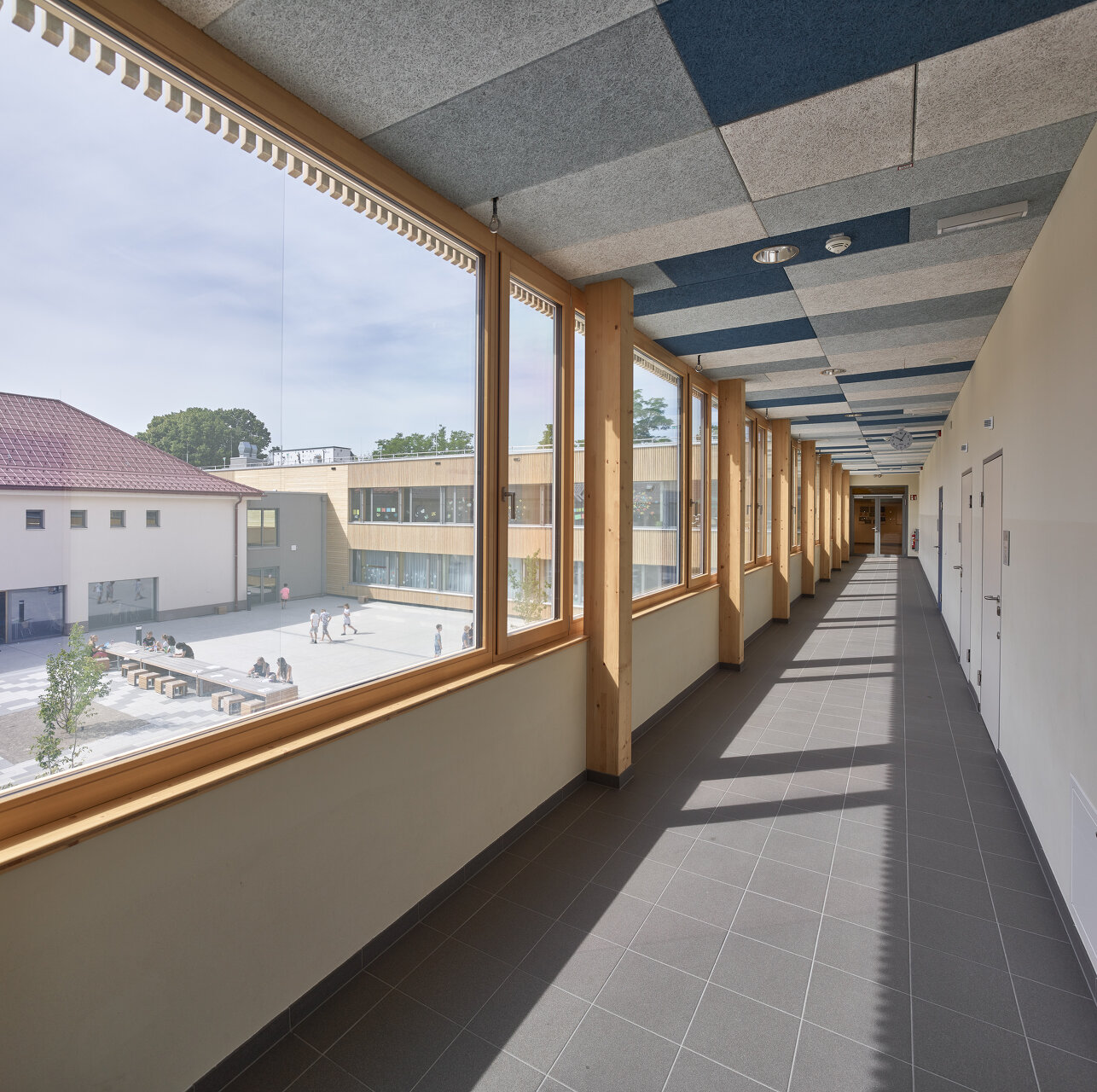 Der Zugang zur Schule erfolgt über den Nordtrakt, der im Erdgeschoss Verwaltungsräume und Garderoben beherbergt, darüber liegen die neue zweigeschossige Turnhalle und der Gymnastiksaal. Diese Positionierung ermöglicht im Erdgeschoss eine übersichtliche, ringförmige Erschließung, die Bestand und Neubauten barrierefrei verbindet. Nach Osten kragt der Gymnastiksaal über den Vorplatz aus und überdacht den Eingang. (Text: Architekten)