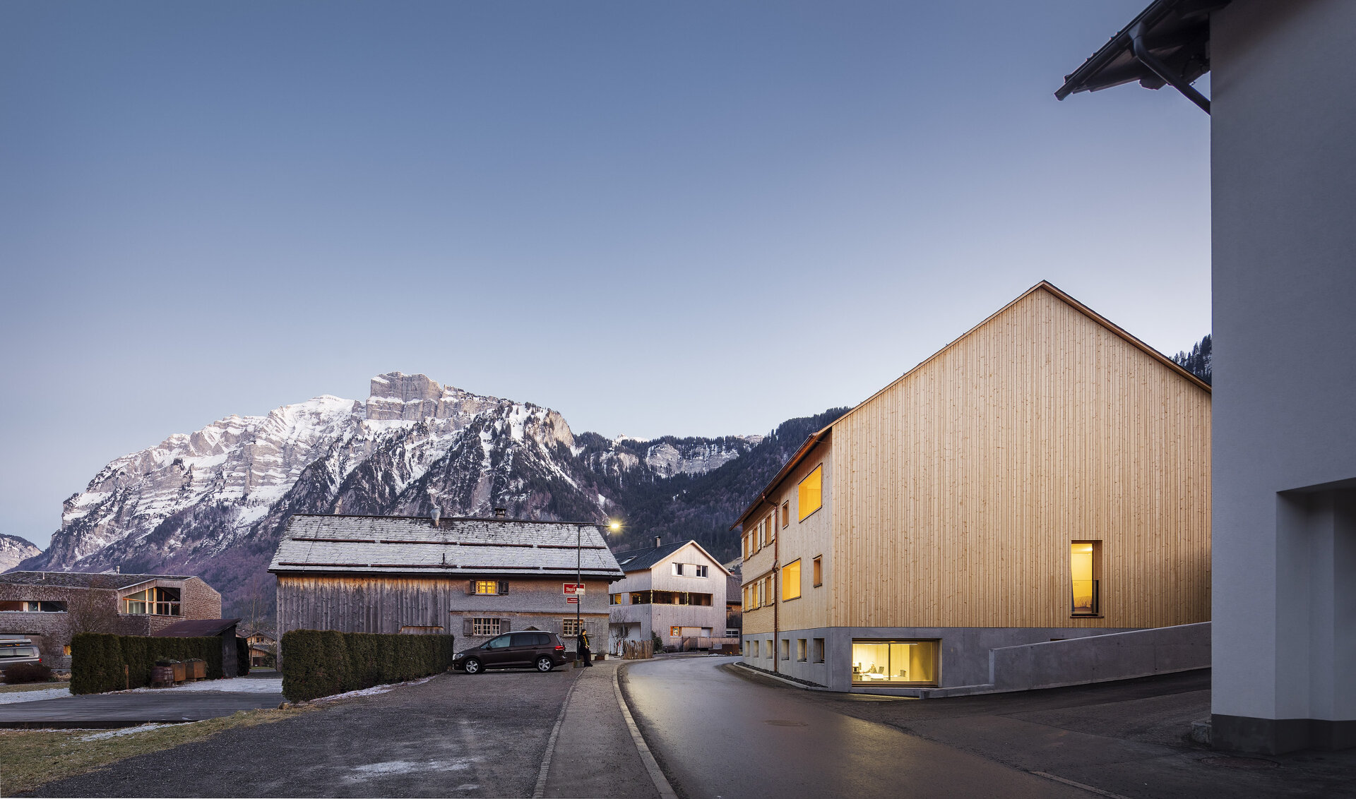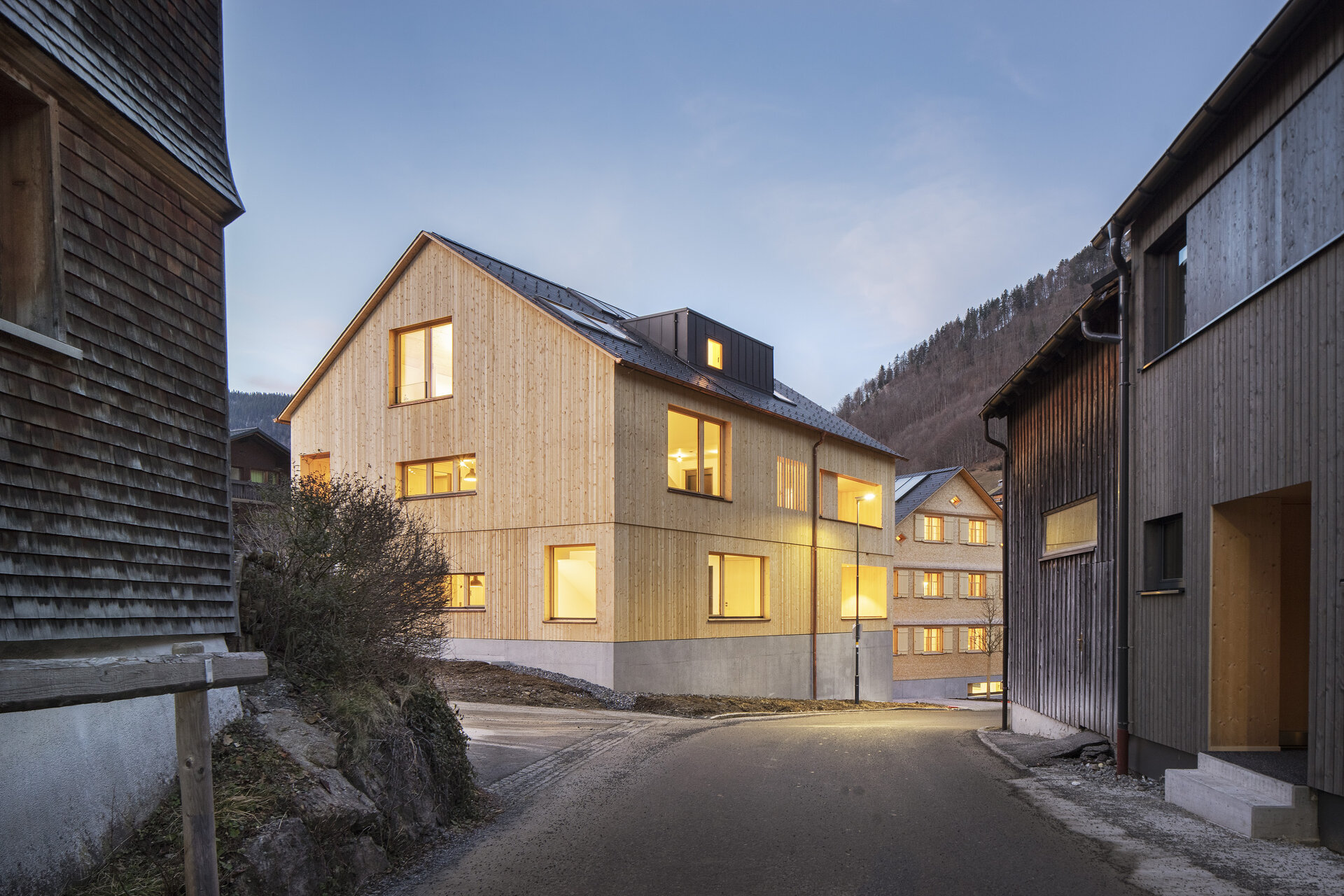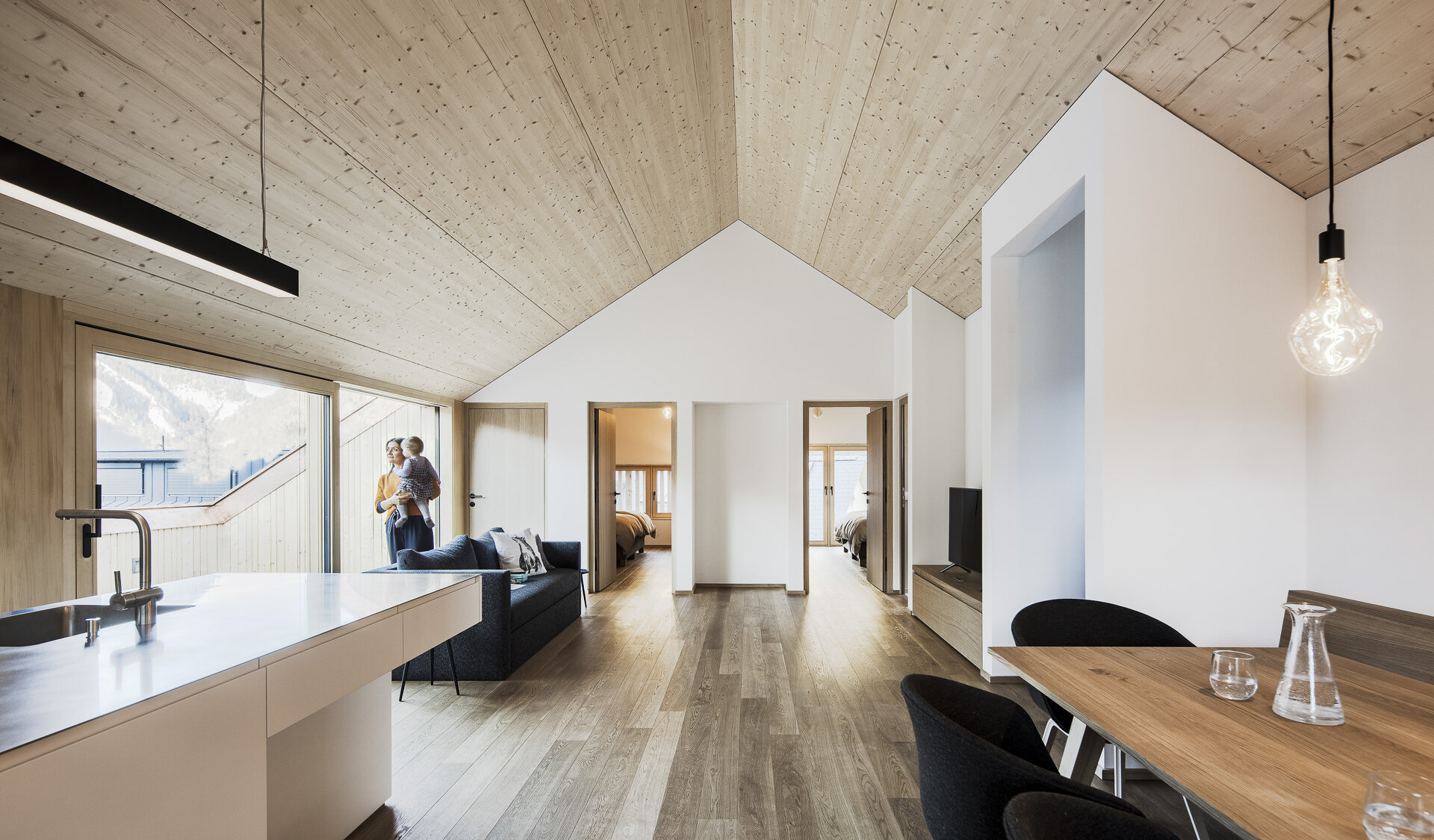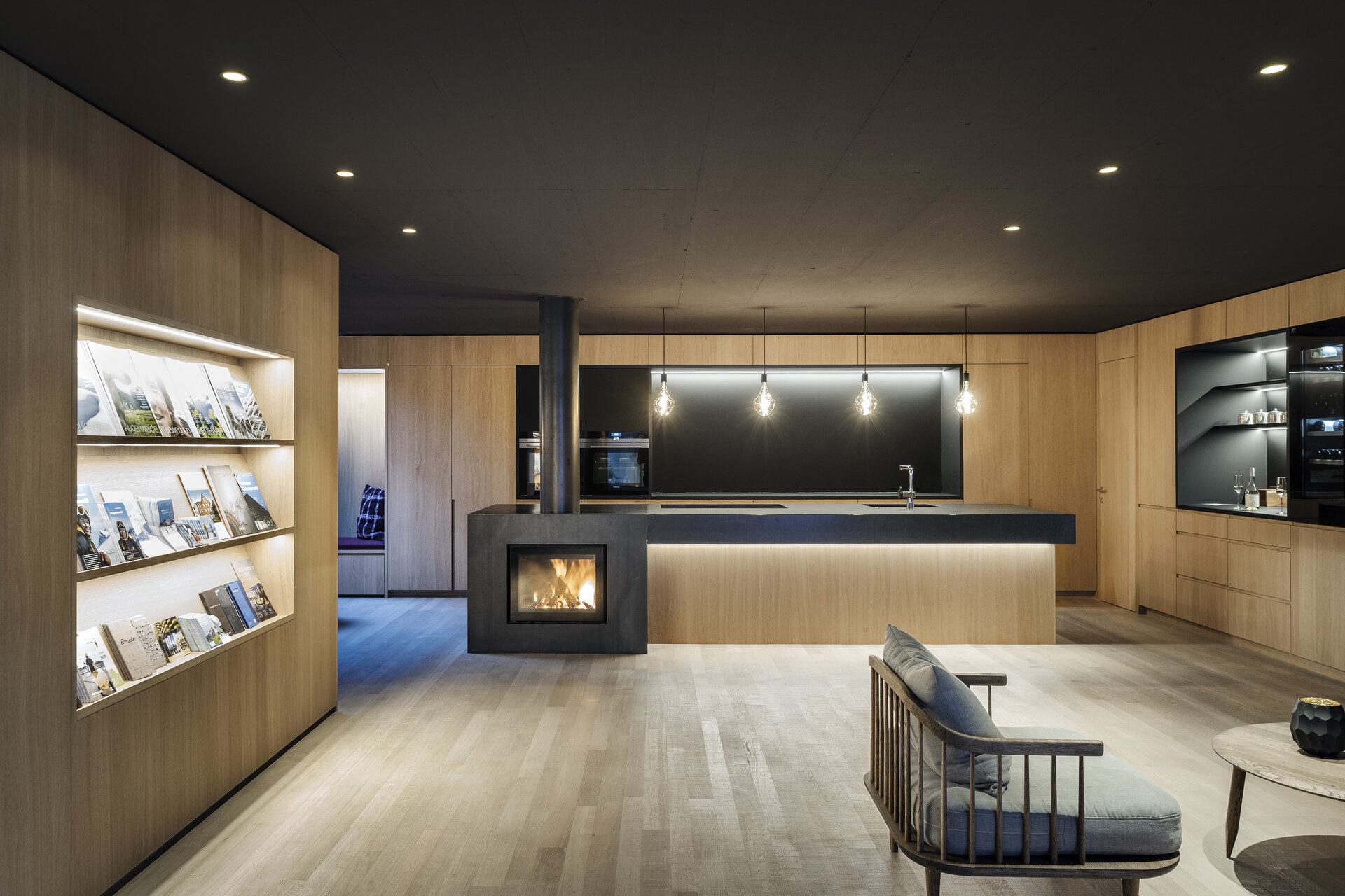 Verbunden sind die beiden Häuser im Untergeschoß über die Tiefgarage, sowie im Eingangsgeschoß über eine große Stube, die zum Verweilen und Entspannen einlädt. Eckbank, Kredenz und Sitzmöbel in der Tradition des Kanapees sowie der Ofen als zentrale Feuerstelle stehen für die typische Bregenzerwälder Gemütlichkeit und bieten einen heimeligen Wohlfühlort. Dazu kommen die Kochinsel, die Bibliothek und ein Medienbereich für Seminare. Ergänzt wird das Angebot in beiden Häusern jeweils durch eine Sauna mit Ruhebereich. Das Architekturbüro sitzt zurückhaltend im Sockelgeschoß und ist intelligent in die gemeinsam nutzbare Infrastruktur eingebunden. (Text: Architekt, bearbeitet)