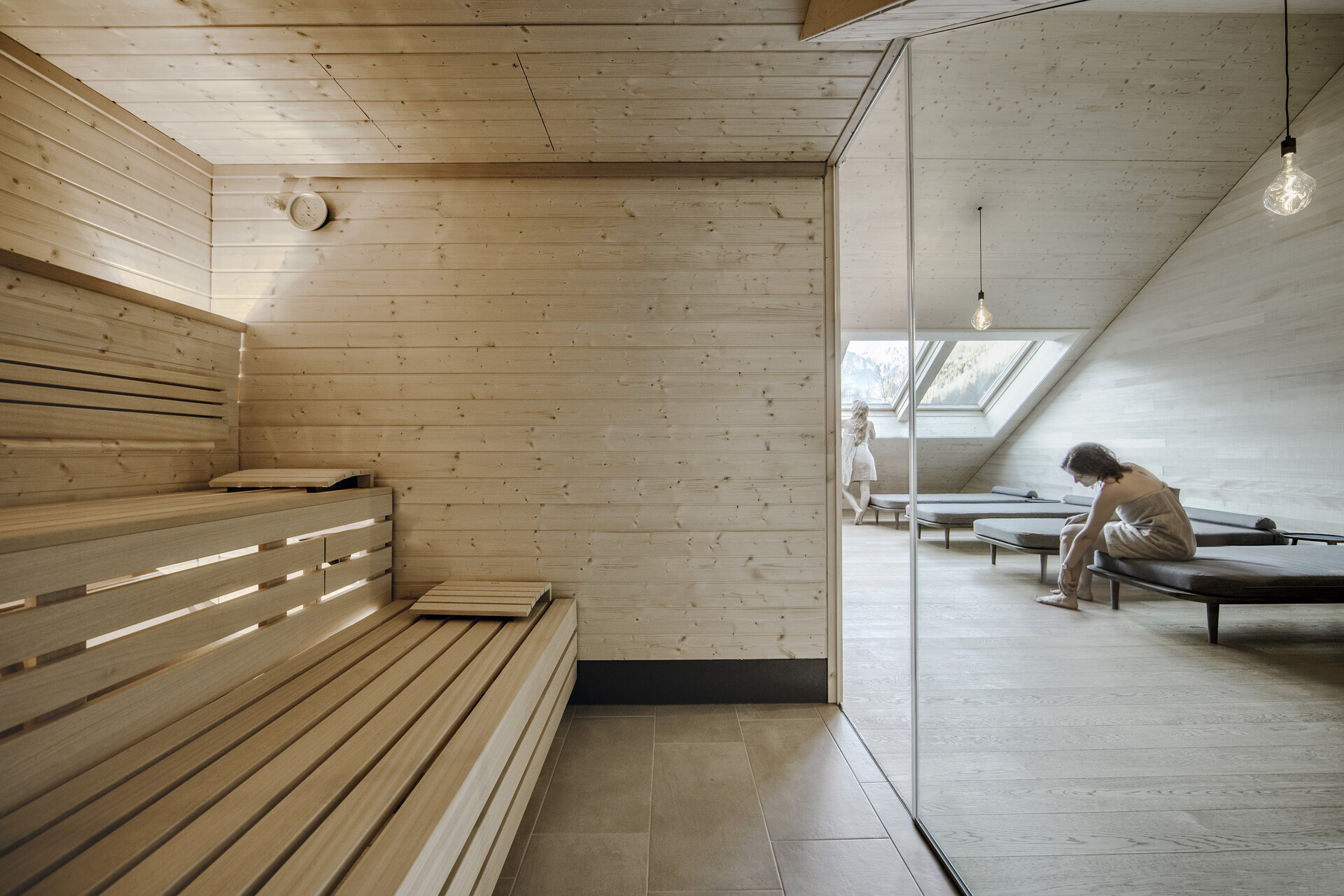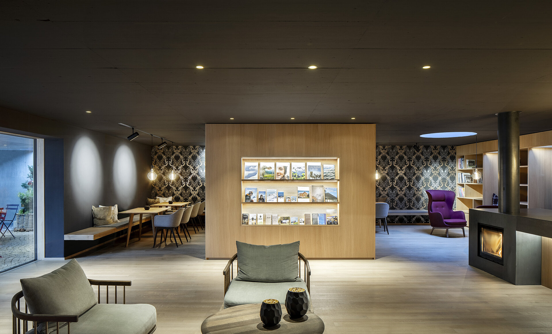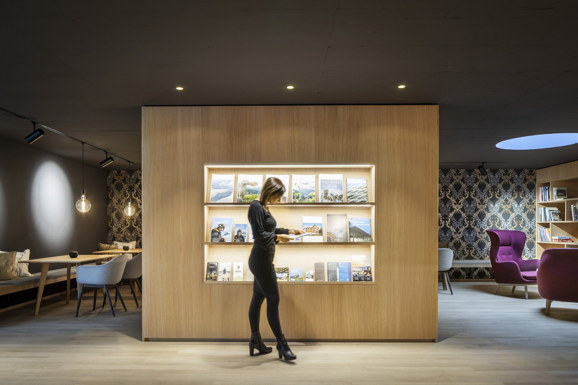 Verbunden sind die beiden Häuser im Untergeschoß über die Tiefgarage, sowie im Eingangsgeschoß über eine große Stube, die zum Verweilen und Entspannen einlädt. Eckbank, Kredenz und Sitzmöbel in der Tradition des Kanapees sowie der Ofen als zentrale Feuerstelle stehen für die typische Bregenzerwälder Gemütlichkeit und bieten einen heimeligen Wohlfühlort. Dazu kommen die Kochinsel, die Bibliothek und ein Medienbereich für Seminare. Ergänzt wird das Angebot in beiden Häusern jeweils durch eine Sauna mit Ruhebereich. Das Architekturbüro sitzt zurückhaltend im Sockelgeschoß und ist intelligent in die gemeinsam nutzbare Infrastruktur eingebunden. (Text: Architekt, bearbeitet)