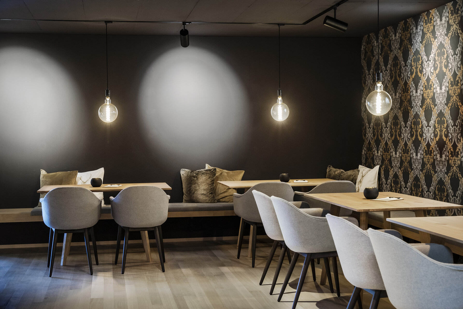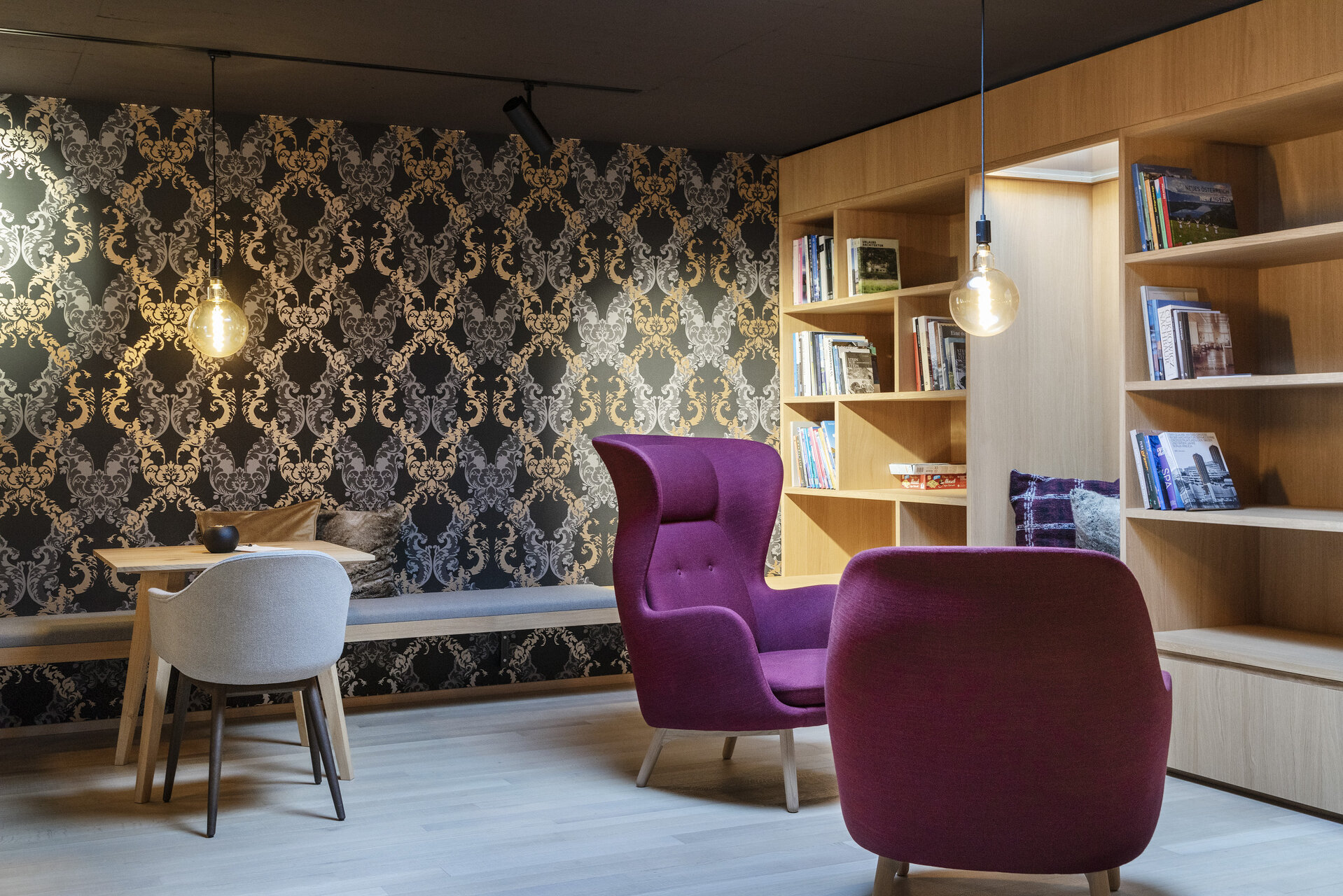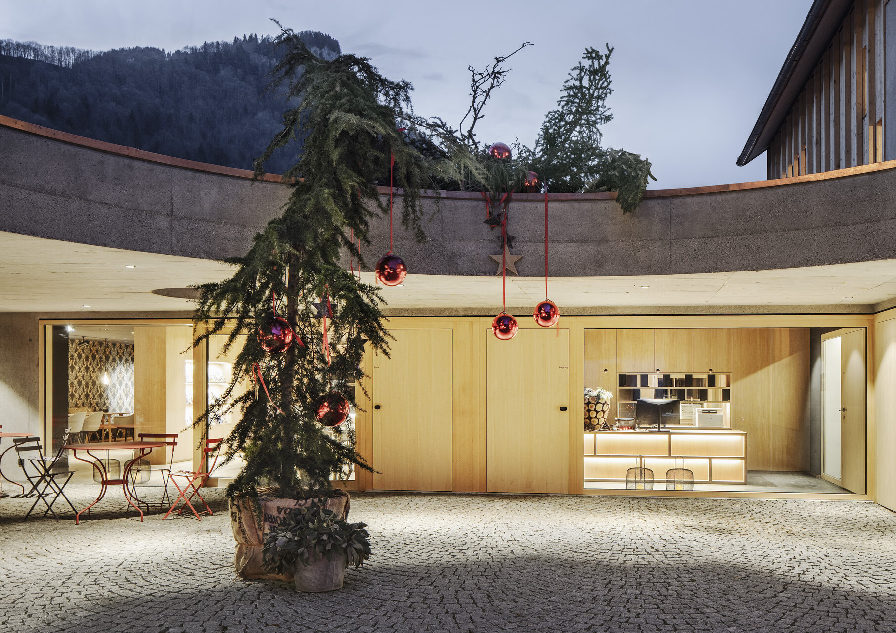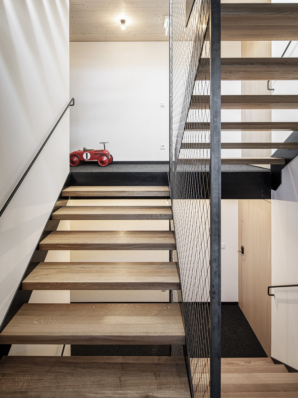 Verbunden sind die beiden Häuser im Untergeschoß über die Tiefgarage, sowie im Eingangsgeschoß über eine große Stube, die zum Verweilen und Entspannen einlädt. Eckbank, Kredenz und Sitzmöbel in der Tradition des Kanapees sowie der Ofen als zentrale Feuerstelle stehen für die typische Bregenzerwälder Gemütlichkeit und bieten einen heimeligen Wohlfühlort. Dazu kommen die Kochinsel, die Bibliothek und ein Medienbereich für Seminare. Ergänzt wird das Angebot in beiden Häusern jeweils durch eine Sauna mit Ruhebereich. Das Architekturbüro sitzt zurückhaltend im Sockelgeschoß und ist intelligent in die gemeinsam nutzbare Infrastruktur eingebunden. (Text: Architekt, bearbeitet)