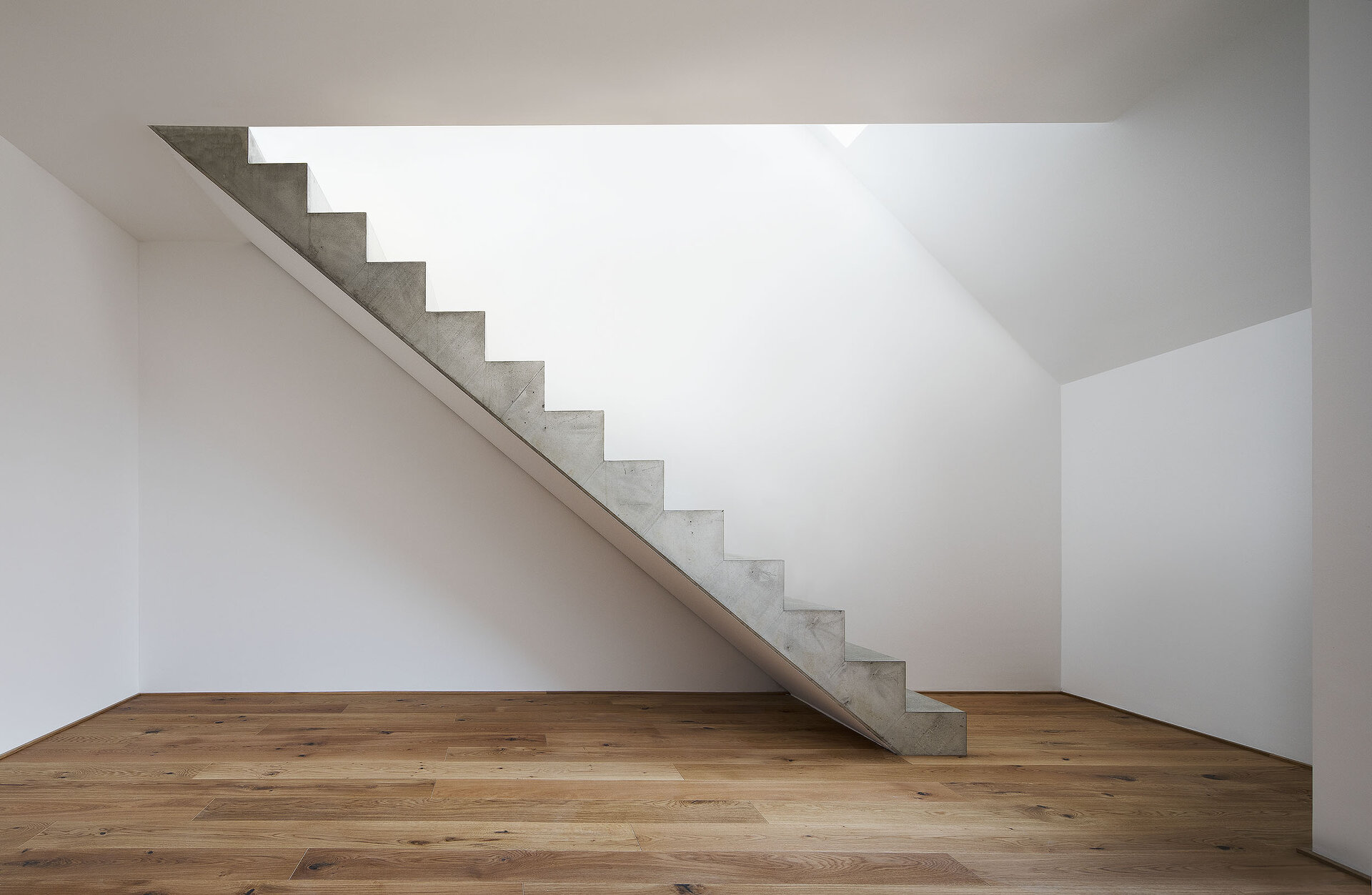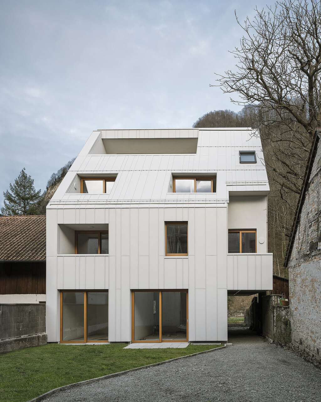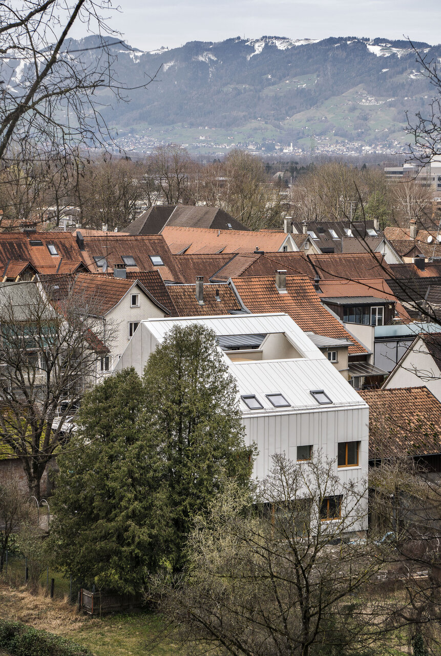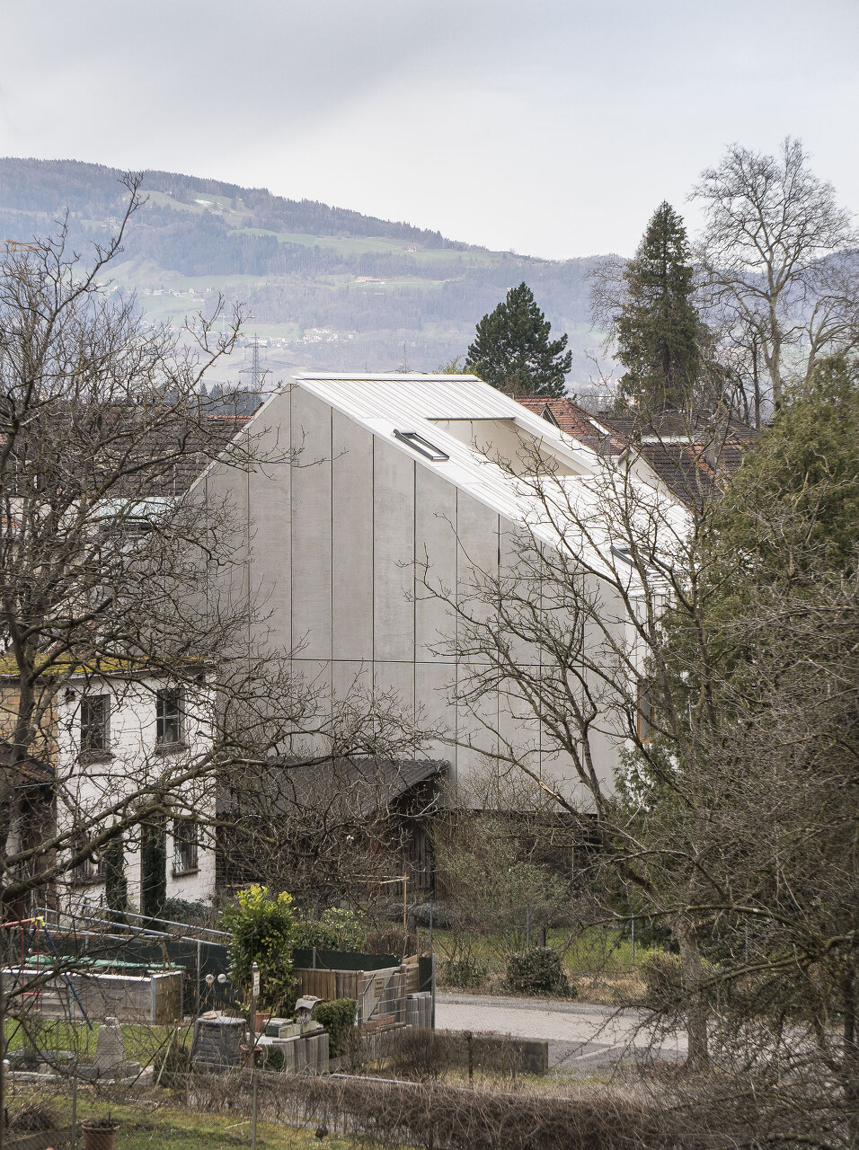 In Materialität und Detail reduziert, nehmen Form, Textur und Farbgebung des monolithischen Volumens Bezug auf den Kontext. Die im Bebauungsplan festgelegten Werte für Dachneigungen, Gebäudetiefe etc. definieren den Baukörper in seiner klaren Geometrie, die durch asymmetrische Einschnitte akzentuiert wird. Die unregelmäßige, über Fassade und Dach laufende Verblechung in Stehfalzstruktur nimmt die Längsorientierung des Grundstücks auf und schafft zugleich eine Referenz zu den Holzbrettfassaden der umliegenden Stadel. Mit der hellgrauen Farbe und Giebelfassaden aus Betonfertigteilen stellt das Gebäude den landschaftlichen Bezug zum dahinter liegenden Felsen des Schloßbergs her. (Text: Tobias Hagleitner, nach einem Text der Architekt:innen)