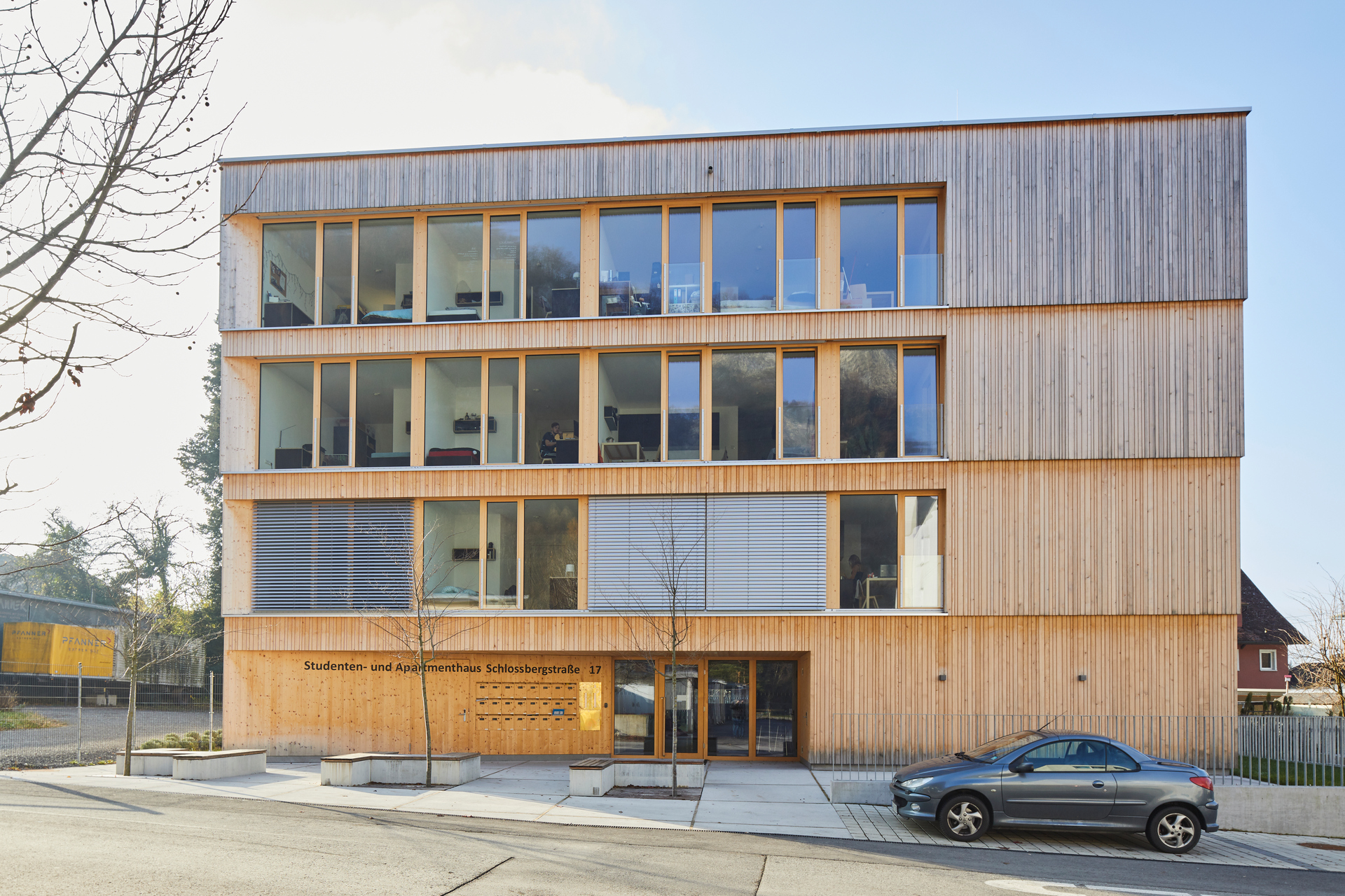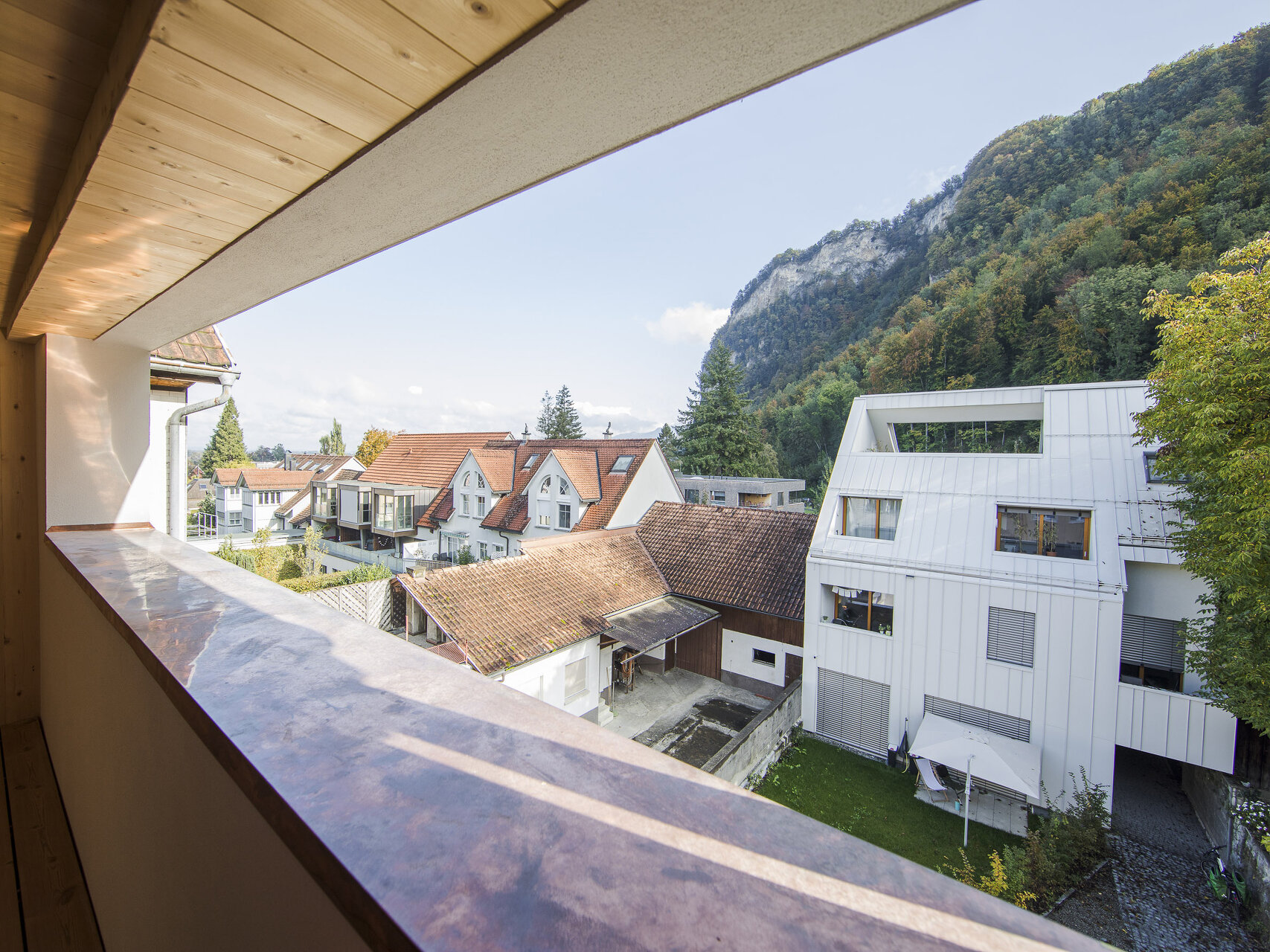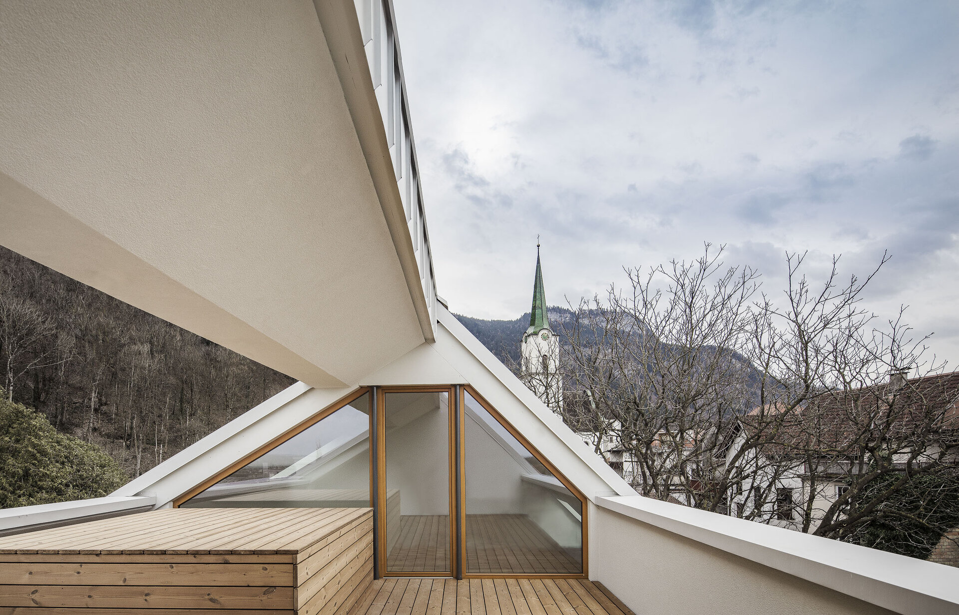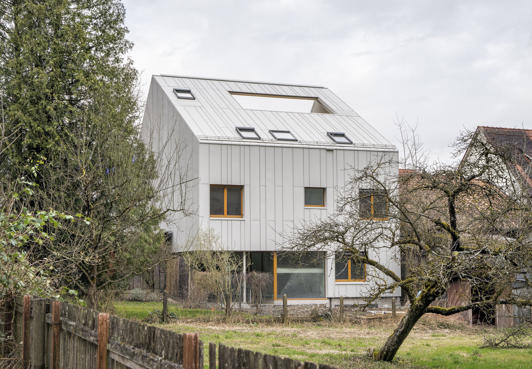 In Materialität und Detail reduziert, nehmen Form, Textur und Farbgebung des monolithischen Volumens Bezug auf den Kontext. Die im Bebauungsplan festgelegten Werte für Dachneigungen, Gebäudetiefe etc. definieren den Baukörper in seiner klaren Geometrie, die durch asymmetrische Einschnitte akzentuiert wird. Die unregelmäßige, über Fassade und Dach laufende Verblechung in Stehfalzstruktur nimmt die Längsorientierung des Grundstücks auf und schafft zugleich eine Referenz zu den Holzbrettfassaden der umliegenden Stadel. Mit der hellgrauen Farbe und Giebelfassaden aus Betonfertigteilen stellt das Gebäude den landschaftlichen Bezug zum dahinter liegenden Felsen des Schloßbergs her. (Text: Tobias Hagleitner, nach einem Text der Architekt:innen)