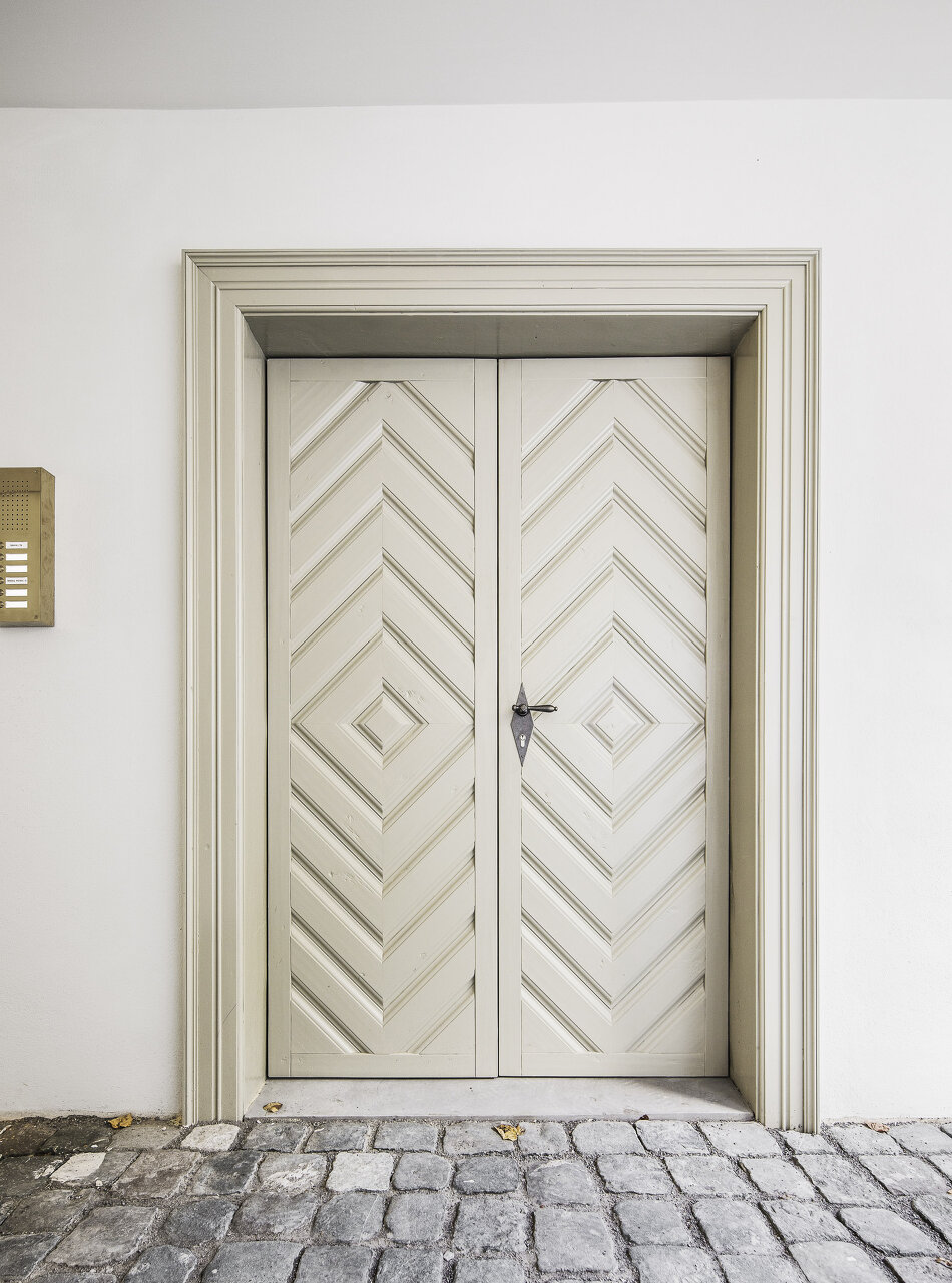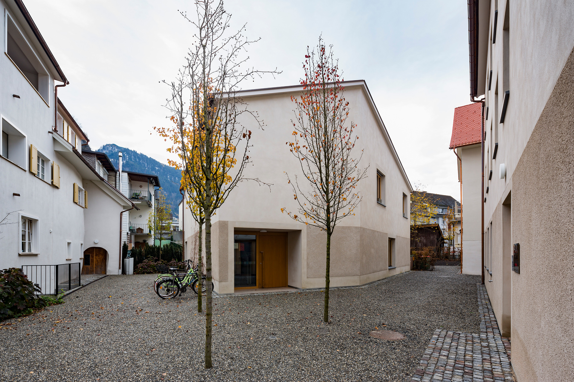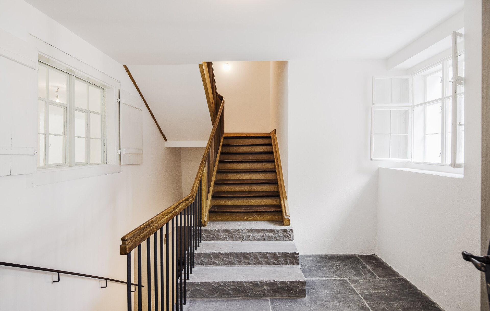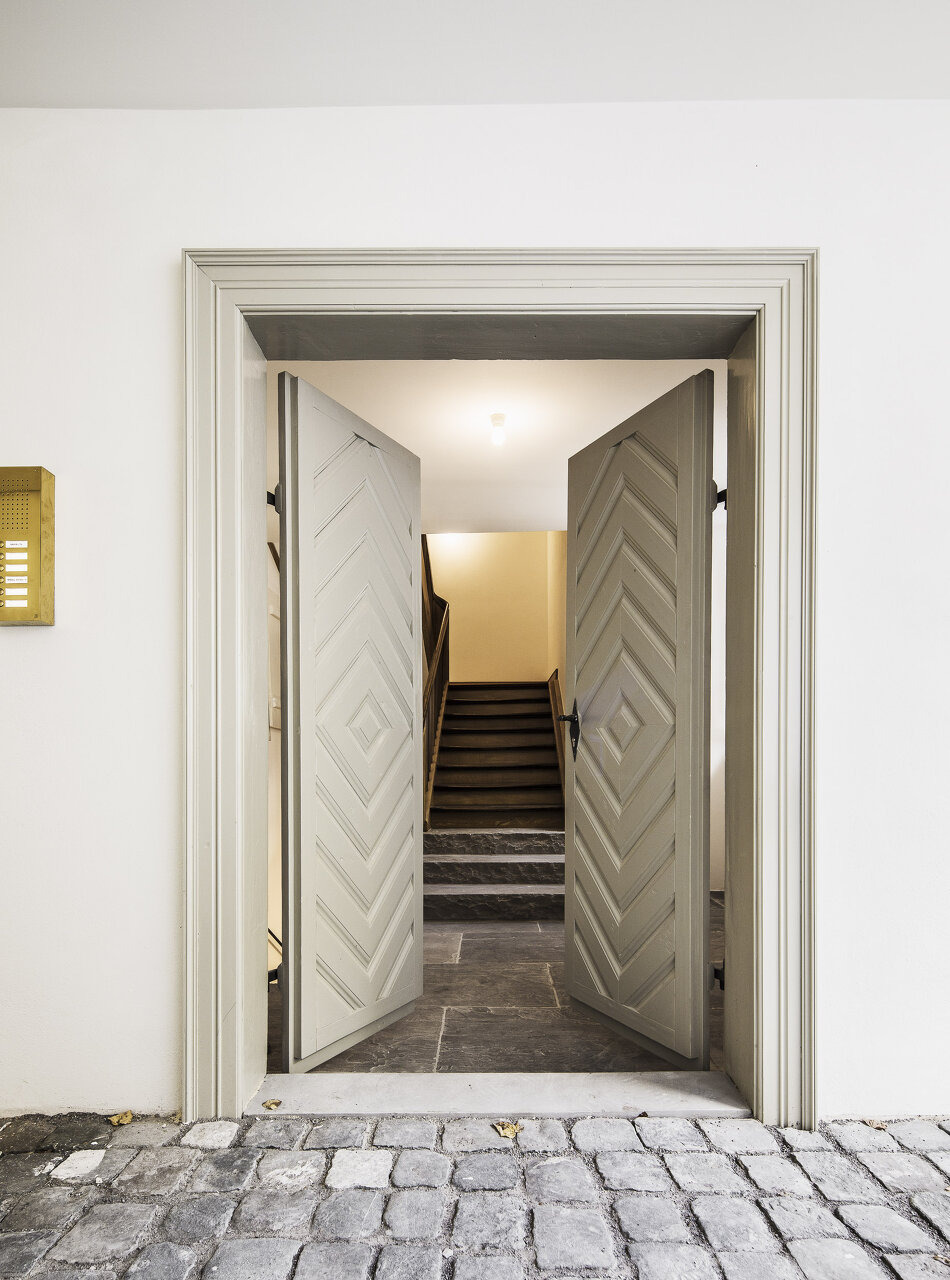 Das unter Ensembleschutz stehende Bestandsobjekt vorne an der Straße wurde generalsaniert, blieb aber in seiner Substanz im Wesentlichen erhalten. Ein halböffentlicher Durchgang führt in den Innenhof, wo in zweiter Reihe ein Neubau mit fünf Wohnungen entstanden ist. Die typologisch eng verwandten Einheiten in einer Größenordnung von 45 bis 70 Quadratmetern sind von einem kompakten Stiegenhauskern mit Lift barrierefrei erschlossen. Versetzte Einschnitte von Terrassen und Loggien verleihen den Wohnungen individuellen Charme und Charakter.