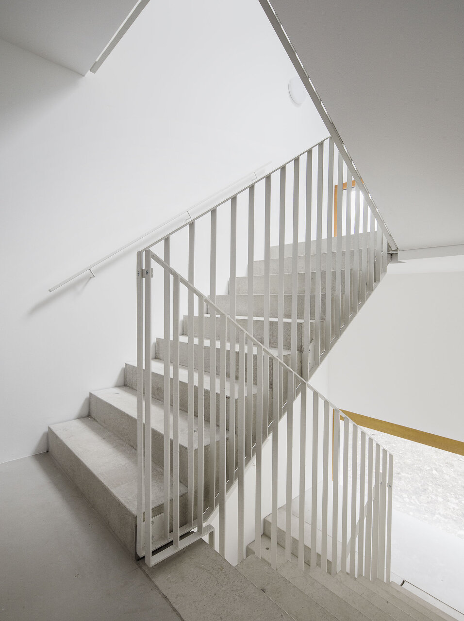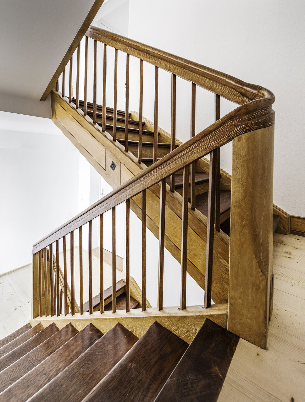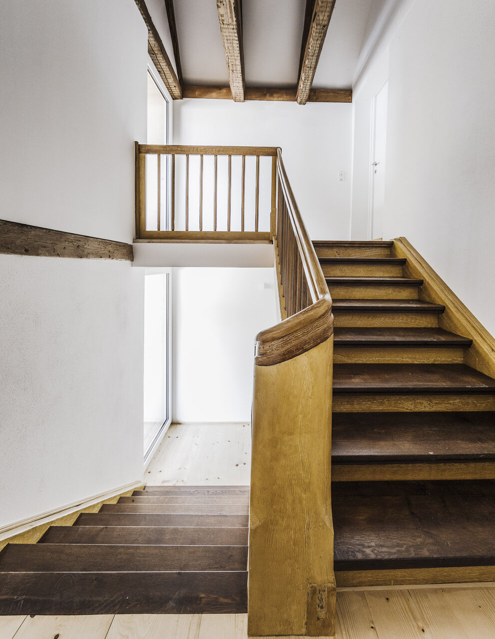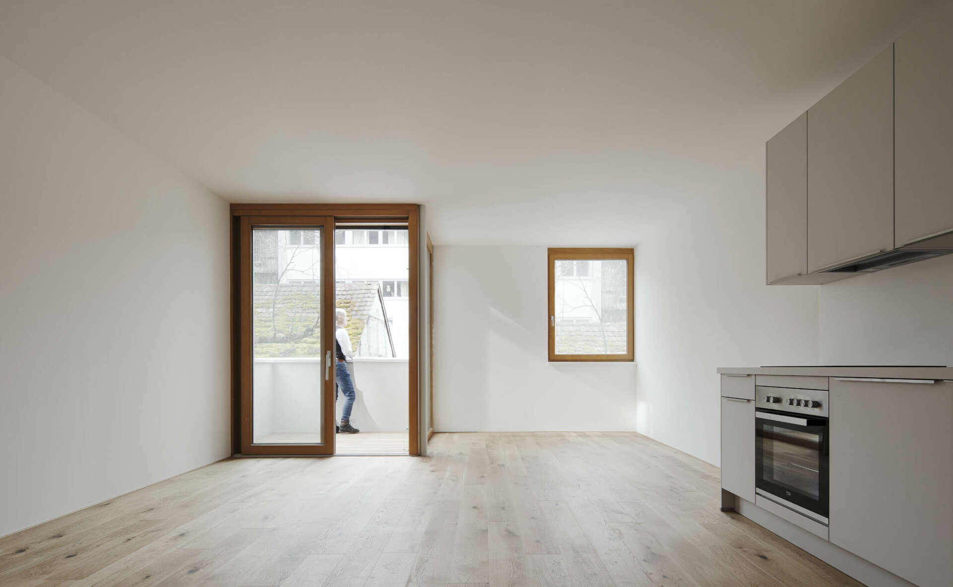 Das unter Ensembleschutz stehende Bestandsobjekt vorne an der Straße wurde generalsaniert, blieb aber in seiner Substanz im Wesentlichen erhalten. Ein halböffentlicher Durchgang führt in den Innenhof, wo in zweiter Reihe ein Neubau mit fünf Wohnungen entstanden ist. Die typologisch eng verwandten Einheiten in einer Größenordnung von 45 bis 70 Quadratmetern sind von einem kompakten Stiegenhauskern mit Lift barrierefrei erschlossen. Versetzte Einschnitte von Terrassen und Loggien verleihen den Wohnungen individuellen Charme und Charakter.