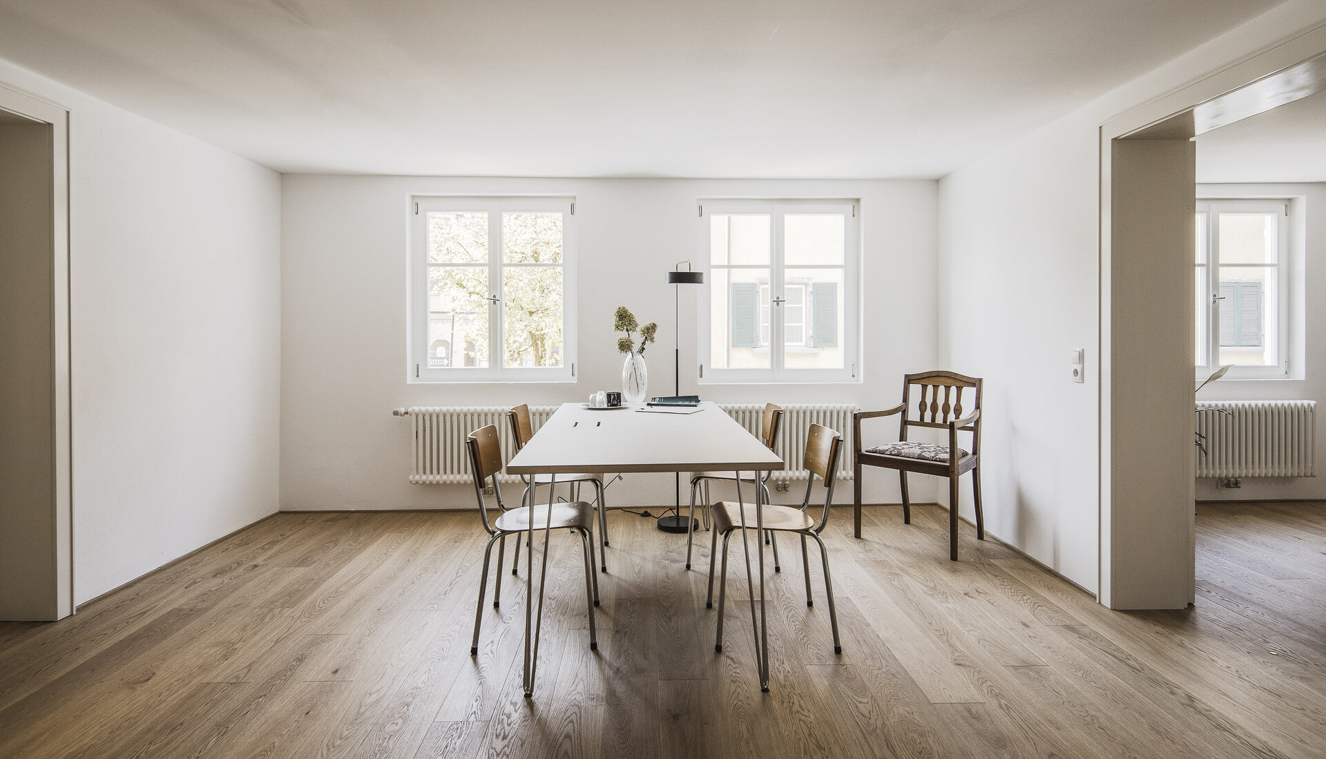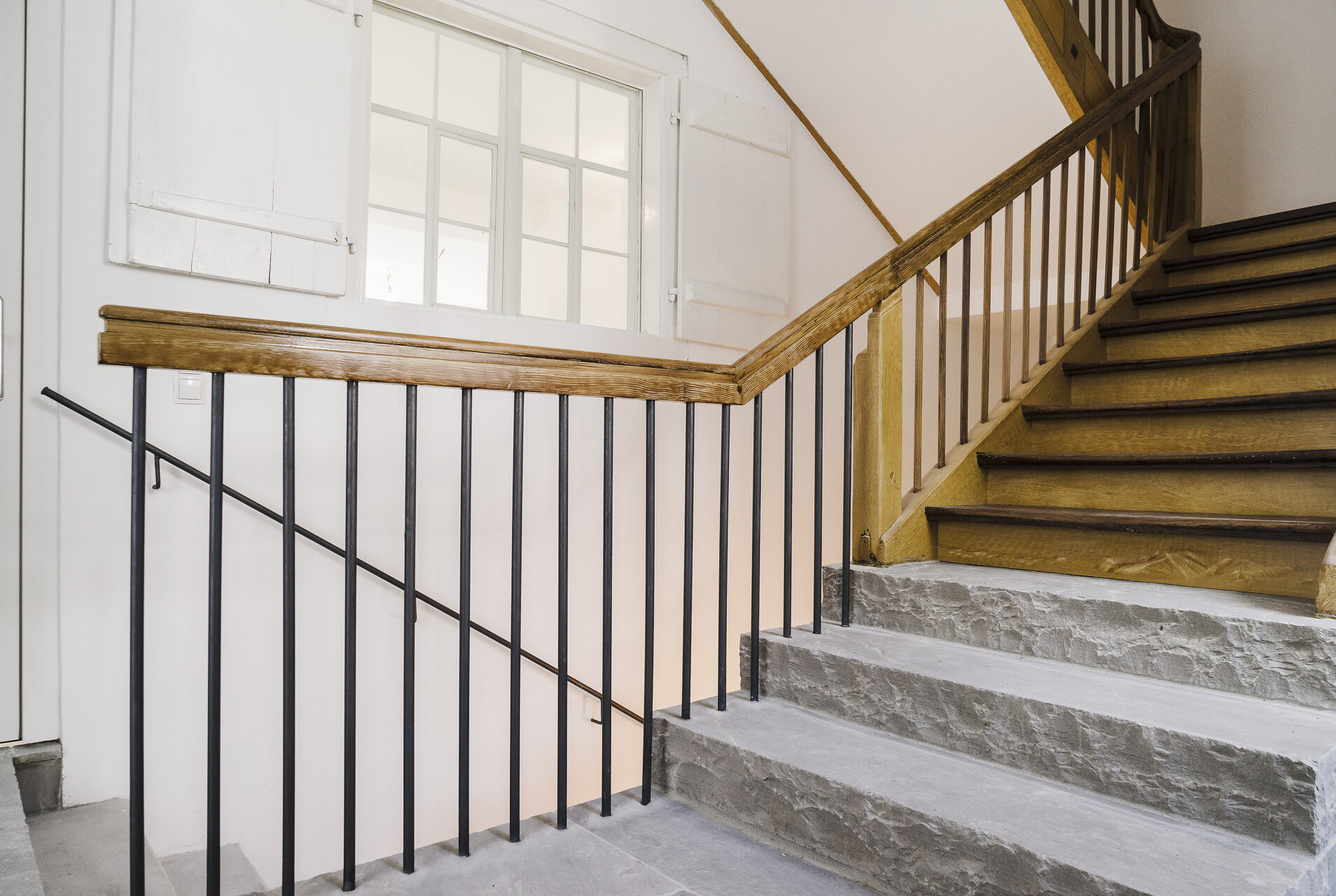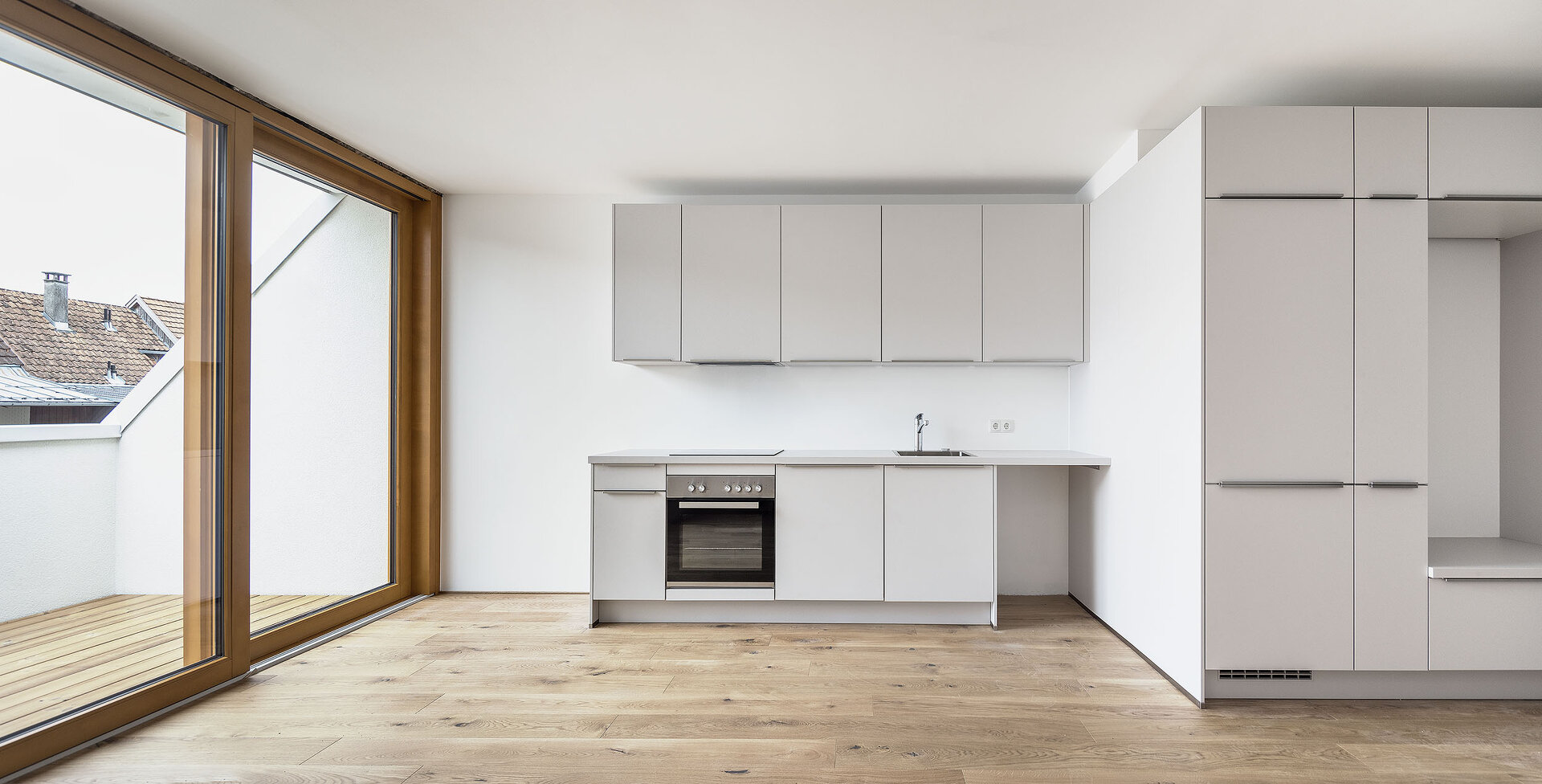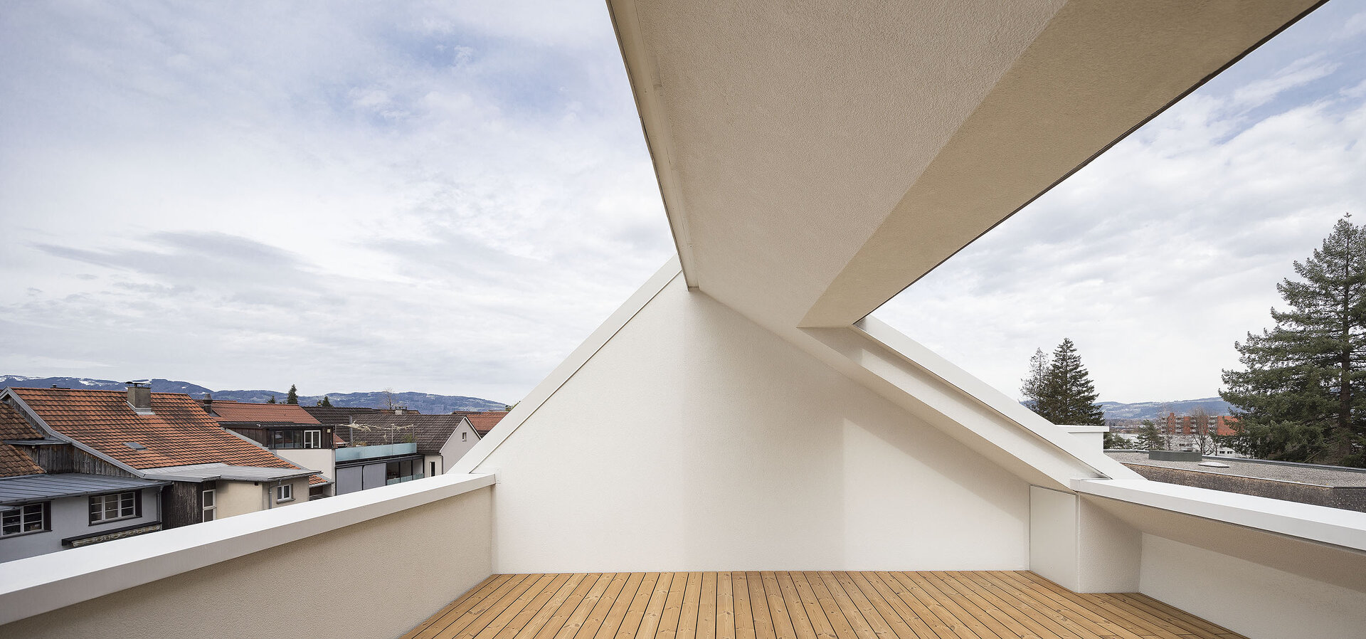 Das unter Ensembleschutz stehende Bestandsobjekt vorne an der Straße wurde generalsaniert, blieb aber in seiner Substanz im Wesentlichen erhalten. Ein halböffentlicher Durchgang führt in den Innenhof, wo in zweiter Reihe ein Neubau mit fünf Wohnungen entstanden ist. Die typologisch eng verwandten Einheiten in einer Größenordnung von 45 bis 70 Quadratmetern sind von einem kompakten Stiegenhauskern mit Lift barrierefrei erschlossen. Versetzte Einschnitte von Terrassen und Loggien verleihen den Wohnungen individuellen Charme und Charakter.