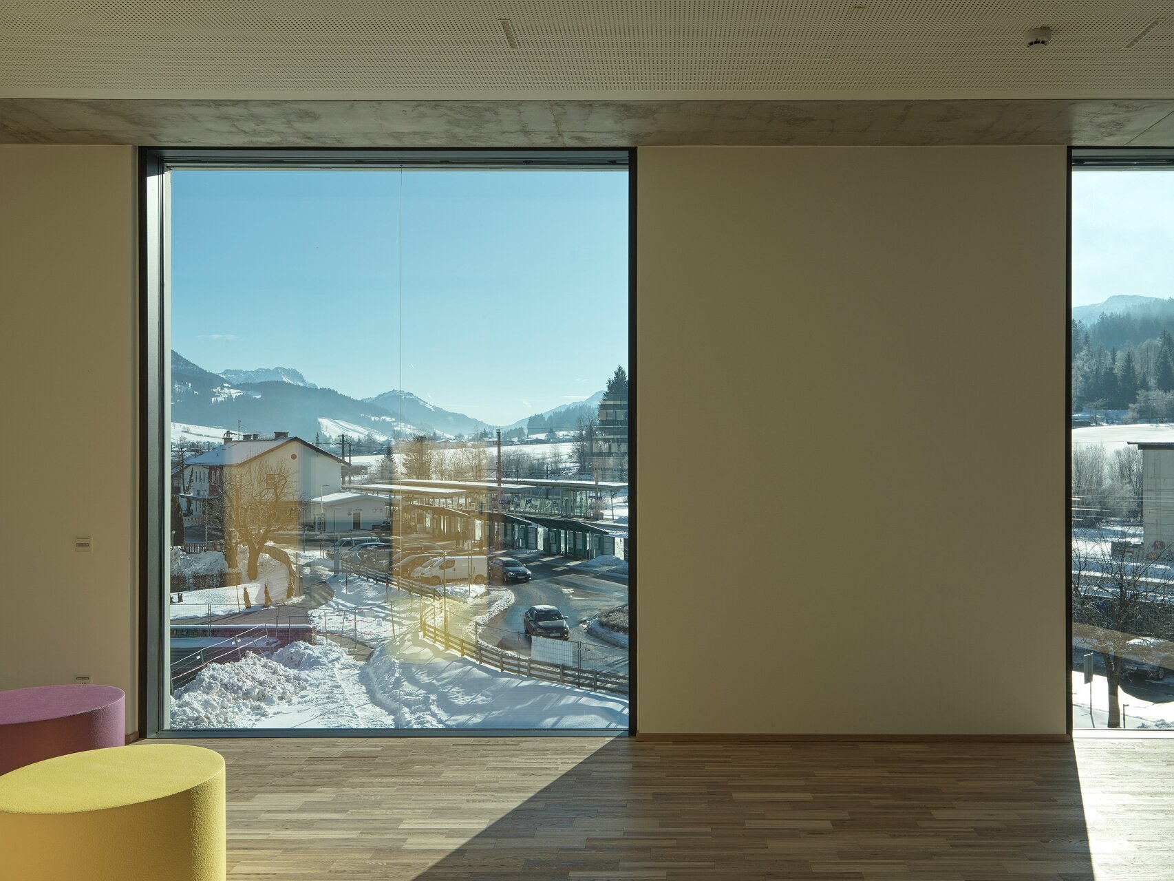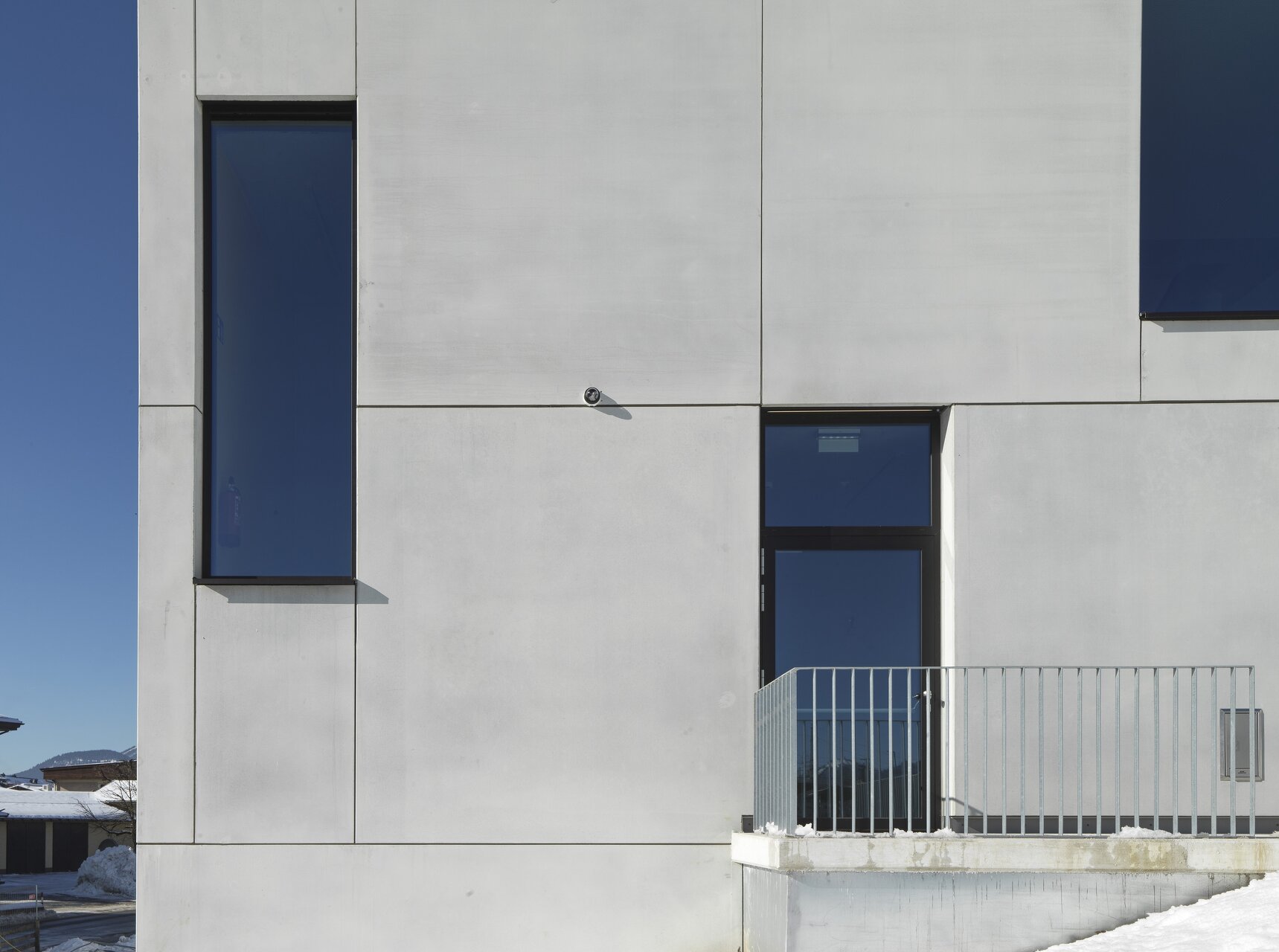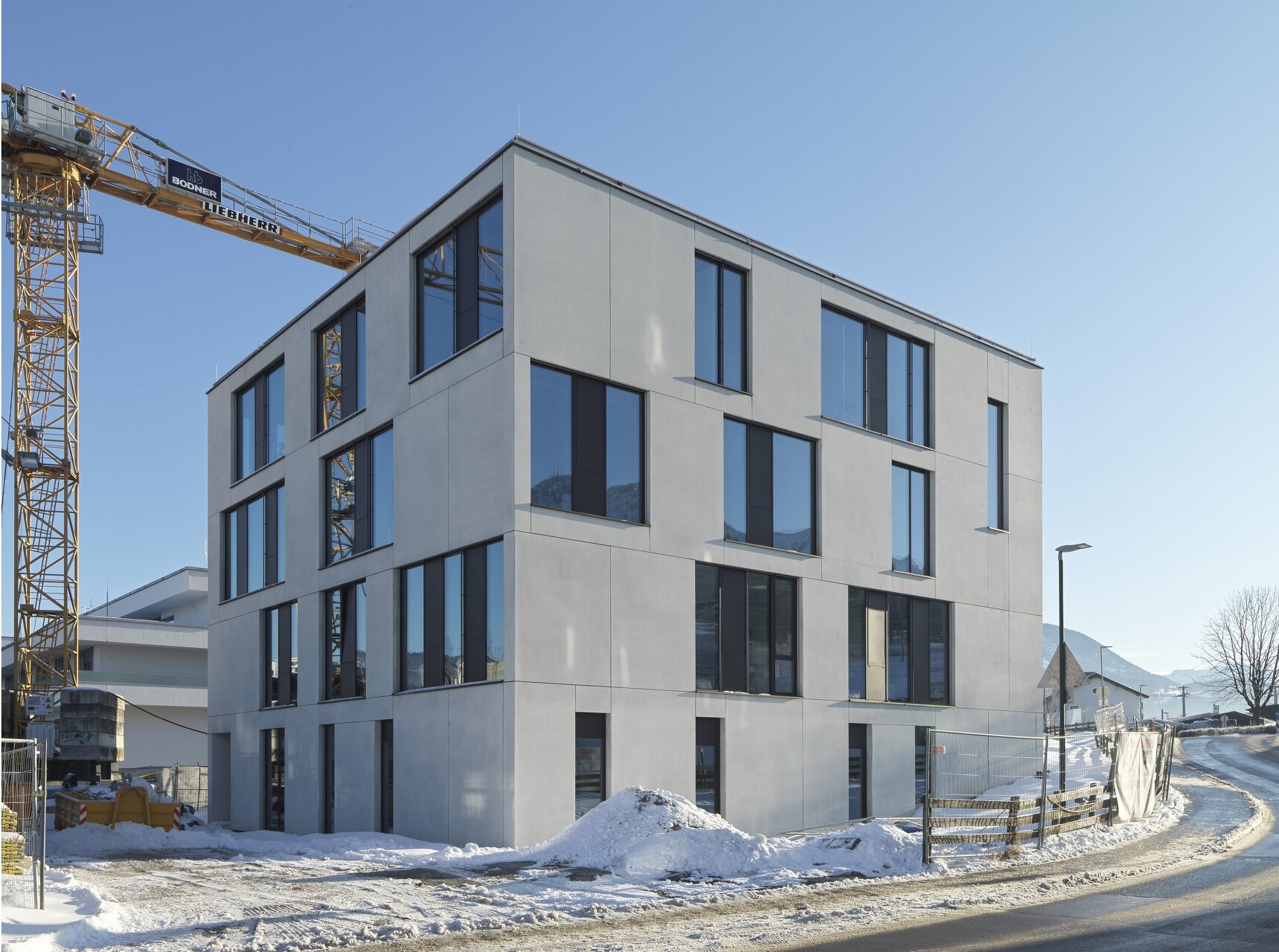 Das zentral zwischen Bahnhof und Ortszentrum gelegene Planungsgebiet für den Neubau befindet sich in einem Bereich, für den ein 2013 erarbeiteter Masterplan ein „grünes Band“ als Entwicklungsachse des Ortes vorsieht. Sabine Penz und Kurt Rumplmayr versuchen mit ihrem aus einem geladenen Wettbewerb hervorgegangenen Konzept diese städtebaulichen Überlegungen in hohem Maße umzusetzen. Sie situieren einen kompakten, viergeschoßigen Baukörper am nordöstlichen Teil des Bauplatzes, womit möglichst viel parkähnliche Flächen erhalten bleiben. In Hinblick auf die umgebende Bebauung und die städtische Lage entwickelten sie eine Fassade aus Fertigteil-Thermowänden, die zum einen eine kurze Bauzeit ermöglichten, zum anderen dem Baukörper seine spezifische Form im Wechsel von geschlossenen und offenen Fassadenteilen verleihen. (Text: Claudia Wedekind)