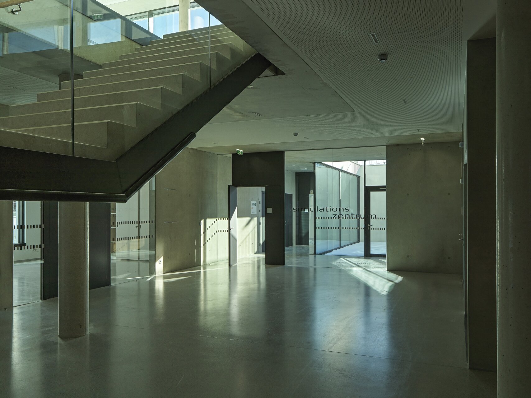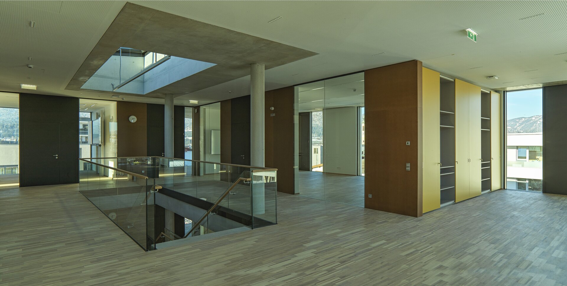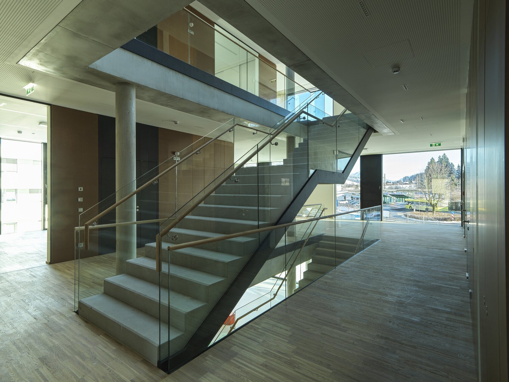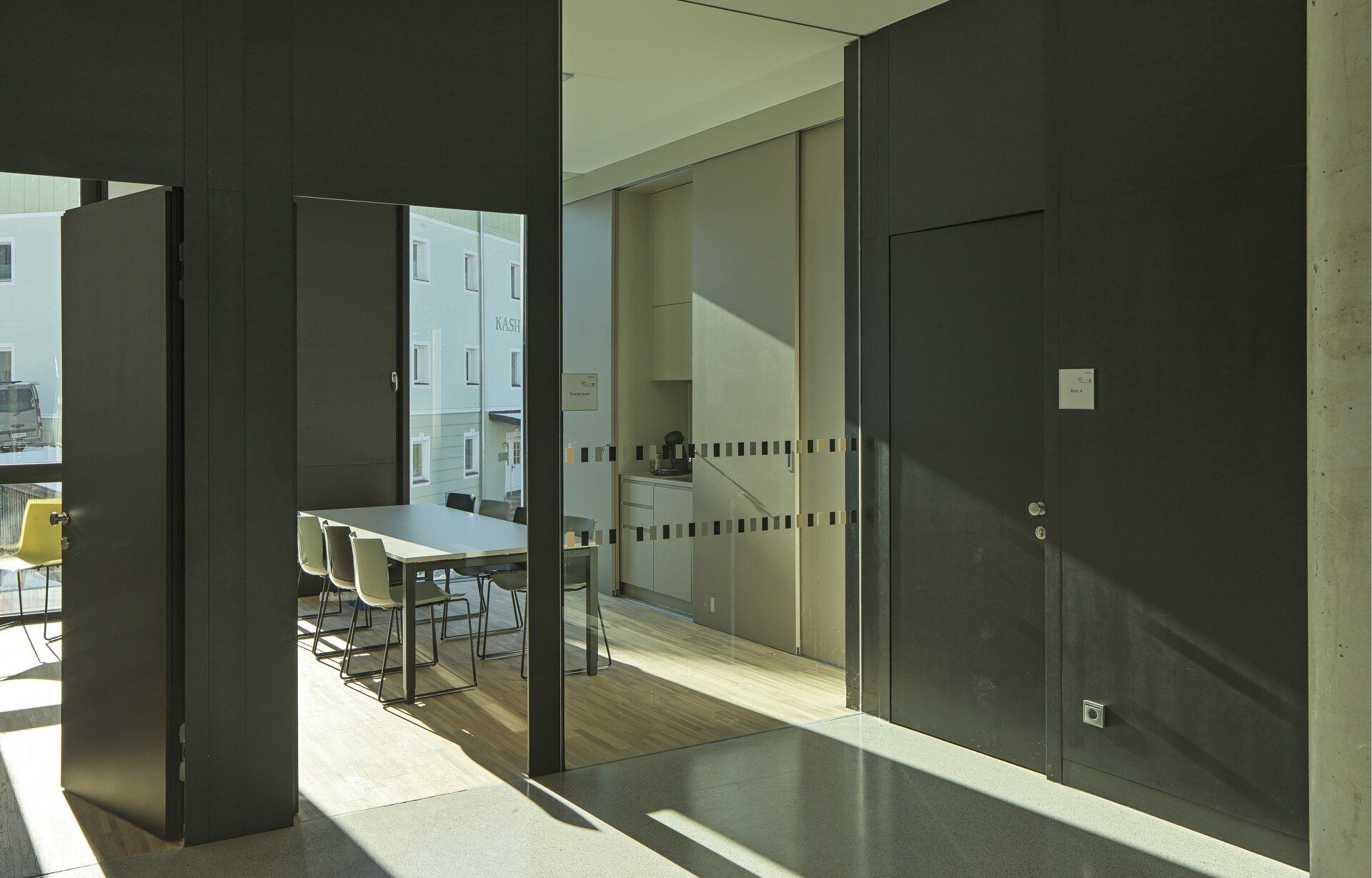 Das zentral zwischen Bahnhof und Ortszentrum gelegene Planungsgebiet für den Neubau befindet sich in einem Bereich, für den ein 2013 erarbeiteter Masterplan ein „grünes Band“ als Entwicklungsachse des Ortes vorsieht. Sabine Penz und Kurt Rumplmayr versuchen mit ihrem aus einem geladenen Wettbewerb hervorgegangenen Konzept diese städtebaulichen Überlegungen in hohem Maße umzusetzen. Sie situieren einen kompakten, viergeschoßigen Baukörper am nordöstlichen Teil des Bauplatzes, womit möglichst viel parkähnliche Flächen erhalten bleiben. In Hinblick auf die umgebende Bebauung und die städtische Lage entwickelten sie eine Fassade aus Fertigteil-Thermowänden, die zum einen eine kurze Bauzeit ermöglichten, zum anderen dem Baukörper seine spezifische Form im Wechsel von geschlossenen und offenen Fassadenteilen verleihen. (Text: Claudia Wedekind)