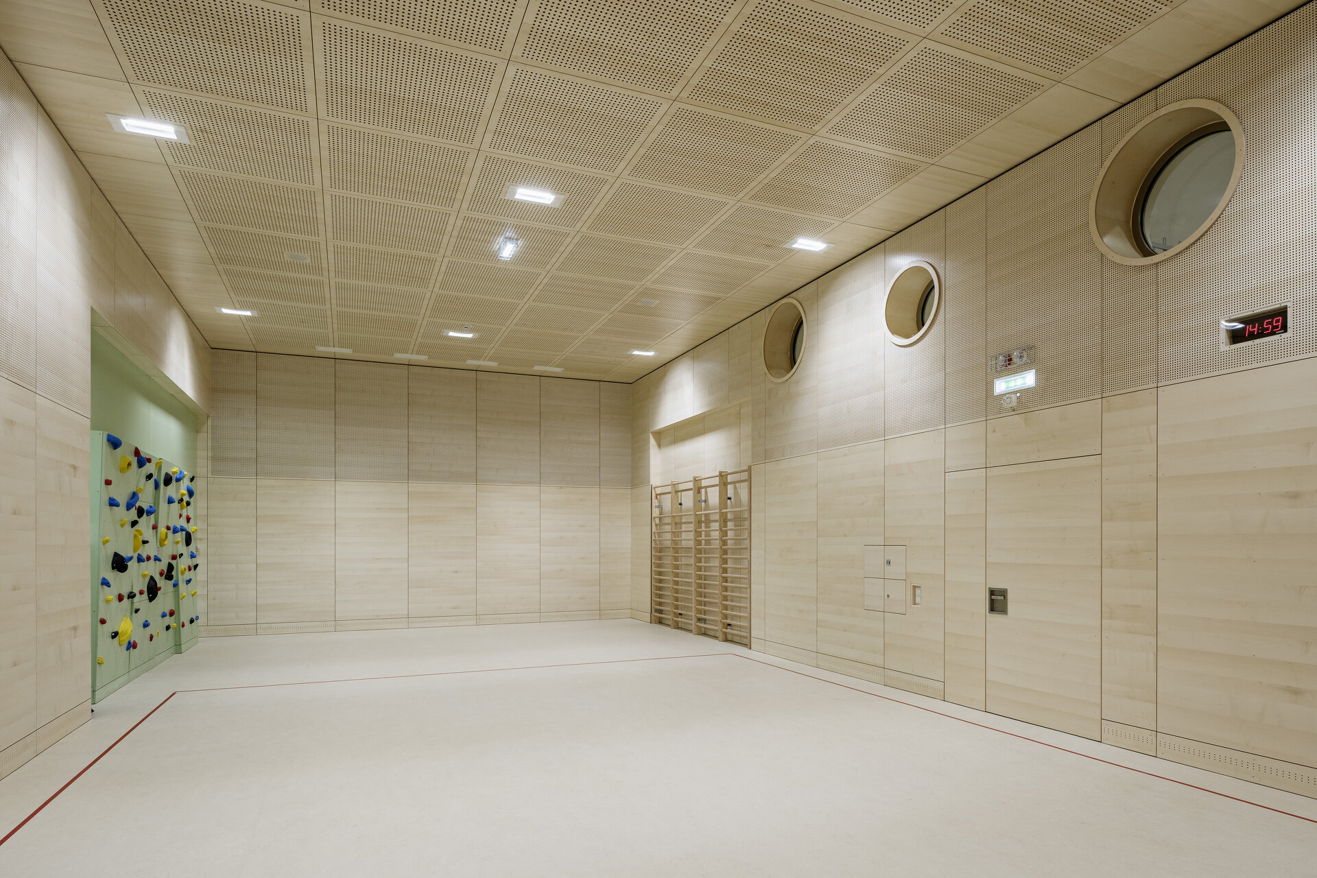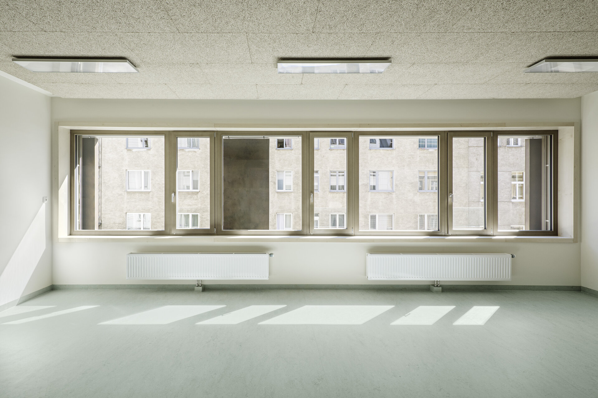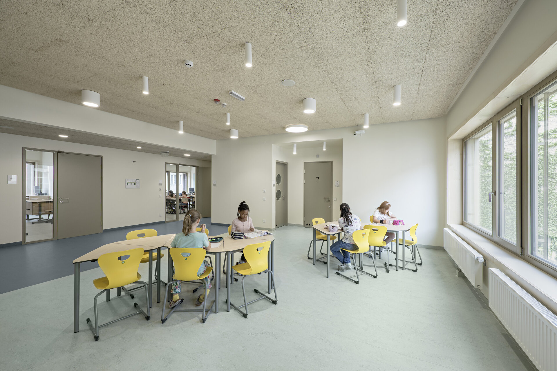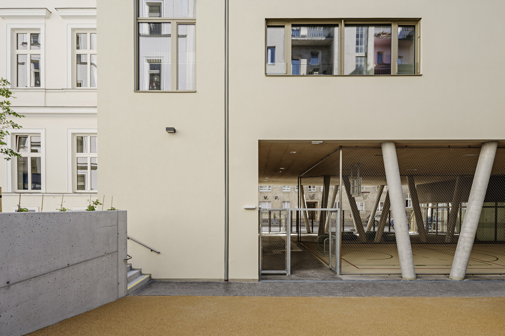 Die Innenräume haben mit natürlichem Licht und den Querlüftungsmöglichkeiten hohen Komfort. Das Farbkonzept mit Grün- und Blautönen schafft eine helle, angenehme Atmosphäre, auch auf kindgerechte Details wurde Wert gelegt: Ein Grafiker gestaltete die figurativen Muster auf den Glasflächen. Kompakte Grundrisse mit Mulitfunktionszonen im Verbindungsbereich zwischen der alten und der neuen Schule, stellen weitere Qualitäten dar. Die Straßenfassade ist mit kleinformatigen Faserbetonplatten in hellem Graubeige verkleidet, als Gestaltungselemente wirken die vorpatinierten Messingplatten vor den Fensterbändern. (Text: Architekt:innen, bearbeitet)