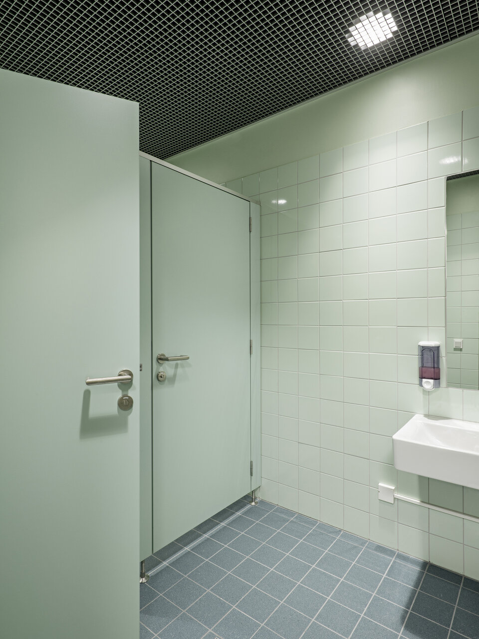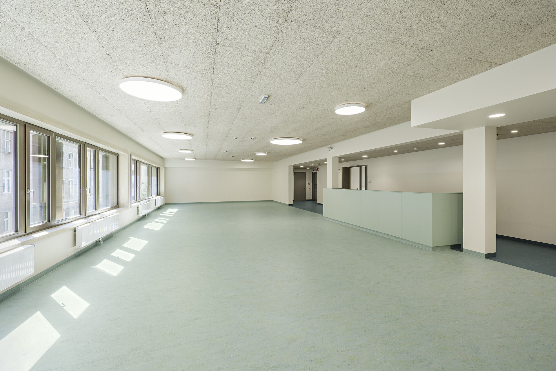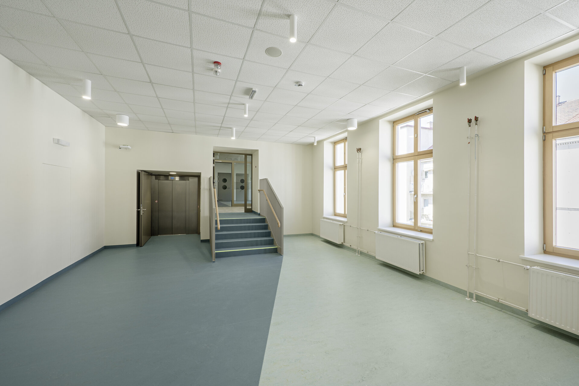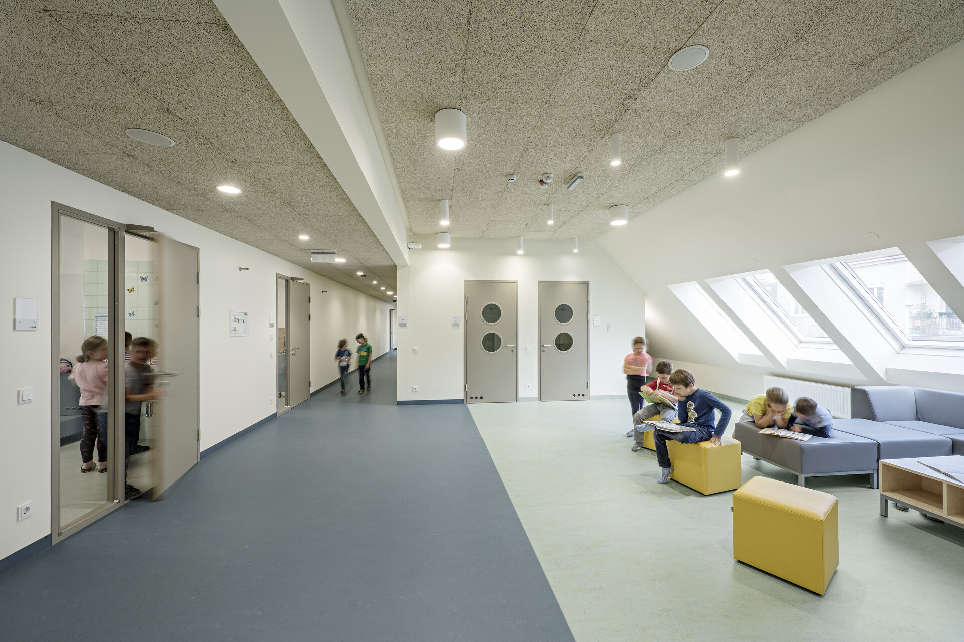 Die Innenräume haben mit natürlichem Licht und den Querlüftungsmöglichkeiten hohen Komfort. Das Farbkonzept mit Grün- und Blautönen schafft eine helle, angenehme Atmosphäre, auch auf kindgerechte Details wurde Wert gelegt: Ein Grafiker gestaltete die figurativen Muster auf den Glasflächen. Kompakte Grundrisse mit Mulitfunktionszonen im Verbindungsbereich zwischen der alten und der neuen Schule, stellen weitere Qualitäten dar. Die Straßenfassade ist mit kleinformatigen Faserbetonplatten in hellem Graubeige verkleidet, als Gestaltungselemente wirken die vorpatinierten Messingplatten vor den Fensterbändern. (Text: Architekt:innen, bearbeitet)