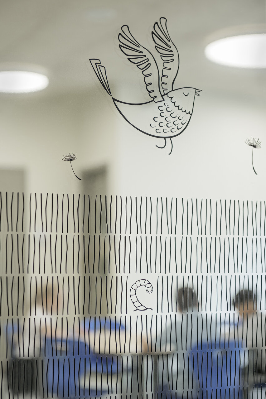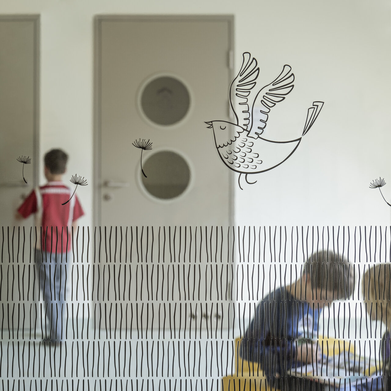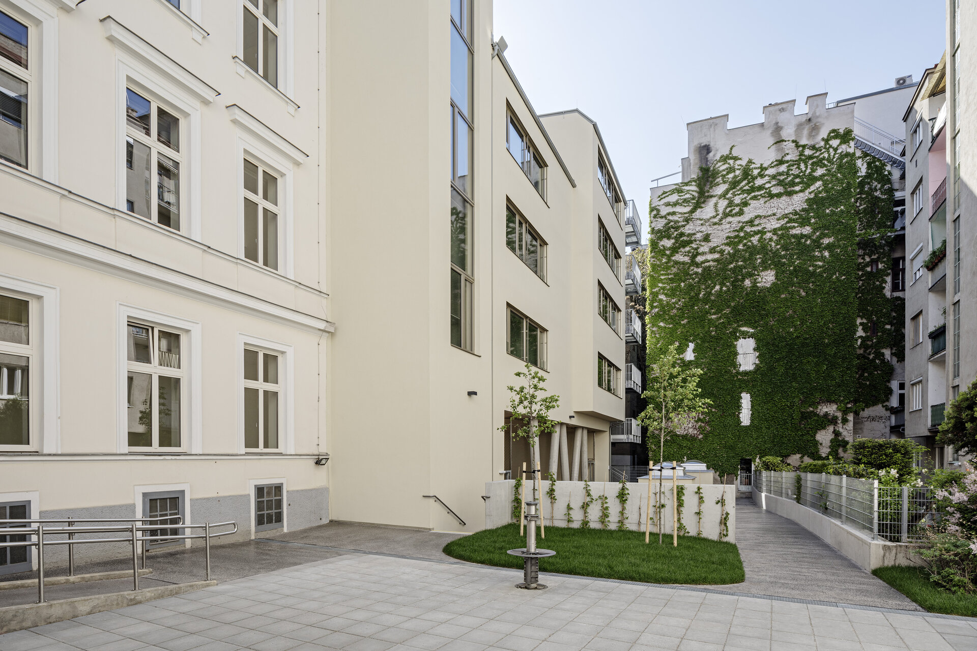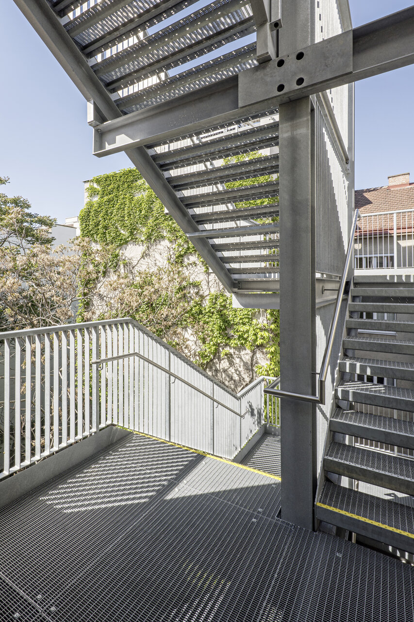Die Innenräume haben mit natürlichem Licht und den Querlüftungsmöglichkeiten hohen Komfort. Das Farbkonzept mit Grün- und Blautönen schafft eine helle, angenehme Atmosphäre, auch auf kindgerechte Details wurde Wert gelegt: Ein Grafiker gestaltete die figurativen Muster auf den Glasflächen. Kompakte Grundrisse mit Mulitfunktionszonen im Verbindungsbereich zwischen der alten und der neuen Schule, stellen weitere Qualitäten dar. Die Straßenfassade ist mit kleinformatigen Faserbetonplatten in hellem Graubeige verkleidet, als Gestaltungselemente wirken die vorpatinierten Messingplatten vor den Fensterbändern. (Text: Architekt:innen, bearbeitet)