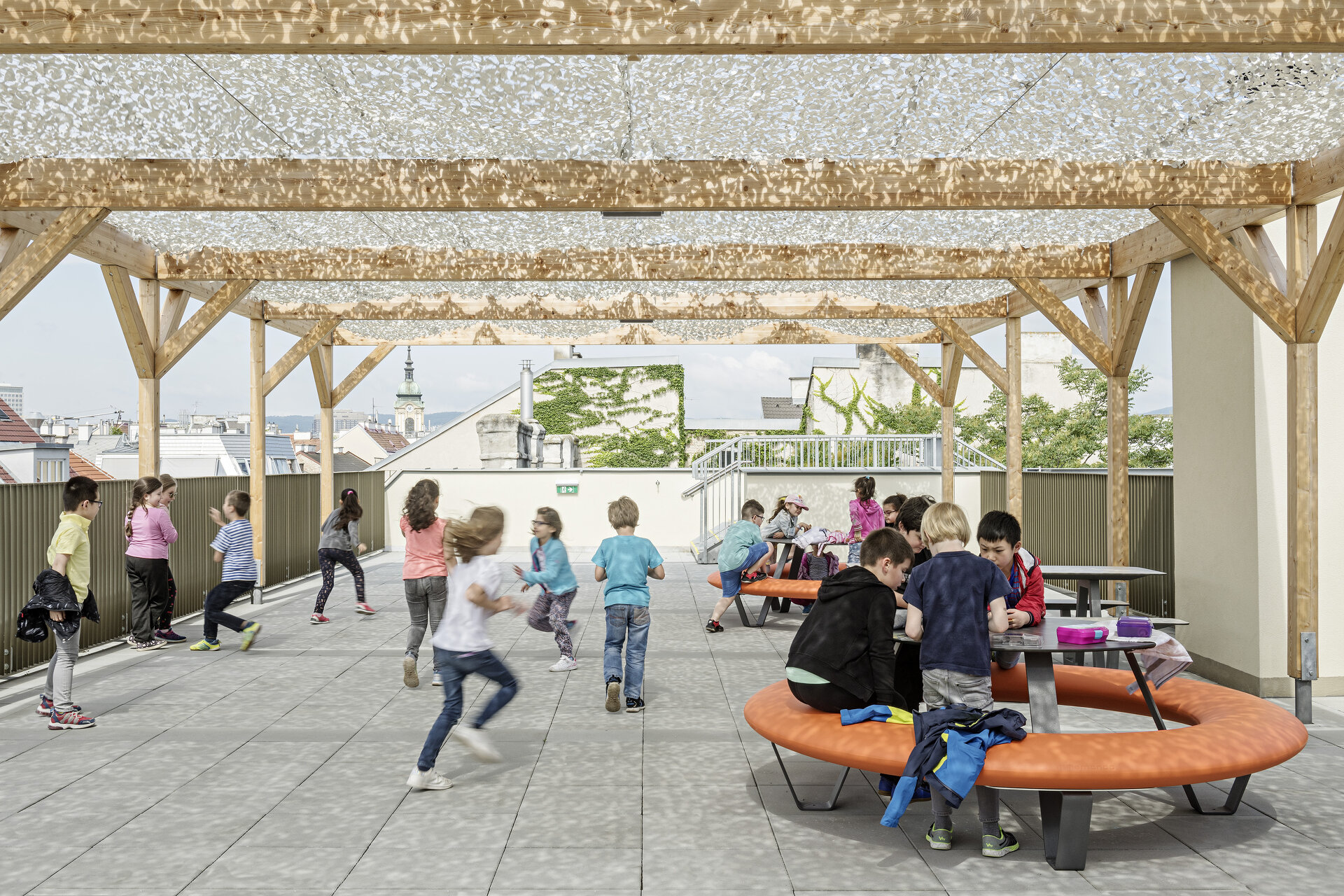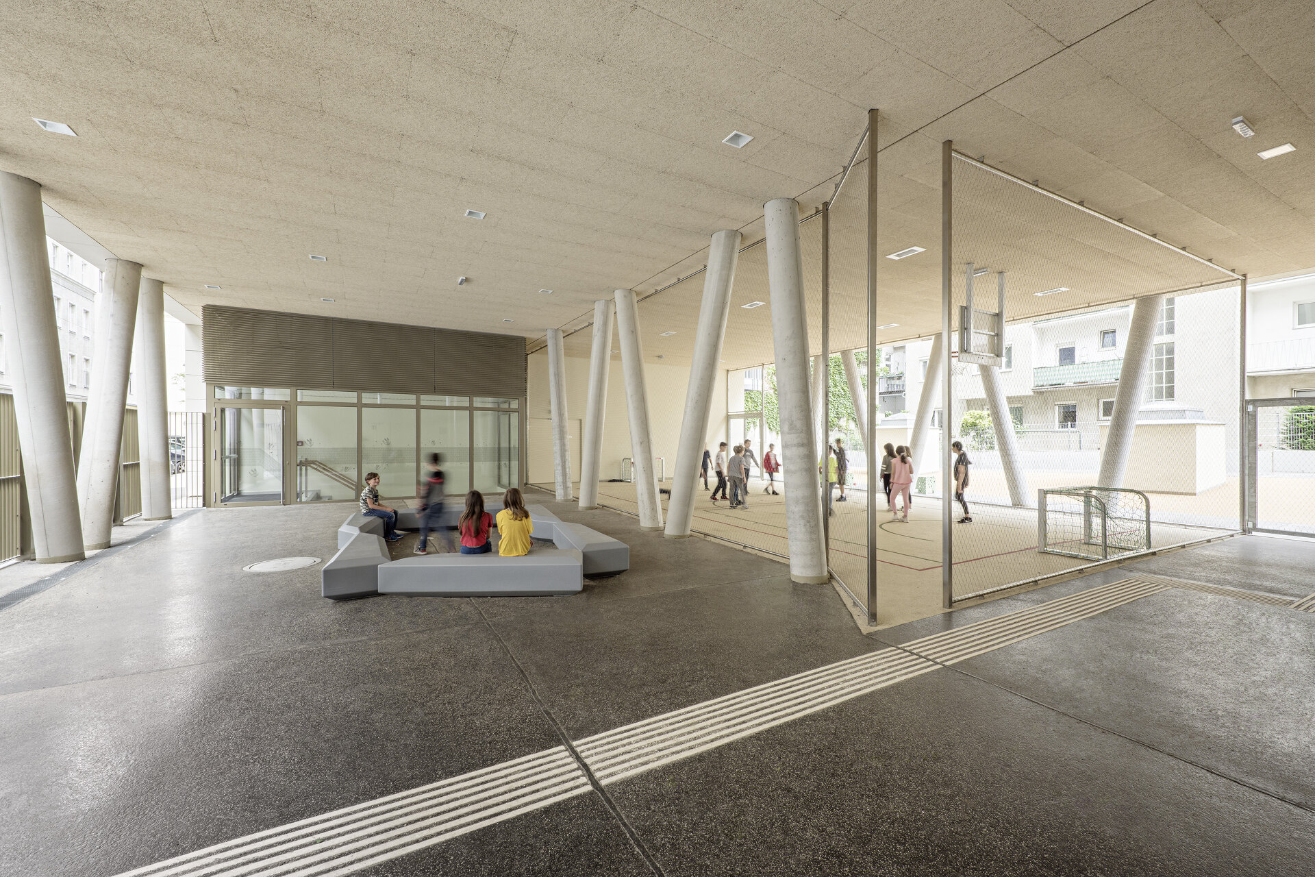 Das Freiraum- und Sportangebot wurde großräumig erweitert. Im Erdgeschoß wird ein überdachter Sportplatz und ein Spiel- bzw. Wartebereich eingerichtet. Der Turnsaal ist im zweiten Untergeschoß angeordnet. Zusätzlich gibt es noch einen Freiraum auf der Dachterrasse mit zusätzlichen Freiklassen. Damit verdoppelt sich das Freiraumangebot der Schule.
